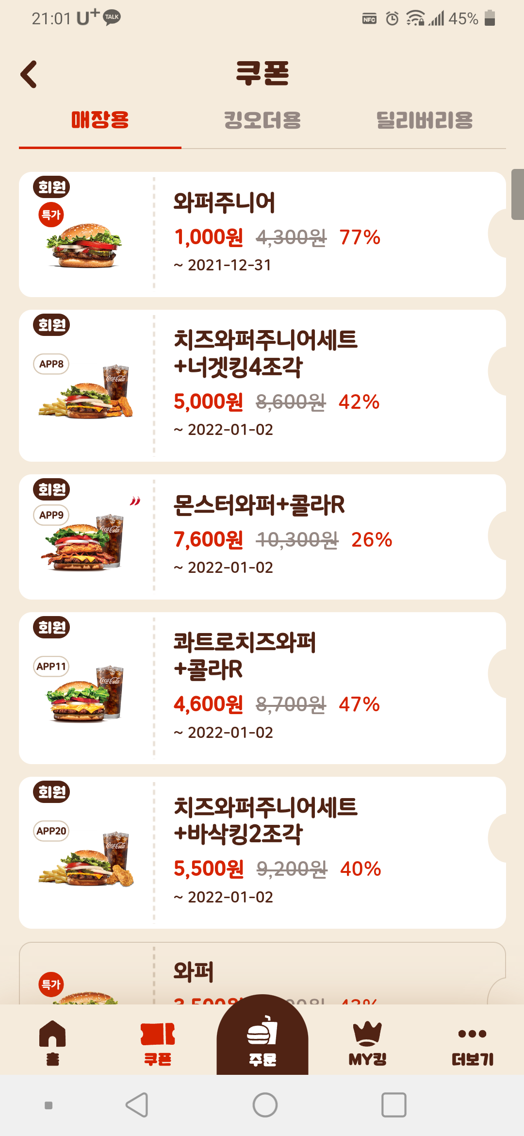 버거킹 매장용 쿠폰들 보시면 아시겠지만 !! 엄청나게 혜자로운 쿠폰들이에요!! 와퍼주니어 1천원, 콰트로치즈와퍼와 콜라조합 4600원등등등.... !! 와퍼를 저렴하게 즐길 수 있는 방법들이 엄청 많아요.