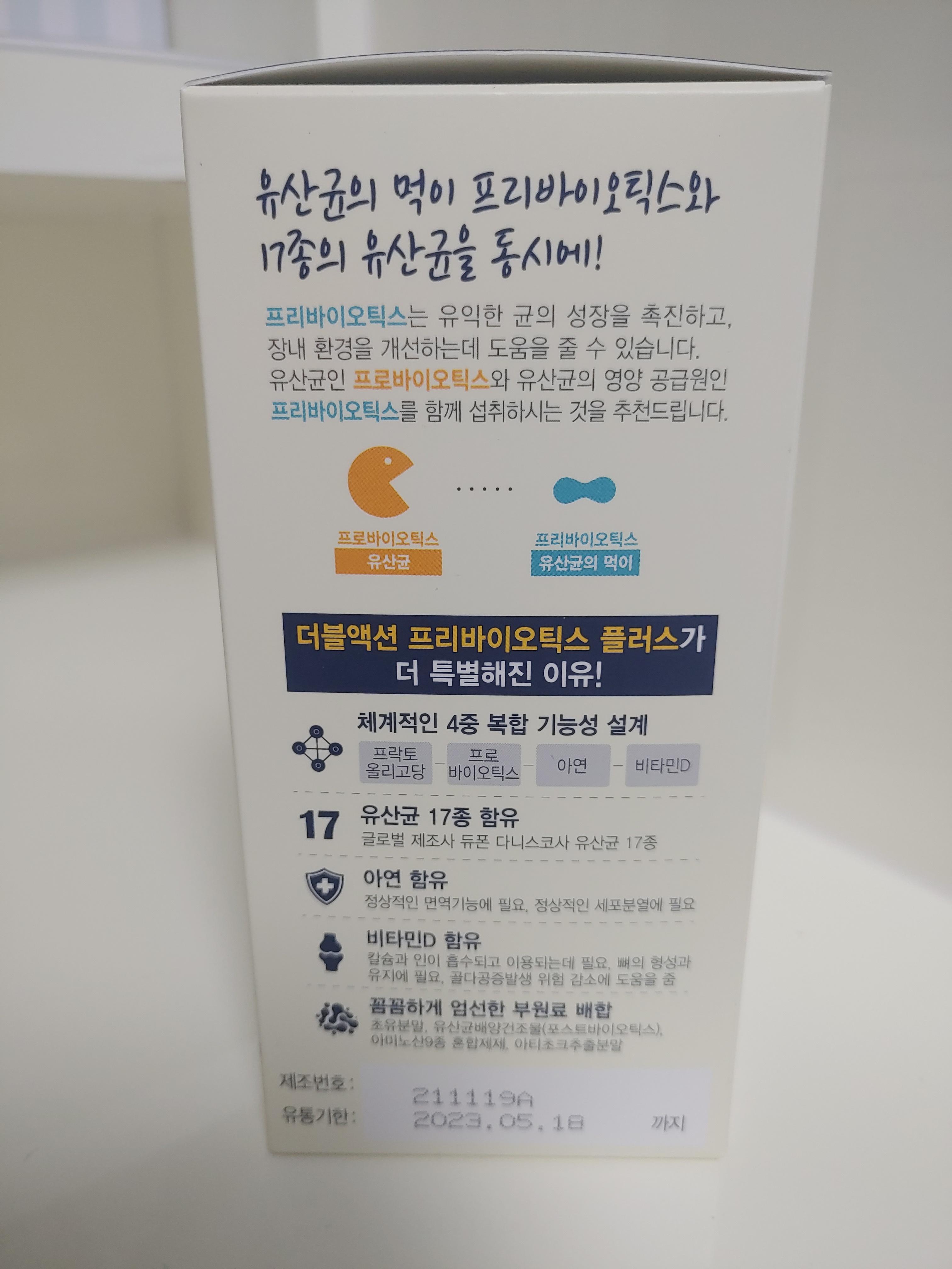 그래도 다른 제품들에 비하면 더블액션 프리바이오틱스 플러스는 기본적인 프로바이오틱스에 더불어서 프락토올리고당, 그리고 아연과 비타민 D가 들어 있더라구요. 면역력과 관련된 아연이 추가되어 있고, 비타민 D도 섭취할 수 있는 부분이기 때문에 조금 더 좋다고 생각은 들기는 했어요.