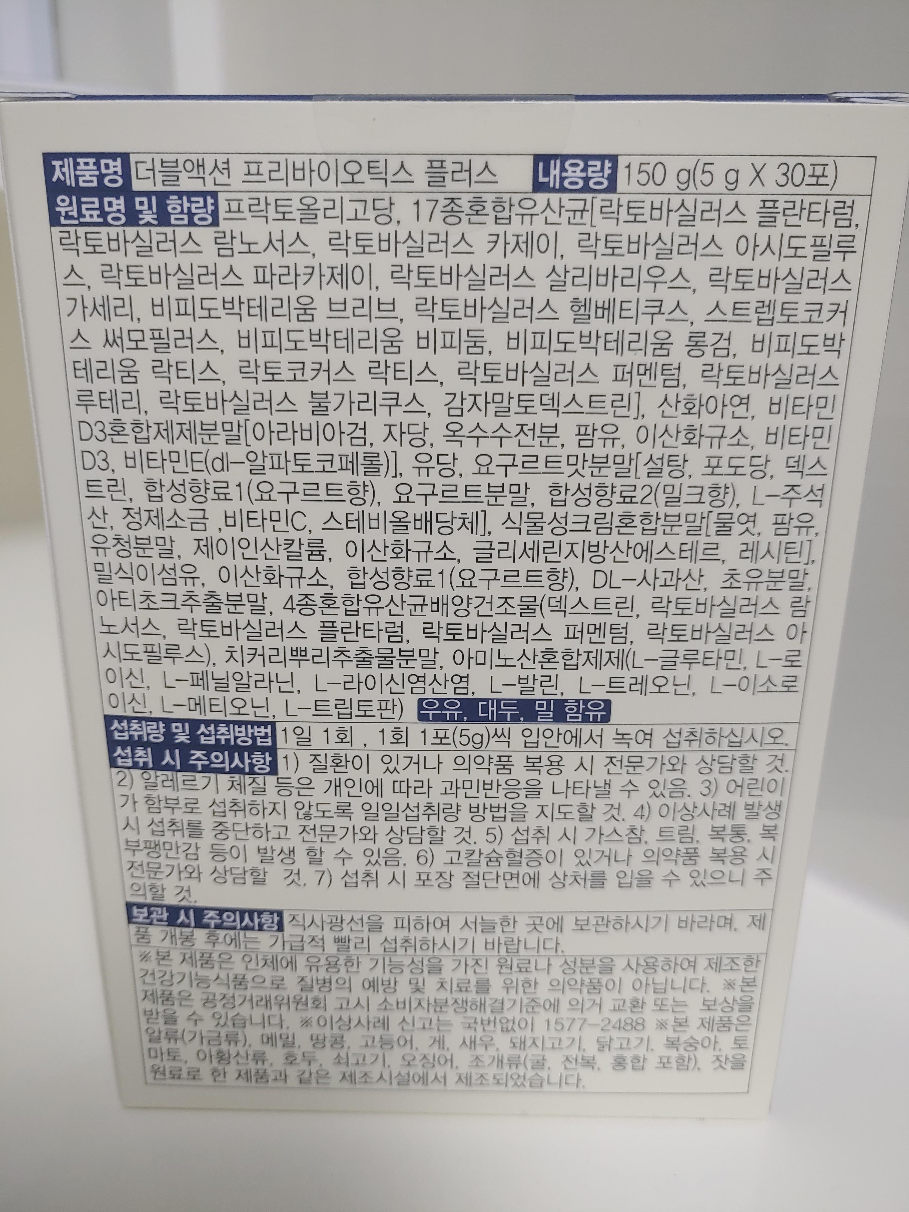 우선 부모님께서는 그런 부분을 보신 것 같고 저는 그냥 락토핏 먹다가 이것도 한번 먹어보면 좋겠지 하고 해서 주문을 해봤구요 ㅎㅎ 원래 락토핏이 가성비가 상당히 좋은데 이 더블액션 프리바이오틱스 플러스는 그정도 까지는 아닌 것 같고, 5g이라서 양도 좀 많이 먹게 되어 있는 편이고, 몇몇 성분이 더 들어 있는 제품인 것 같았어요.