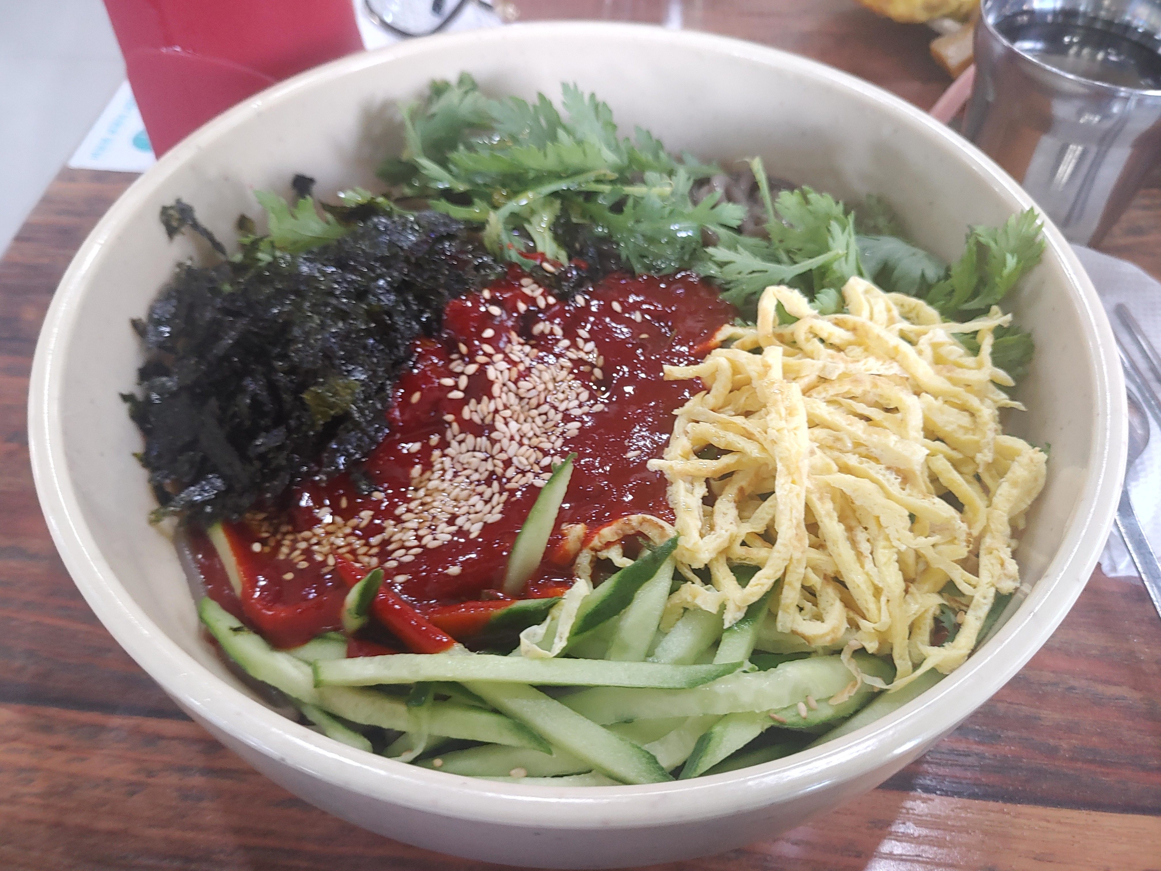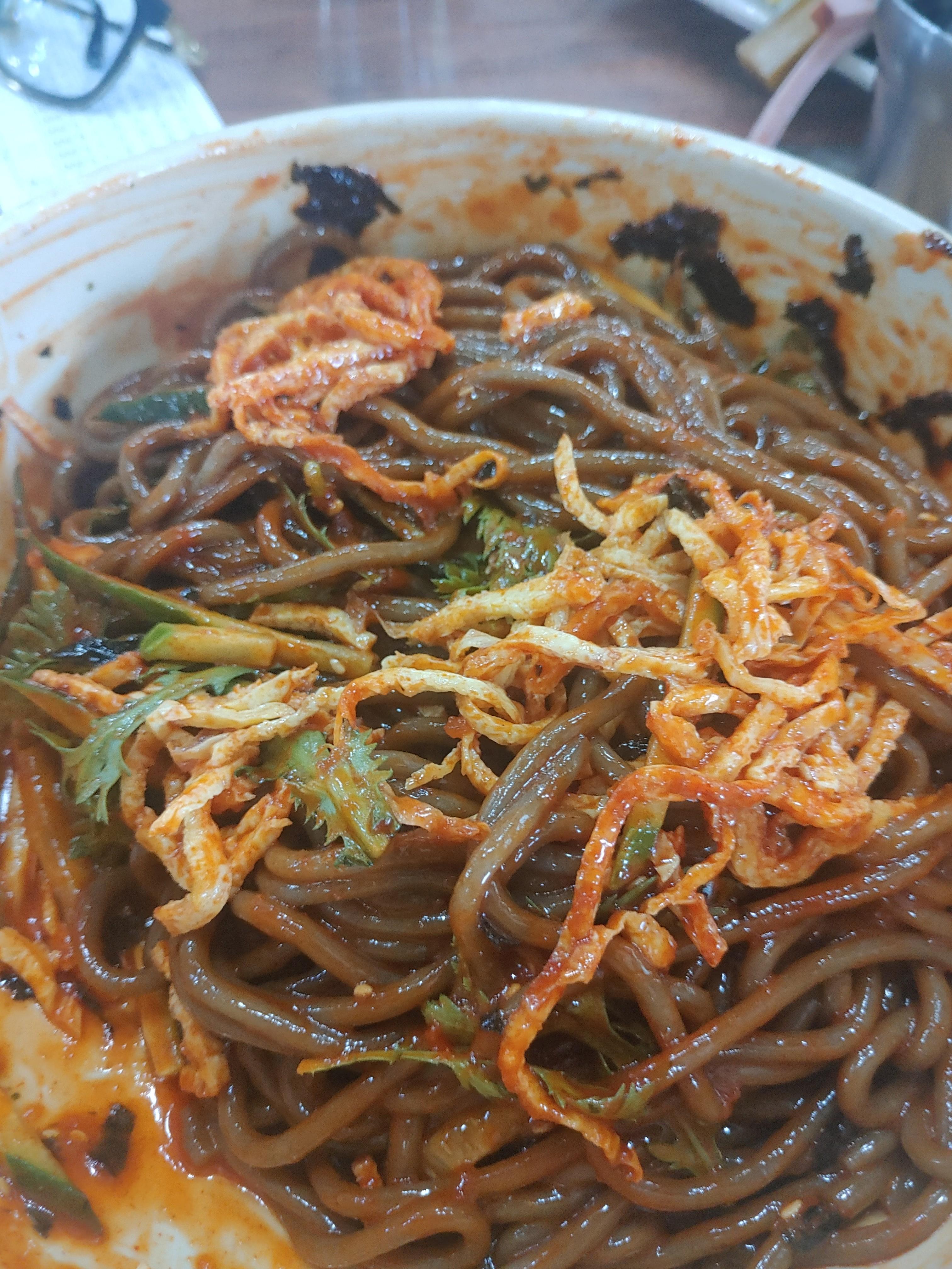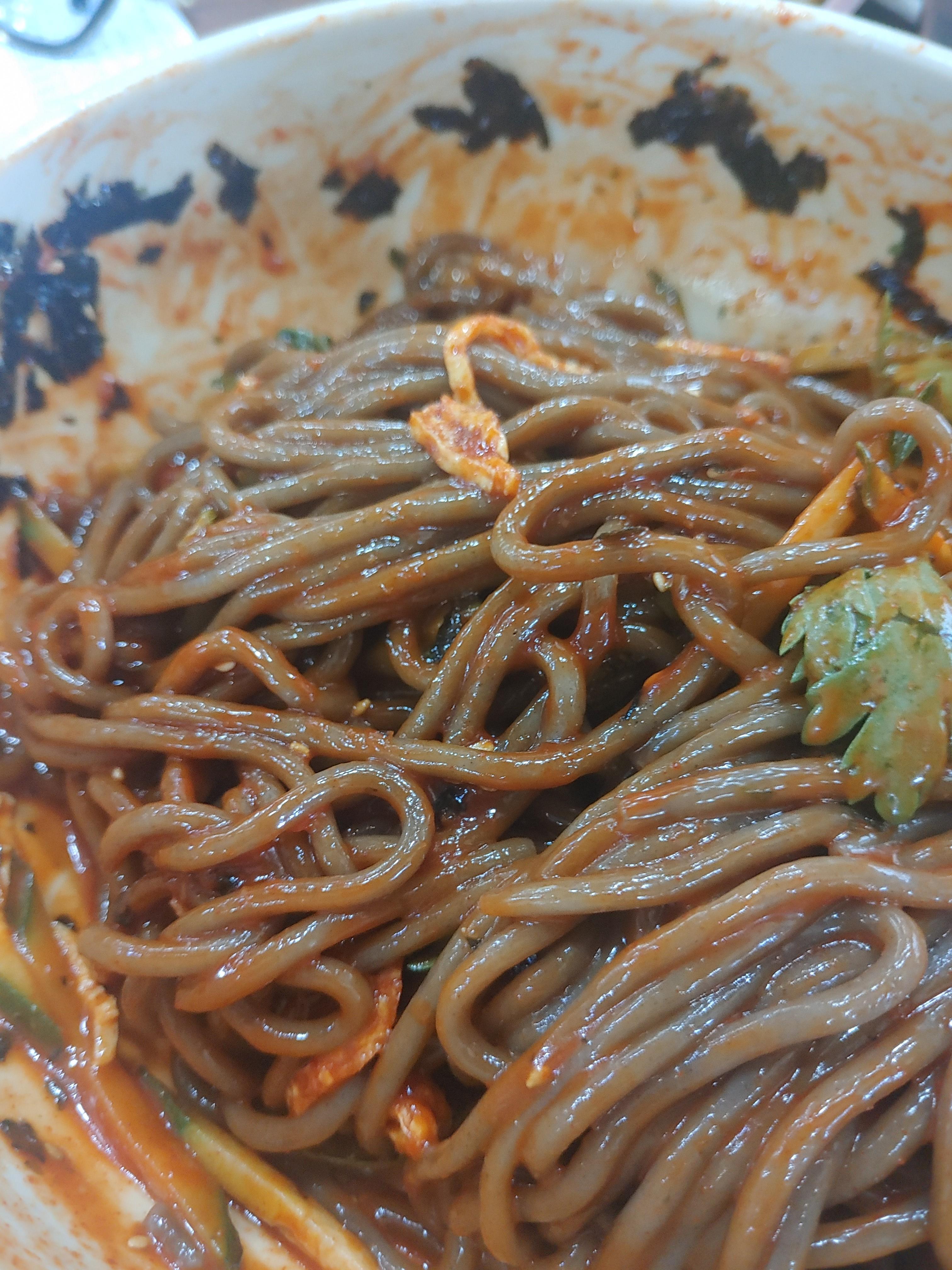 그래도 메밀비빔을 먹을때는 김밥을 시키는 이유가 이 비빔의 양념장과 함께 곁들이면 맛이 꽤 괜찮아지는데요. 약간의 퍽퍽함과 김밥의 맛이 양념과 잘 어울려서 맛있게 배부르게 들어가더라구요 ^^