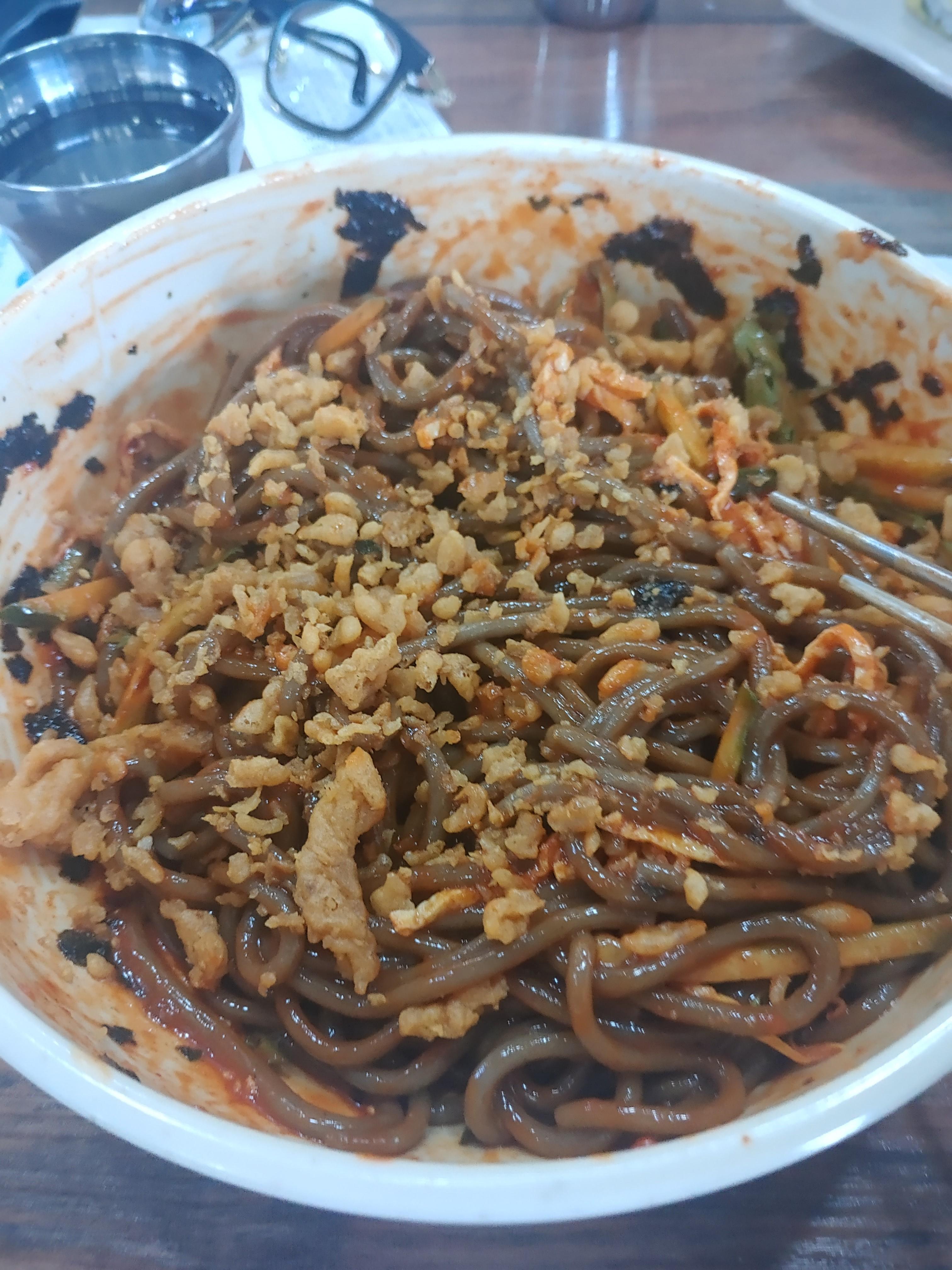 오목골의 비빔메밀은 소스가 굉장히 깔끔한 편이라서 좋구요 ~ 여기에 더 특색있게 먹으려면 아래 사진처럼 우동에 넣었던 저 특유의 튀김을 넣어서 먹으면 정말 신기하게 더 맛있어요. 몰론 튀김은 맛이 없을 수 없는 음식이라는 생각을 하기도 하지만 ㅋ 이 소스자체가 깔끔하고 맛있어서 그런지 이렇게 넣어서 먹으면 특별한 식감에 더 맛이 괜찮더라구요