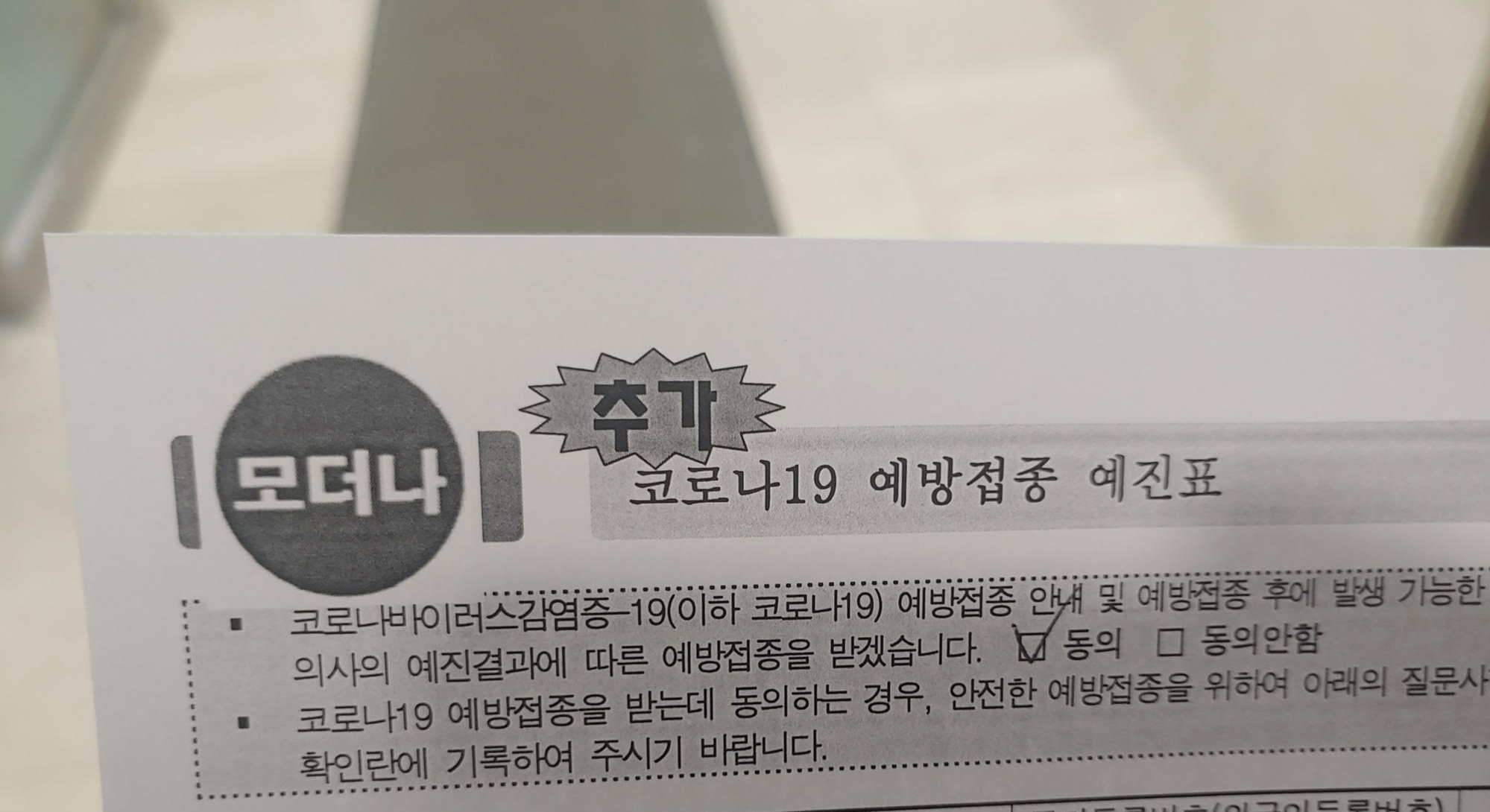 부스터샷 모더나로 접수를 했는데요. 추가라고 써있는 것을 보니 ㅎㅎ 부스터샷이구나 하는 느낌이 있었습니다. 코로나19 예방접종 예진표에는 관련 질병이나 1차 맞았을 때나, 2차 백신 맞았을 때 문제가 있었는지, 지금 먹는 약은 있는지등등을 예진표로 작성을 하는 부분이었구요. 예방접종 동의서 내용으로 위와 같이 동의 한다는 내용을 작성을 해야했습니다. 마지막에 이름쓰고 사인도 하구요 ㅎㅎ.