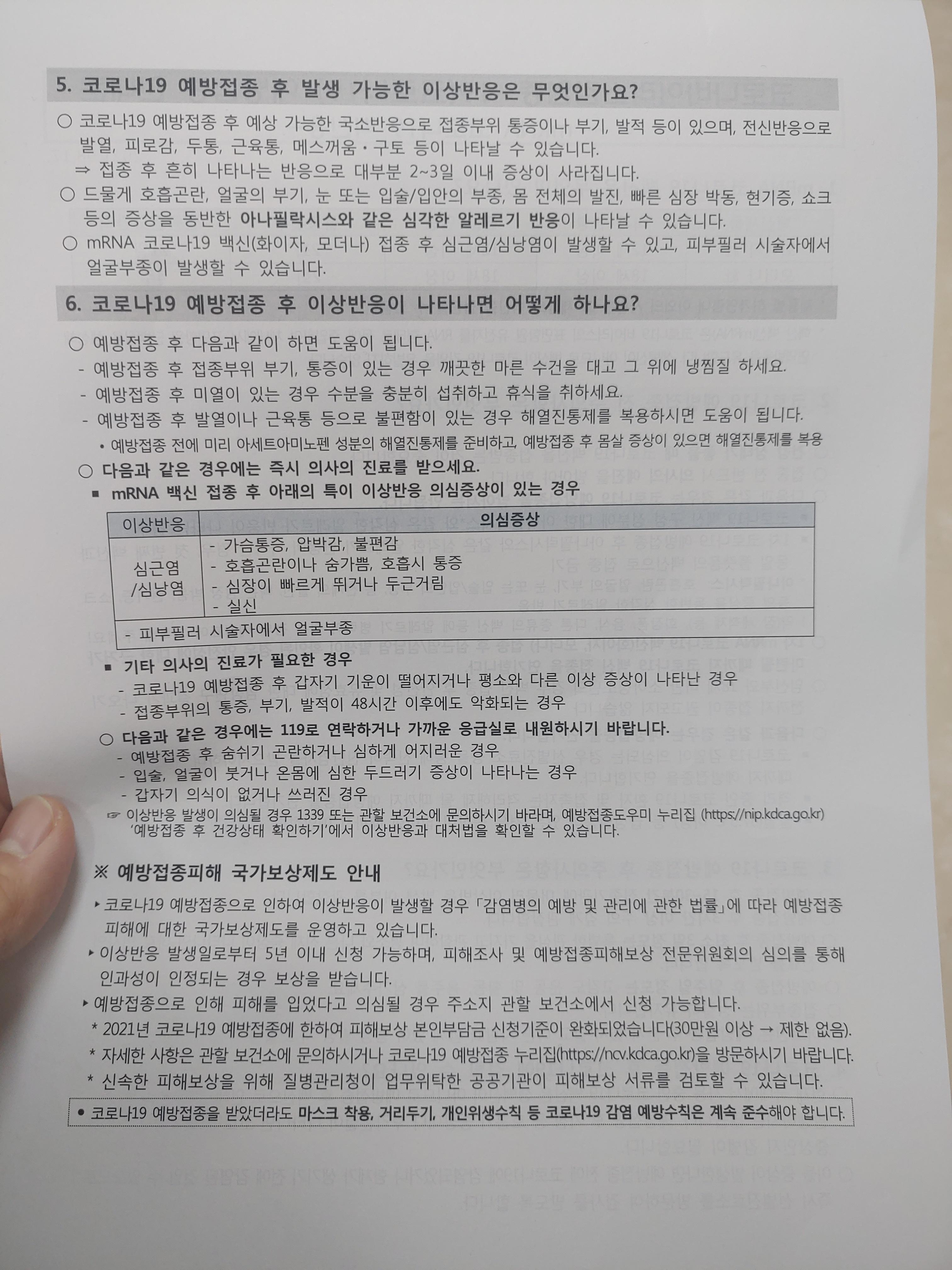 코로나 19 예방접종 안내문에는 주의사항과 이상반응이 발생하는 경우에 내원하도록 안내를 하고 있습니다. 예방접종 국가보상제도도 나와있는데 사실 요새 말이 참 많죠. 여기저기 여러가지 정보들도 있고, 실제로 백신 부작용이 있는 분들도 있어서 사실 저도 좀 두렵기는 했습니다. 그래도 맞기는 맞아야 하는 상황인 것 같아서 백신을 맞기로 하고 맞고왔는데요.