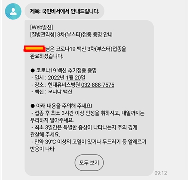 집으로 가는길에 국민비서에서 코로나백신 3차(부스터)접종을 완료하셨습니다. 라는 문자가 들어왔더라구요. 추가접종 증명이 되면서 백신패스도 이제 다시 가능해지도록 변경이 된 것 같습니다. 얀센은 기간이 지나서 이제 백신패스를 쓸 수 없는 상황이었거든요. 여튼 그렇게 되서 이제 마무리가 좀 된 것 같습니다.