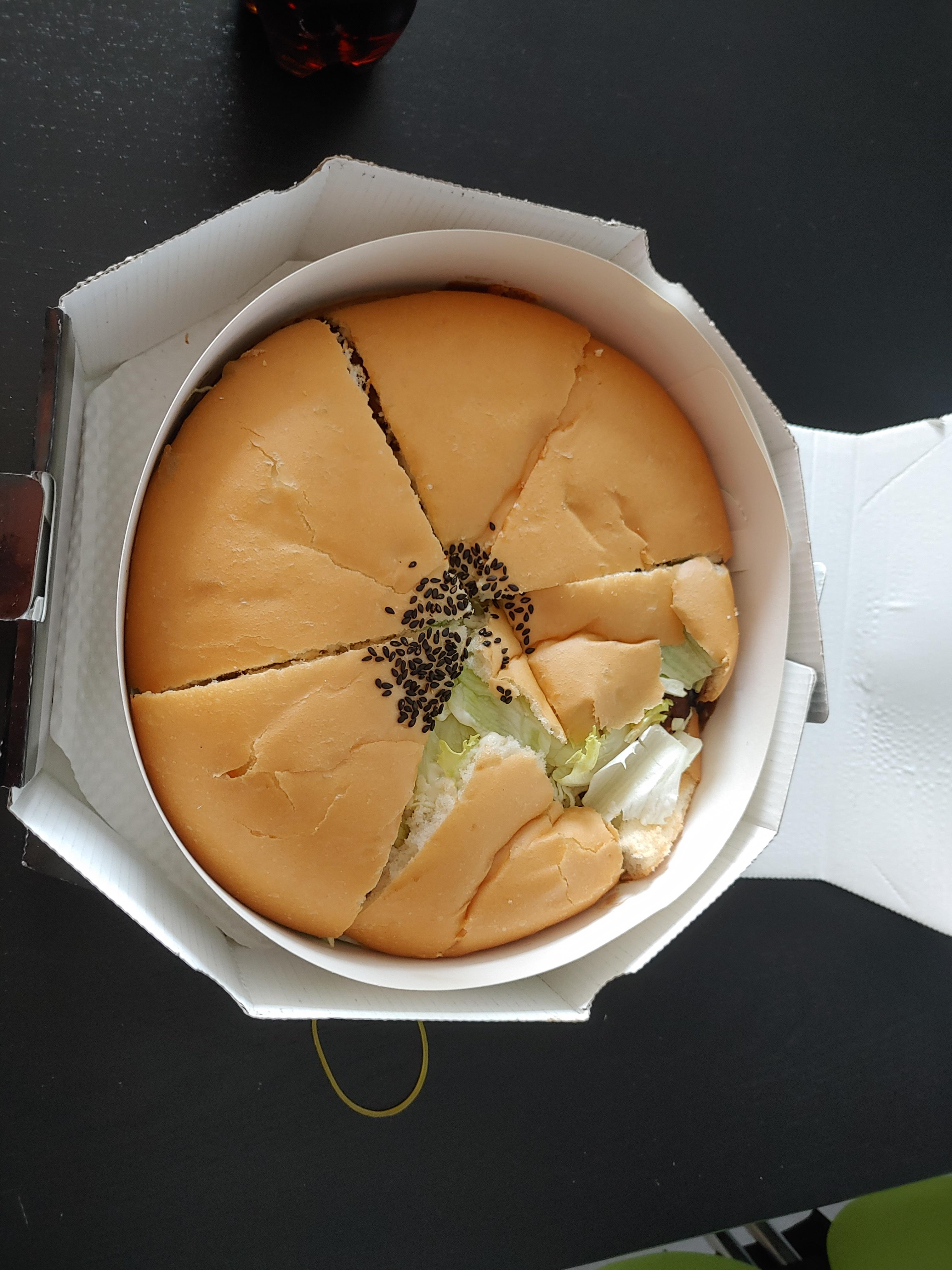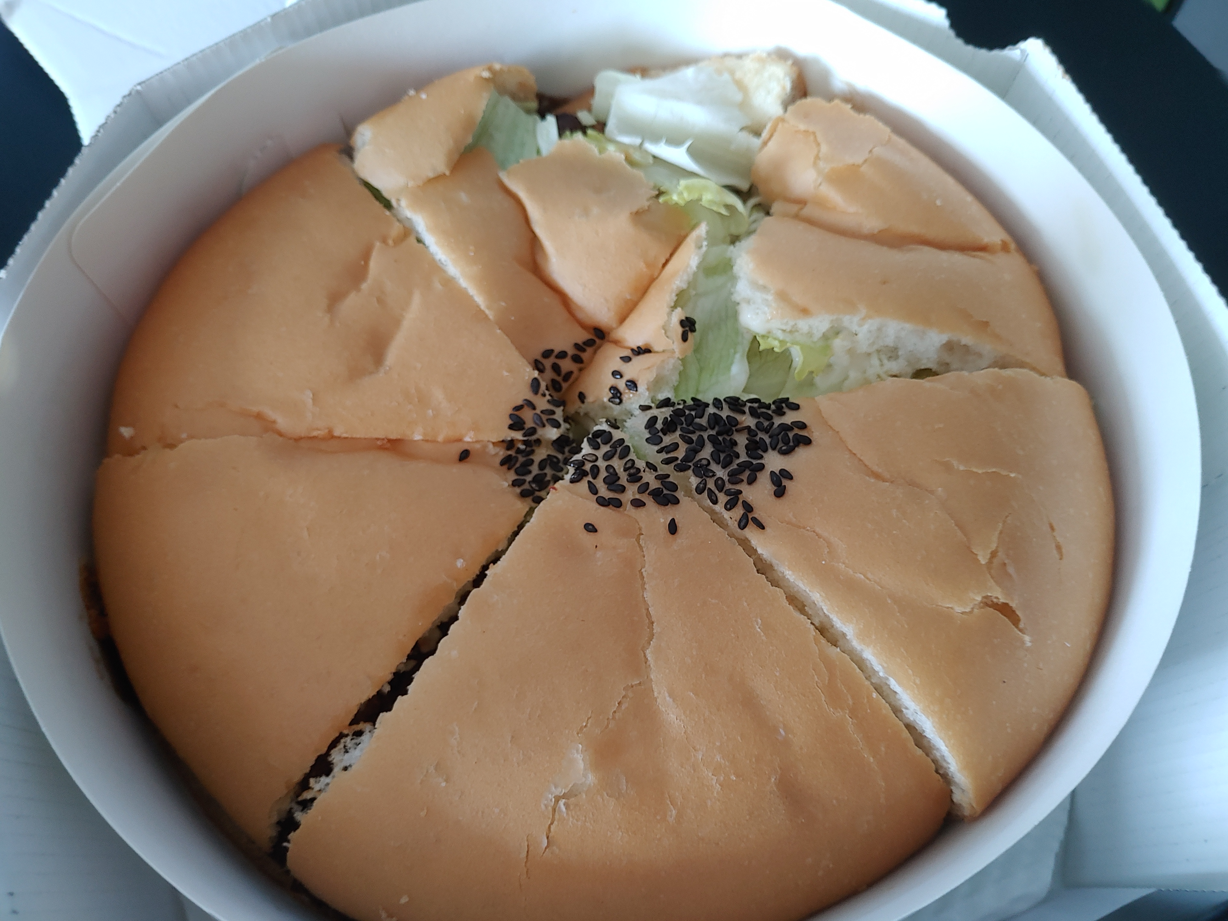 23센치나 되는 대왕 햄버거, 빅버거에요 !! 처음에 딱 열었는데 빵이 좀 부서져서 ㅎㅎ 뭐지 했지만 ^^;; 그래도 6조각으로 잘 나누어져 있는 대왕햄버거를 들어봤는데 양은 상당하더라구요. 패티가 2개라서 그런지 전체적으로 두께감도 좀 있는 편이구요. 수제버거나 요새 버거킹에서 나오는 패티 여러장 이런것들도 좀 생각나기도 하고 그랬습니다.