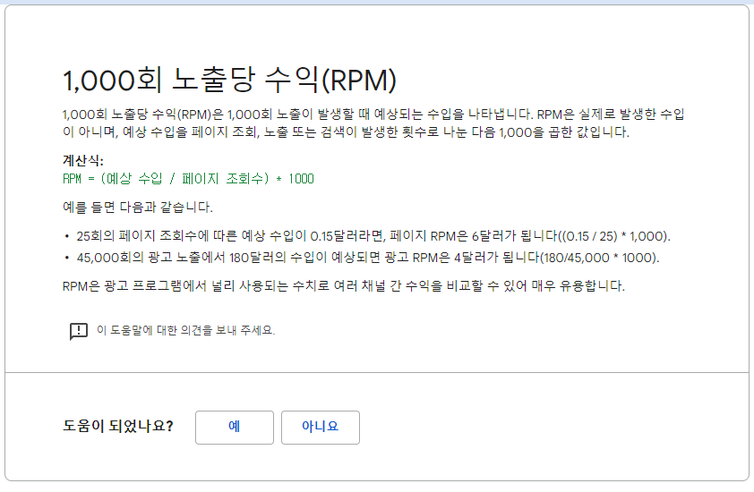 : 1,000회 노출당 수익 (RPM) 은 조회수 1,000 당 예상되는 평균 수익을 이야기 하는 것으로, 실제로 발생한 수입이 아니며, 예상 수입을 페이지 조회, 노출 또는 검색이 발생한 횟수로 나눈 다음 1,000을 곱한 값을 말합니다. 구글 애드센스 고객센터에는 아래와 같이 계산식과 예시를 보여주고 있습니다.