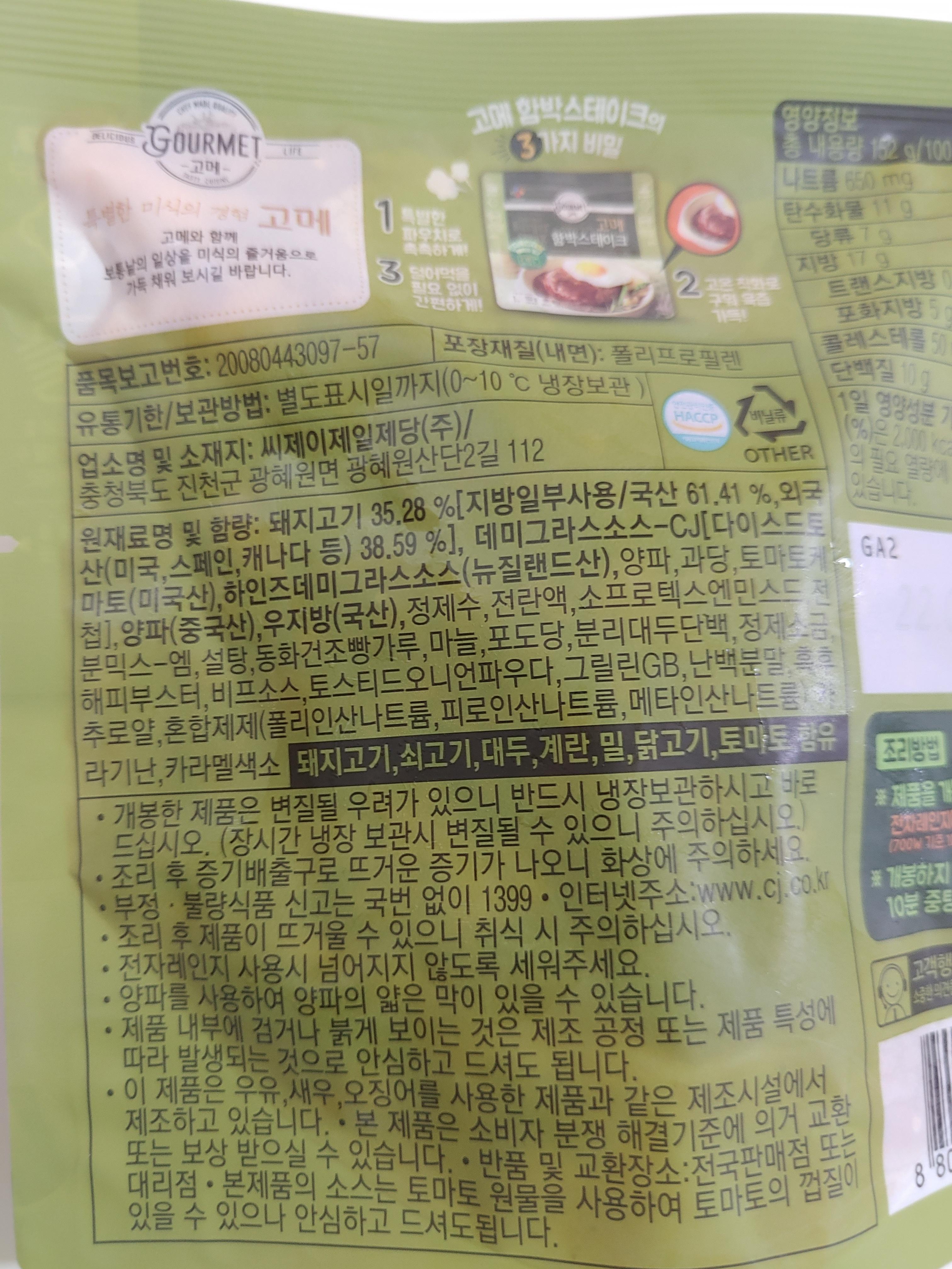 고메 함박스테이크의 재료들은 돼지고기가 35.28% 정도 된다고 나와있구요. 그외에는 데미그라스소스, 하인즈데미그라스소스와 첨가물들이 들어가 있어요.