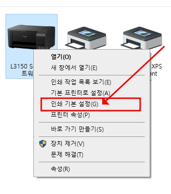우선 제어판을 열어서 장치 및 프린터 보기에서 프린터를 찾아줍니다. 일반 윈도우 10 설정에서는 해당 설정으로 갈 수 없습니다. 제어판을 통해서 윈도우를 찾아야 합니다. 아래 보시는 화면 처럼 인쇄 기본 설정을 찾을 수 있어야 해요.