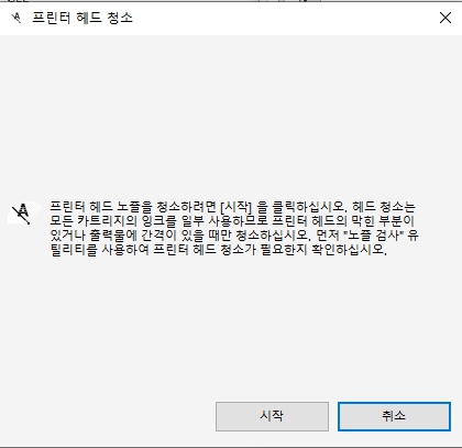 우선 프린터 헤드 청소와 관련해서는 헤드 청소를 할 때 카트리지의 잉크를 일부 사용한다는 점을 알아두셔야 합니다. 따라서 만약 잉크가 부족하다면 어느정도 채워두시는 것이 우선 필요합니다. 이는 퍼지(Purge)라고 하는 프린터 자체 잉크 분사 기능을 활용한 청소를 진행하기 때문인데요. 안내창에도 다음과 같은 안내문에도 해당 내용이 담겨 있는 것을 볼 수 있습니다.