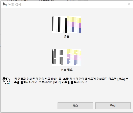 프린터 노즐 청소 파워클리닝은 꽤 시간이 걸리더라구요. 그냥 헤드청소에 비해서 조금 더 시간이 소요되면서 완료되었다는 것과 함께 다시 노즐검사를 진행하였습니다!! 그리고 !! 이렇게 깔끔하게 딱 떨어졌는데요. 이제 완료된 모습을 보실 수 있었습니다.