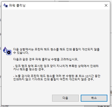 프린터 노즐 청소 파워클리닝은 더 많은 잉크를 사용하여 헤드 청소를 진행하는 방법인데요. 프린터 헤드청소를 해도 인쇄 품질이 개선되지 않는 경우에 진행하도록 안내창의 모습을 볼 수 있습니다. 또한 이 파워클리닝은 아무래도 잉크를 충분히 사용해야 되는 부분이고 프린터에 무리가 갈 수 있는 부분이 있다고 하여, 12시간에 한번 진행을 할 수 있도록 되어 있습니다. 12시간 이전에 다시 수행하려고 하면 경고창이 떠서 수행할 수 없다는 메시지를 보실수도 있습니다.