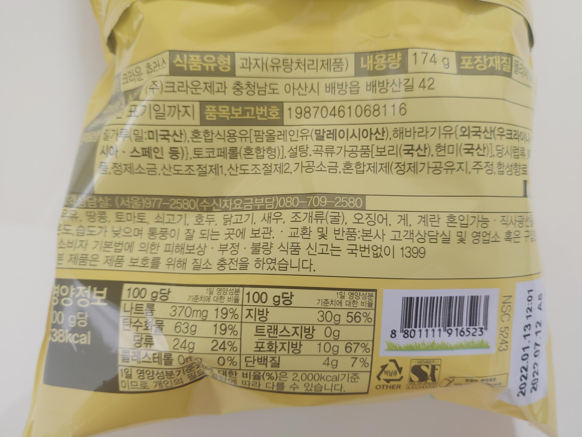 크라운제과에서 나오는 과자이고, 100g당 영양성분과 칼로리를 볼 수 있어요. 174g에는 935kcal정도 하는데요.. 어마무시한 칼로리를 자랑하는 과자이기는 해요.. 아무래도 과자에 설탕도 많이 들어 있고, 밀가루와 만드는 부분에서 칼로리가 꽤 높다는 정도로 봐두시면 좋을 것 같습니다!! 지방의 함량도 엄청 높다는 것을 볼 수 있어요.
