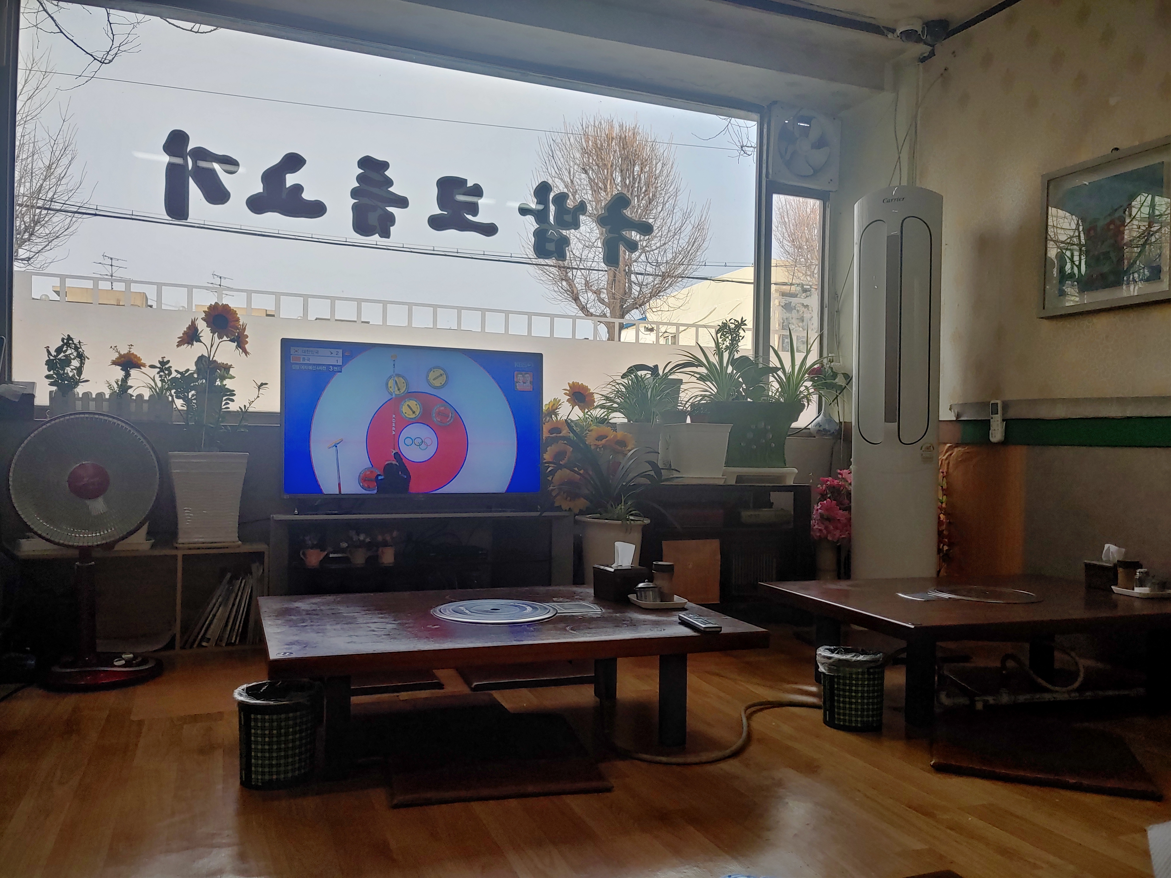 주말에 점심이 조금 끝난 시간이었는데도 사람이 꽤 많으셨는데, 컬링도 하고 있길래 간단하게 사진을 담아봤는데요. 매장 분위기는 좀 오래되기도 해서 그런지 약간 이런 분위기가 좀 있어요. 외부에 의자 테이블도 있는데, 대부분 이렇게 앉아서 먹는 곳이라서 이런 부분도 알아두시면 좋을 것 같네요.