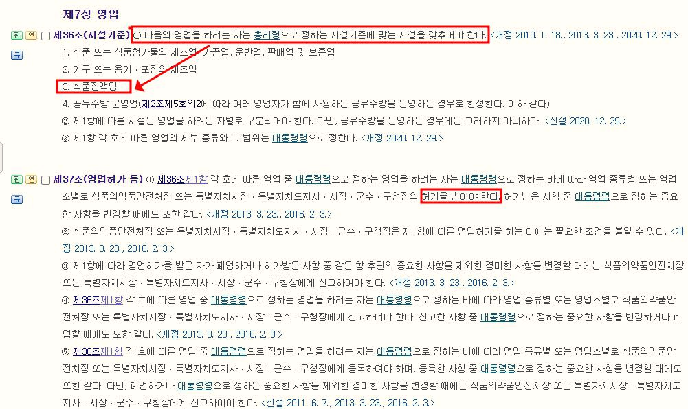 일반음식점(부수적 음주행위의 허용), 휴게음식점, 제과점 영업을 하려고 하는 창업자는 식품위생법 36조(시설기준) 및 동법 37조 (영업의 허가등)에 관한 내용에 따라 시설기준을 갖추고 허가를 받아야 합니다.