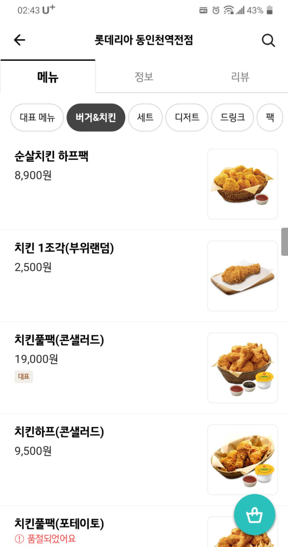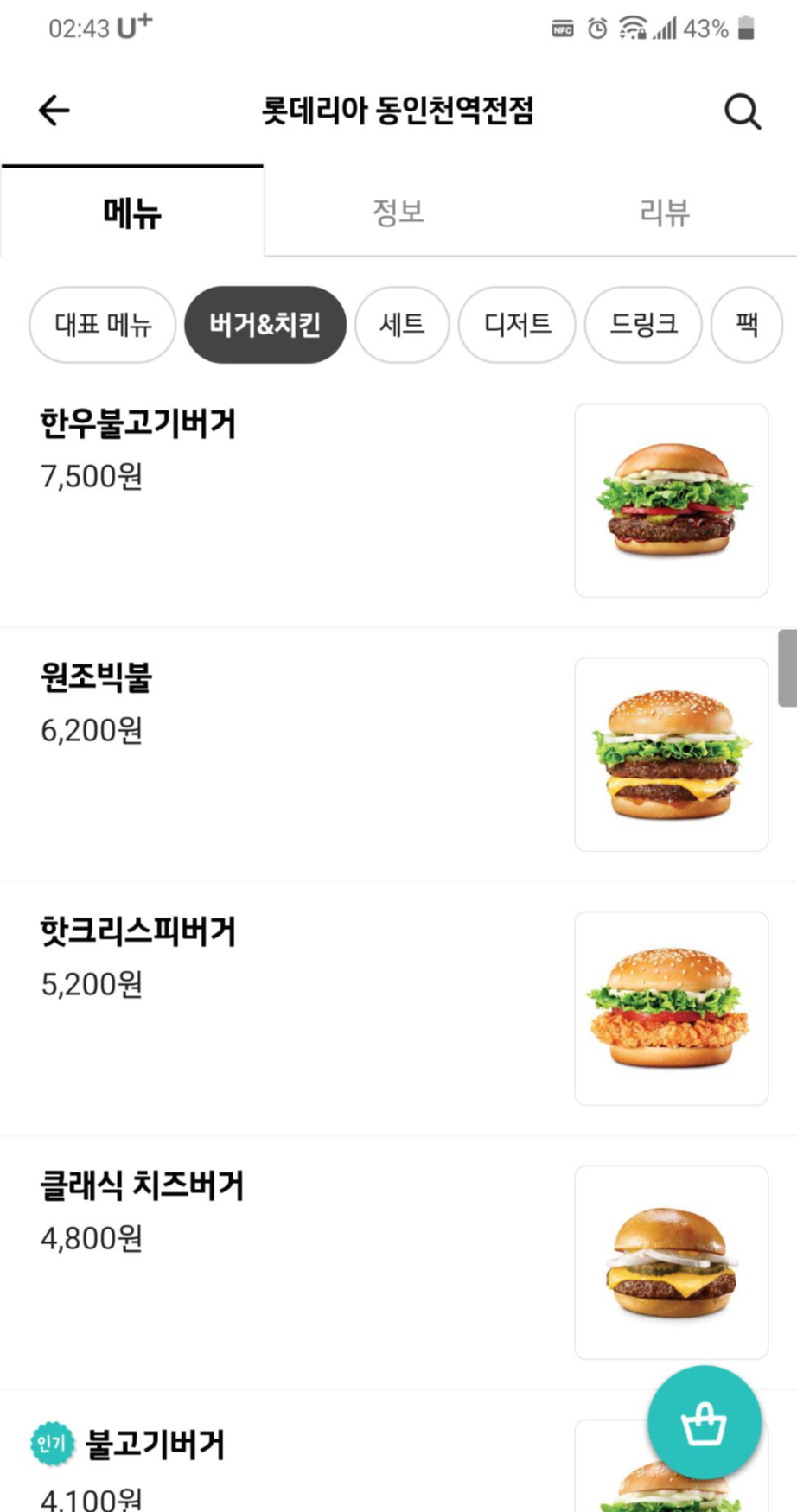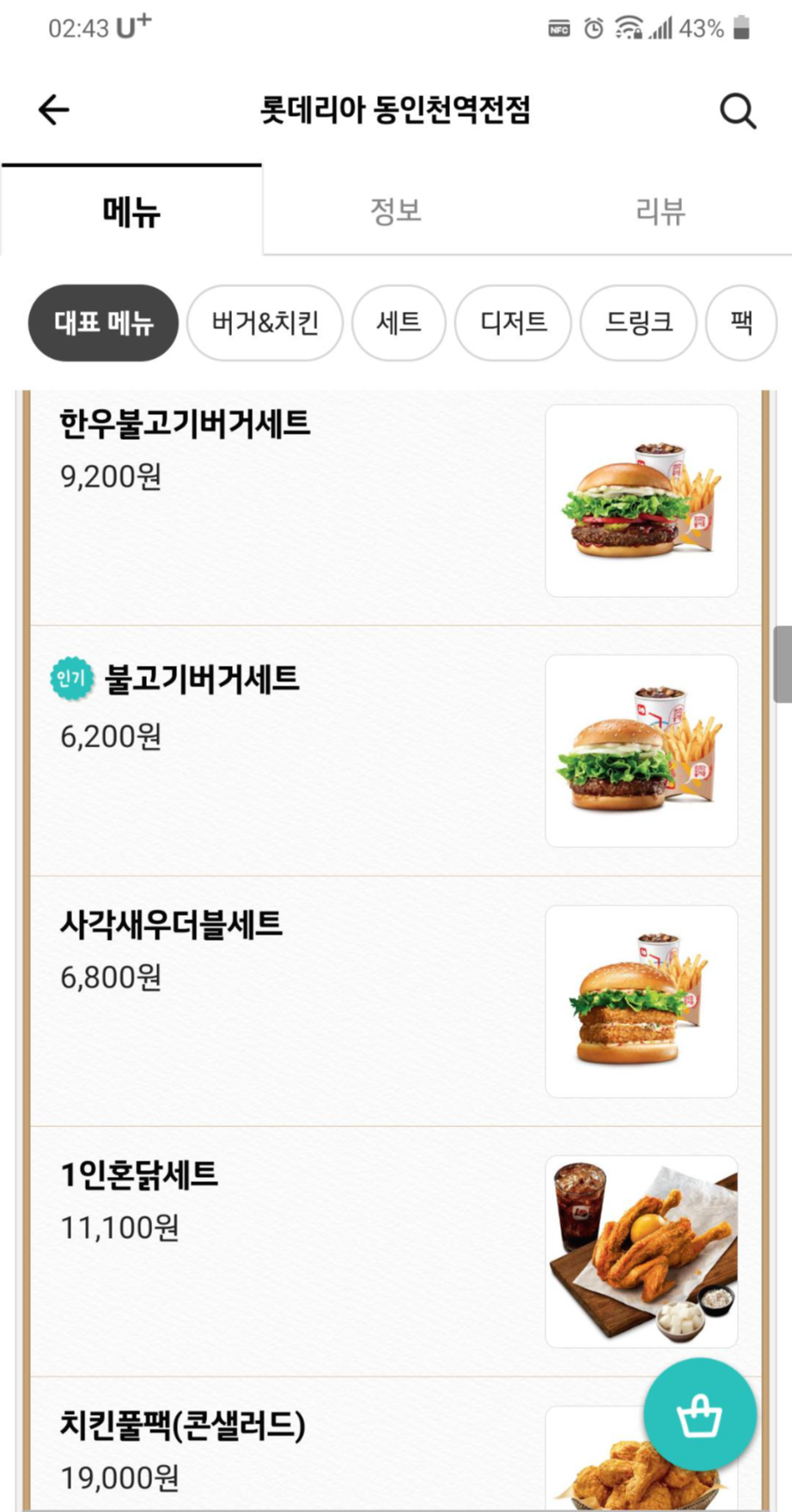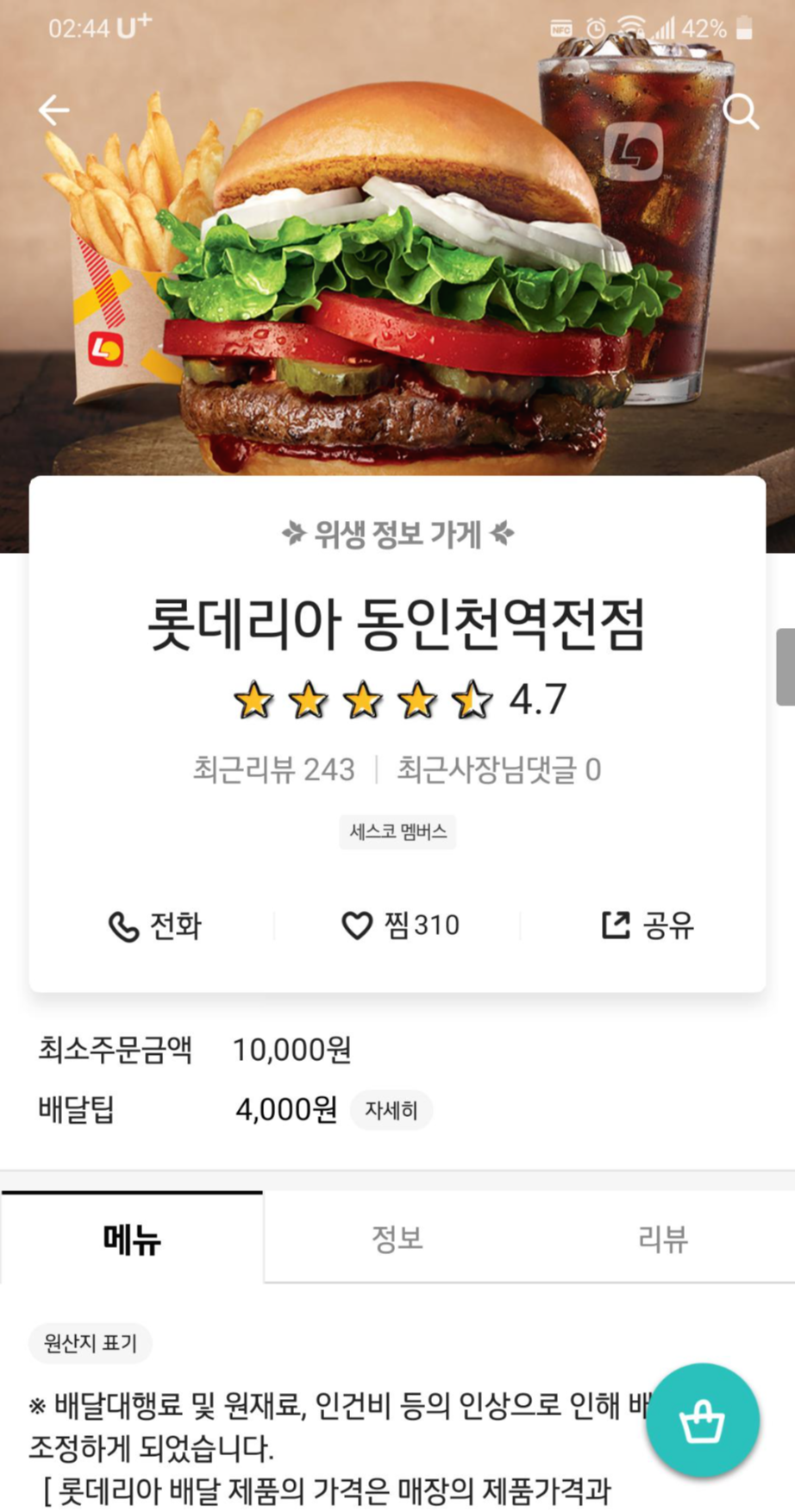 * 배민 동인천 롯데리아 정보와 메뉴