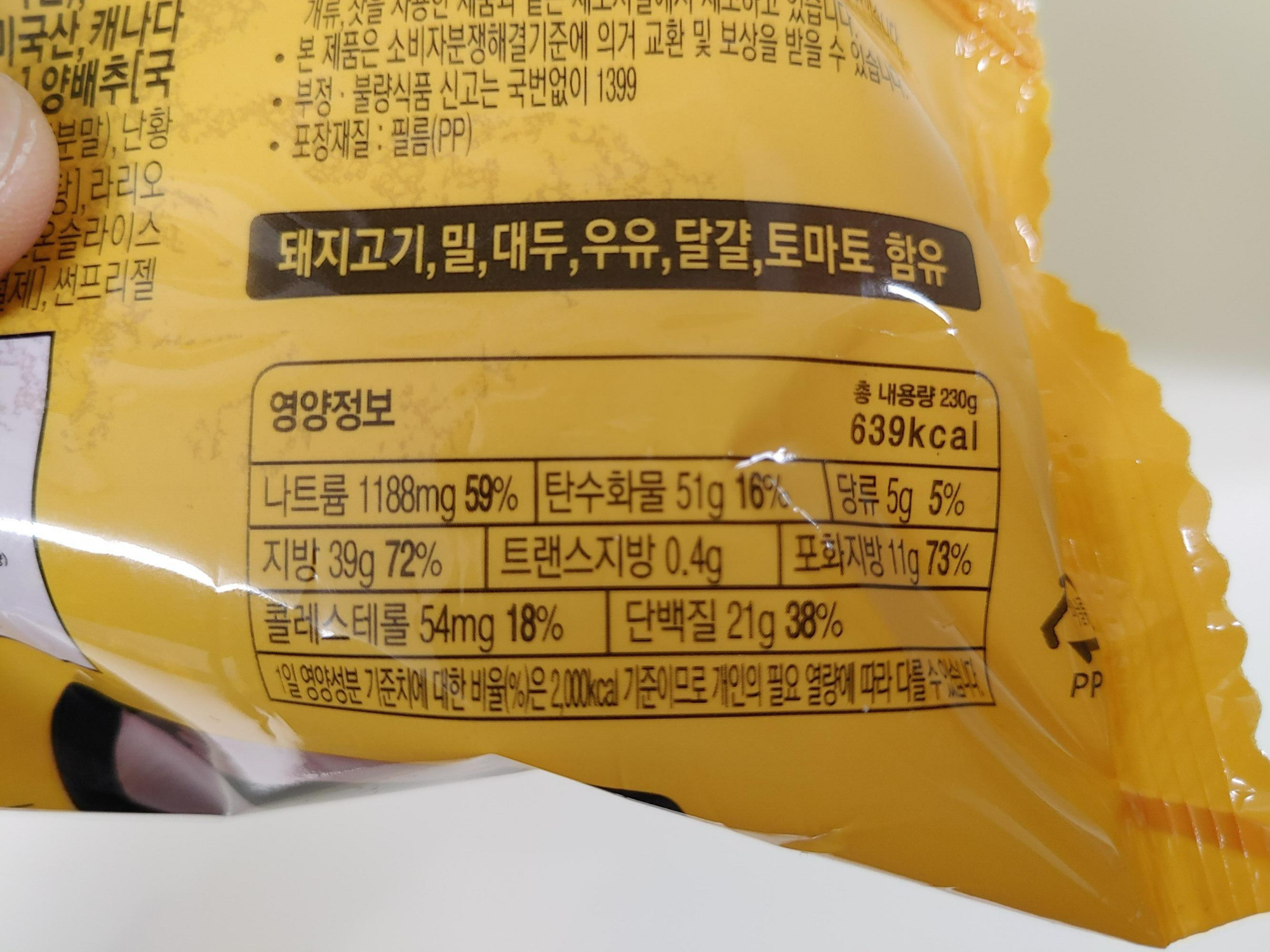영양성분은 230g 기준으로 639kcal 에요. 그리고 나트륨은 좀 많은 편이에요 ㅎㅎ 아무래도 소스들이 가득이라서 그런지 나트륨은 좀 많은 편이에요. 그외에 탄수화물, 지방, 트랜스지방, 포화지방, 콜레스테롤, 단백질등 다양한 영양성분들을 보실 수 있어요.