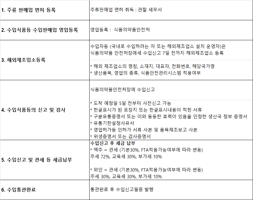 주류수출입 판매업 면허 -> 수입식품등 수입판매업 영업등록 -> 해외 제조업소 등록 -> 수입식품등의 신고 및 검사 -> 수입신고 및 관세등 세금납부 -> 수입통관 완료