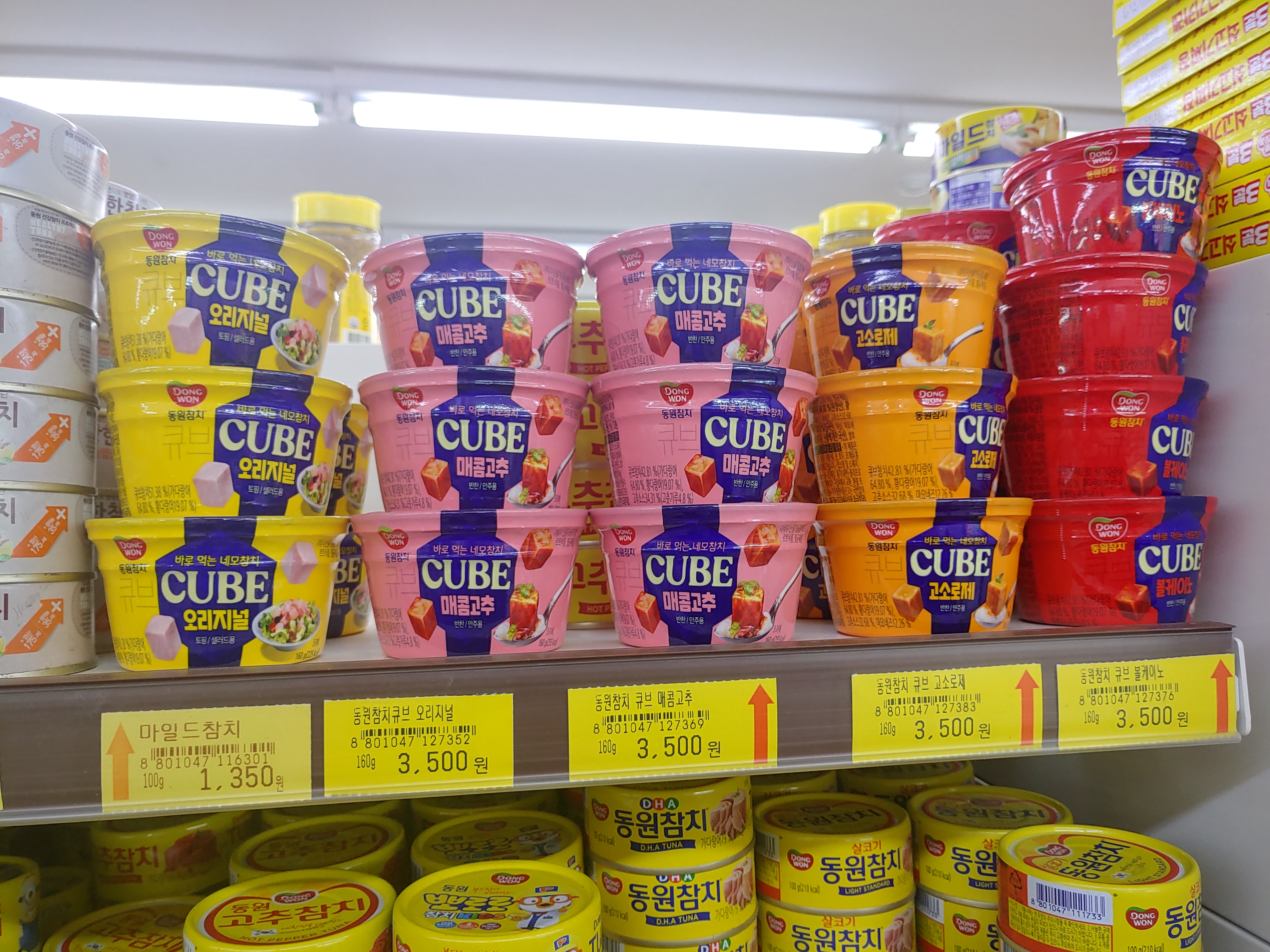 동원참치큐브는 이번에 새로나온 것 같았는데요. 동네마트에서도, 이마트에서도 이렇게 있더라구요. 맛은 동원참치큐브 오리지널, 매콤고추, 고로로제(!!), 볼케이노(!!)가 있었구요. 뭔가 굉장히 예쁘게 만든 포장이 되어있기도 했어요.