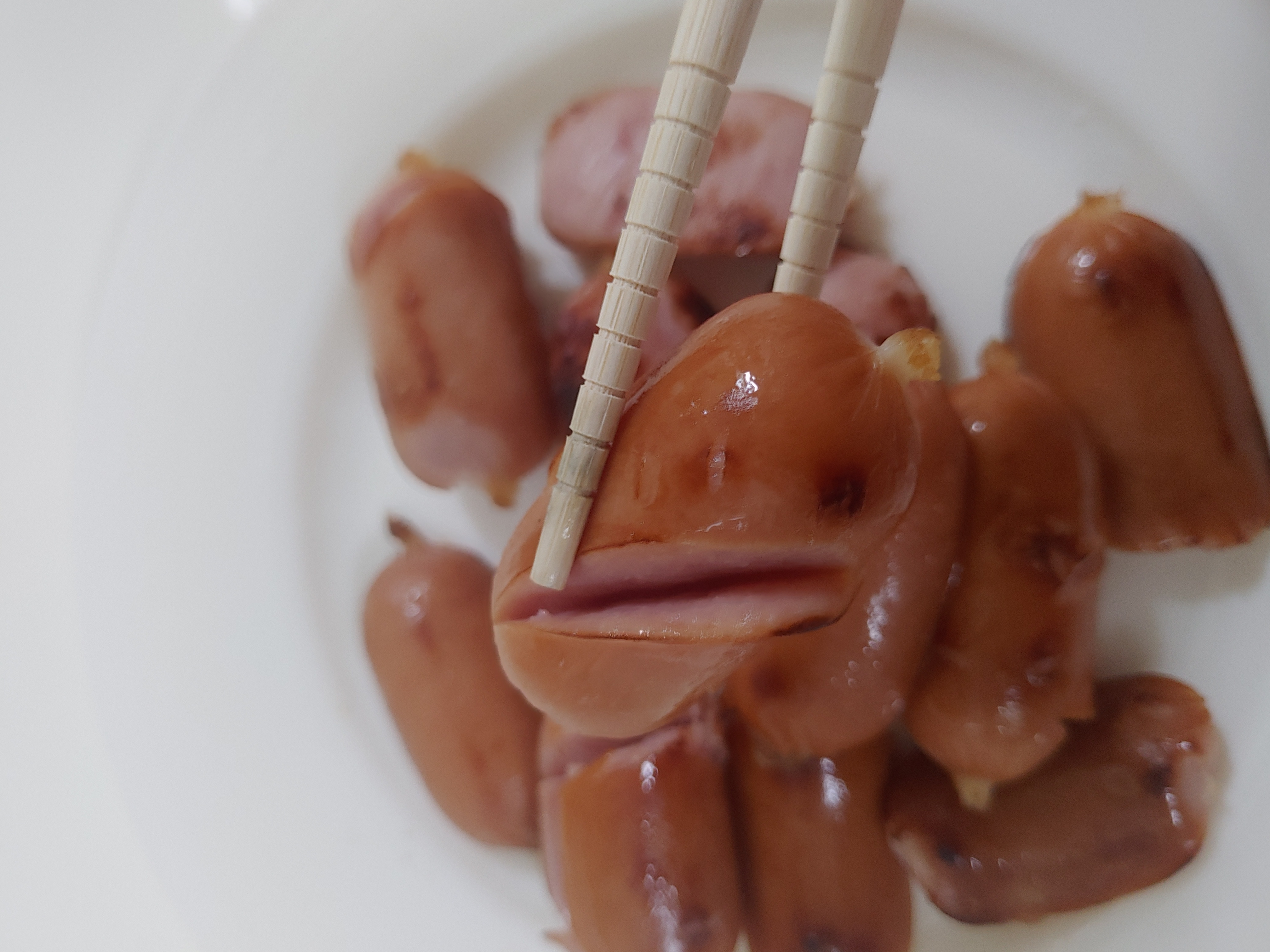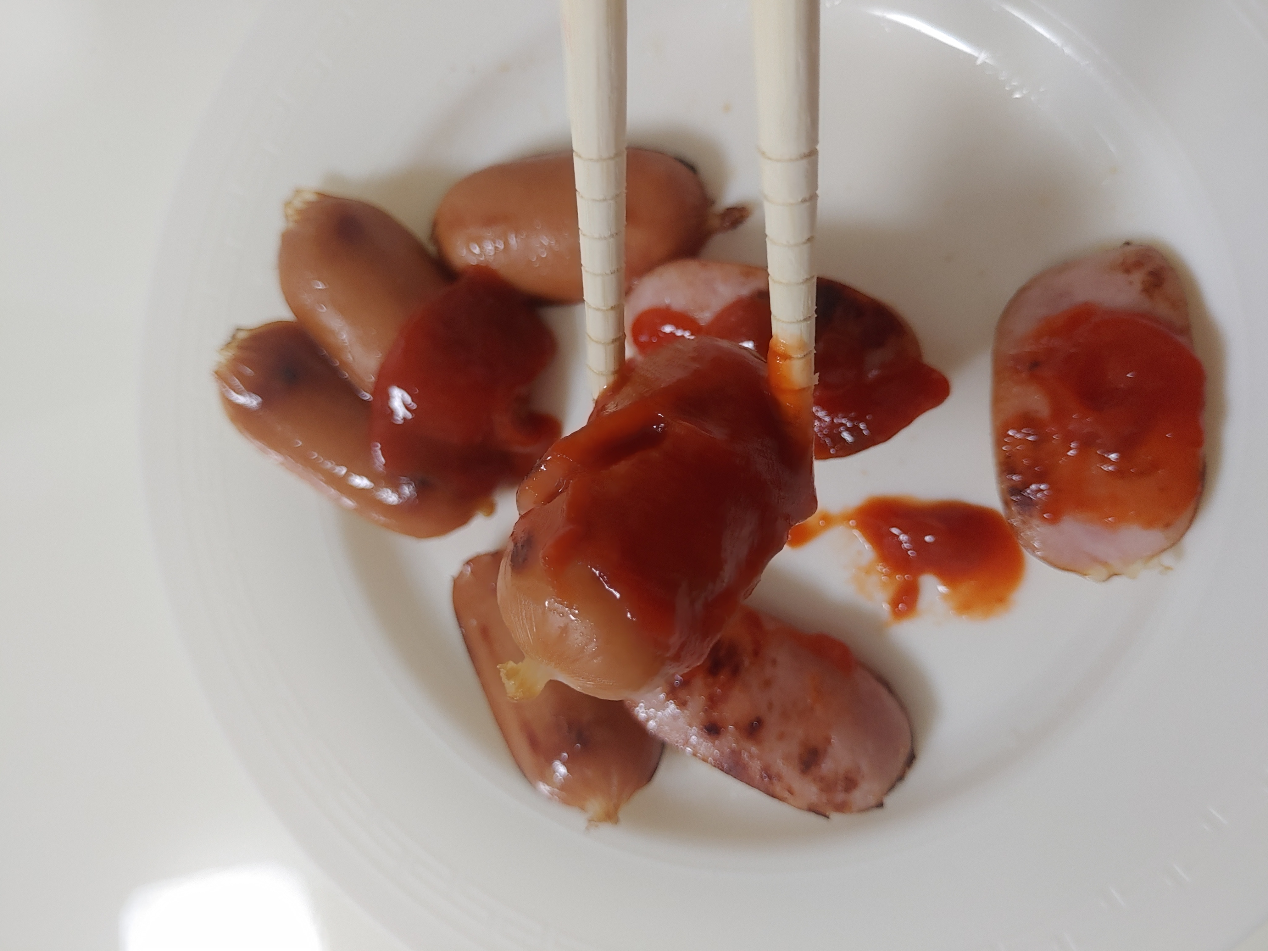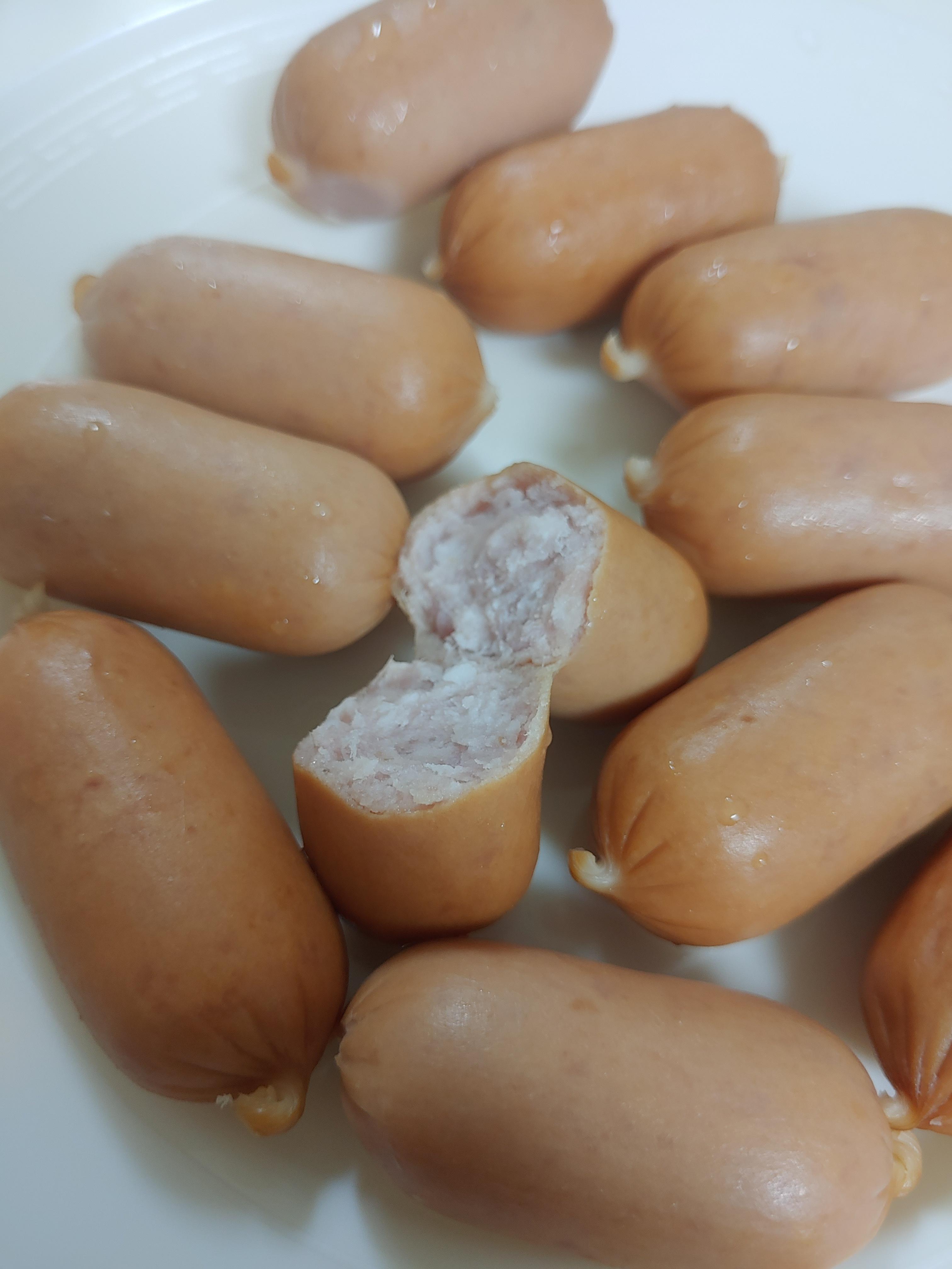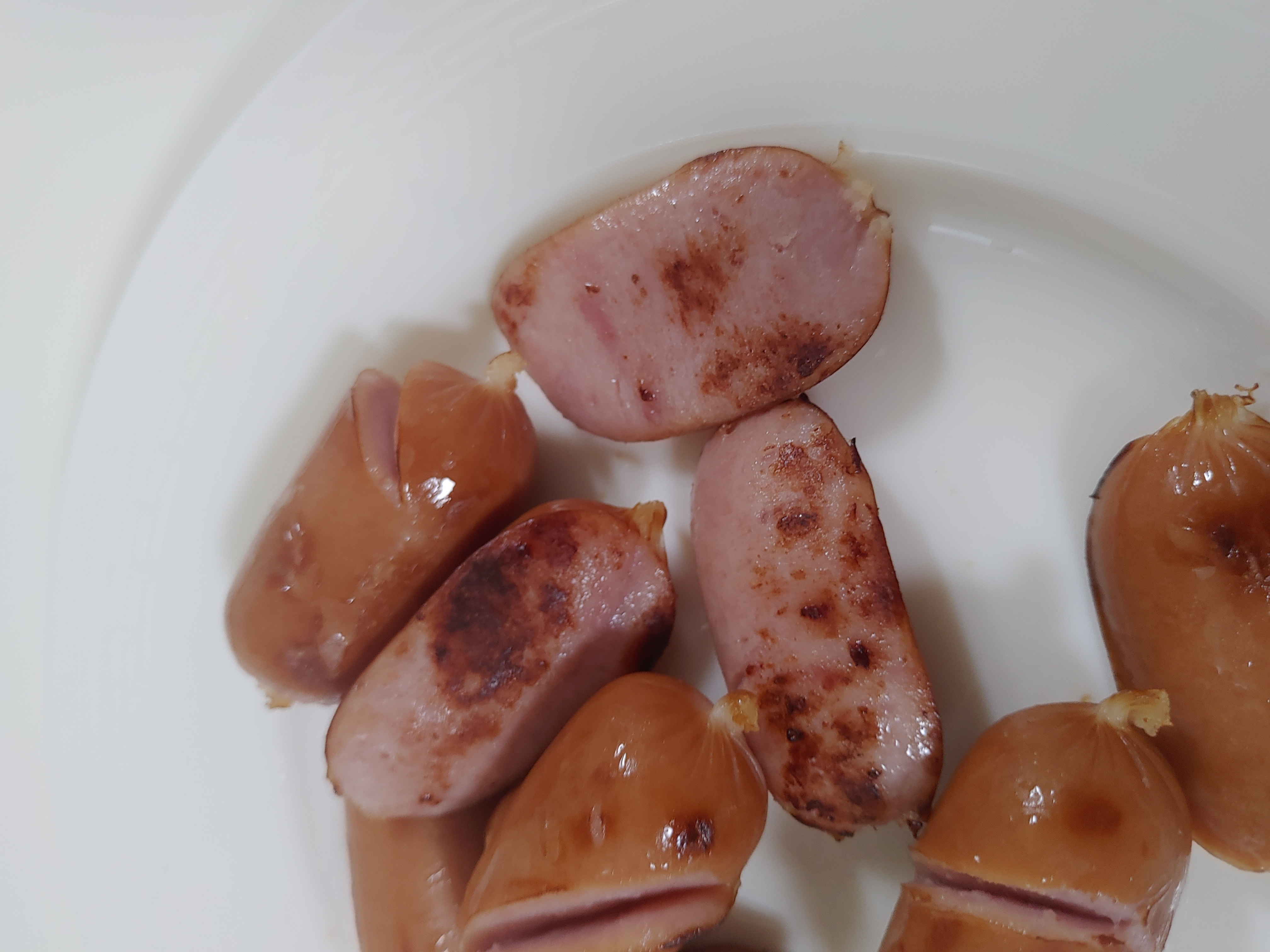 자취를 하러 나왔기 때문에 ^^;; 마음대로 잘라내 봤습니다. 제가 느끼기에는 반을 잘라내서 먹는 것 보다는 칼집이랑 더 잘어울리는 느낌의 소시지더라구요. 개인적으로 소시지에 칼집이 이렇게 되서 구워지면 더 맛있더라구요!!