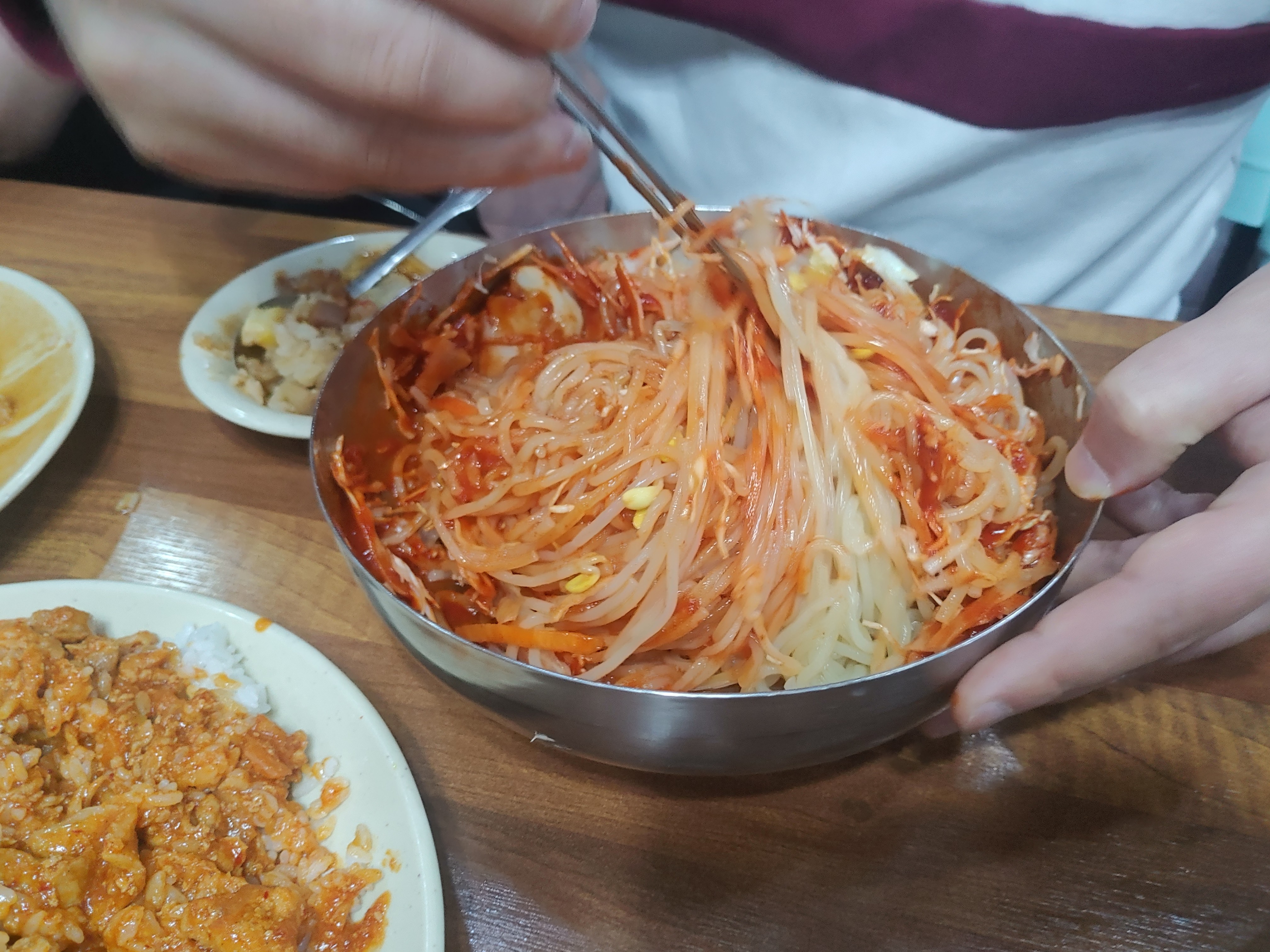 사실 나오자마자 사진을 찍었어야 하는데 덮밥을 먼저 비비고 있다가 사진을 찍기 시작해서 ^^;; 조금 비벼져 있는 모습인데요... 양이.... 양이... 어마어마하죠?? ^^?? 이게 6천원이에요 !!