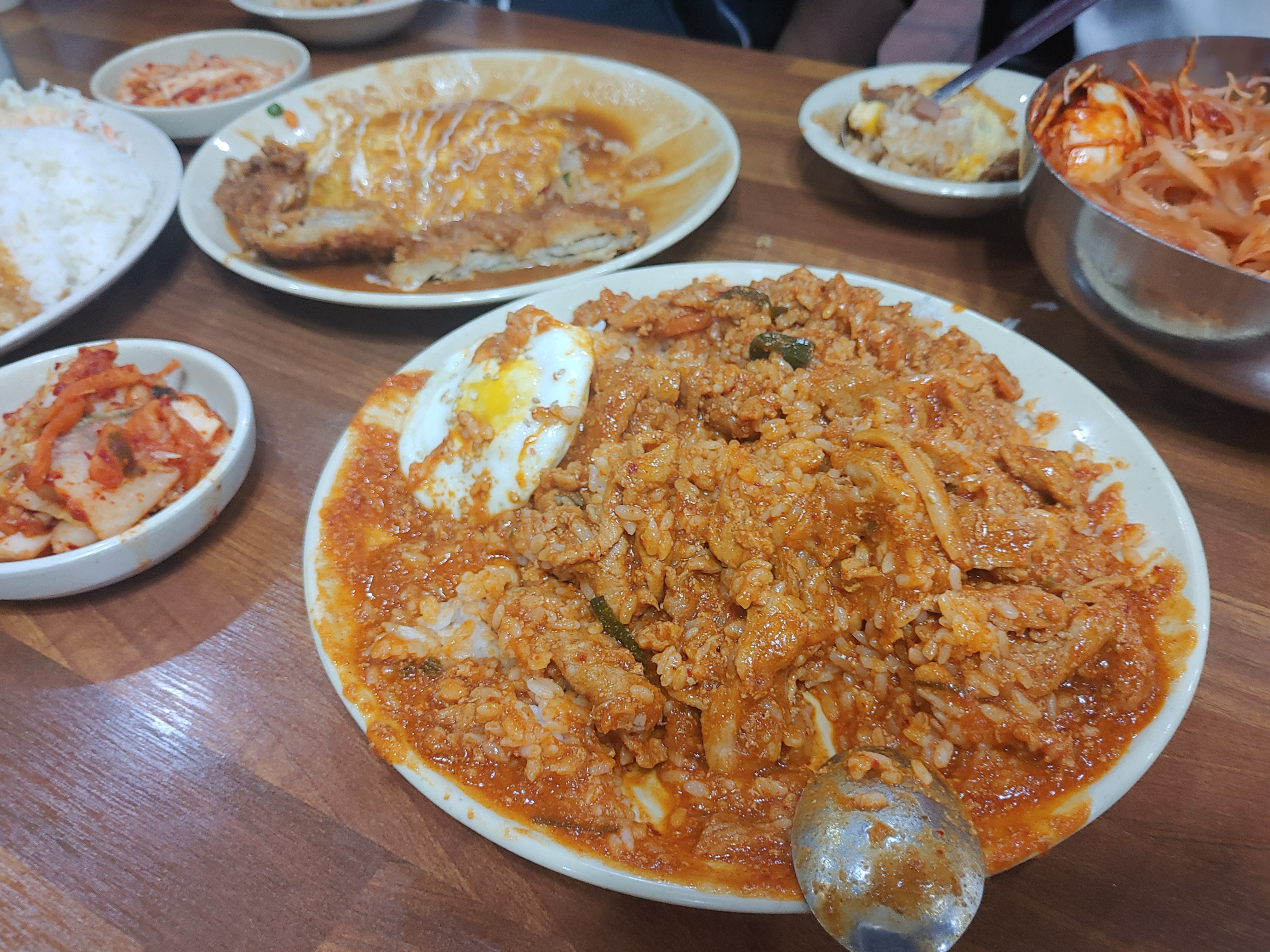 일단 신신분식에 오면 저는 주로 제육덮밥 그리고 돈까스를 주로 시켜서 먹는 편인데요. 간혹 떡볶이도 먹고, 돈까스에 조합이 엄청 좋은 쫄면, 돈쫄 조합을 해서 먹기도 하고 그런데요. 여러사람이 오면 여러사람이서 나눠먹고 하는 편이에요. 이날은 돈까스, 제육덮밥, 쫄면, 오므라이스, 김치볶음밥까지 주문을 했는데요... 상다리가 어마어마하죠 ^^!!