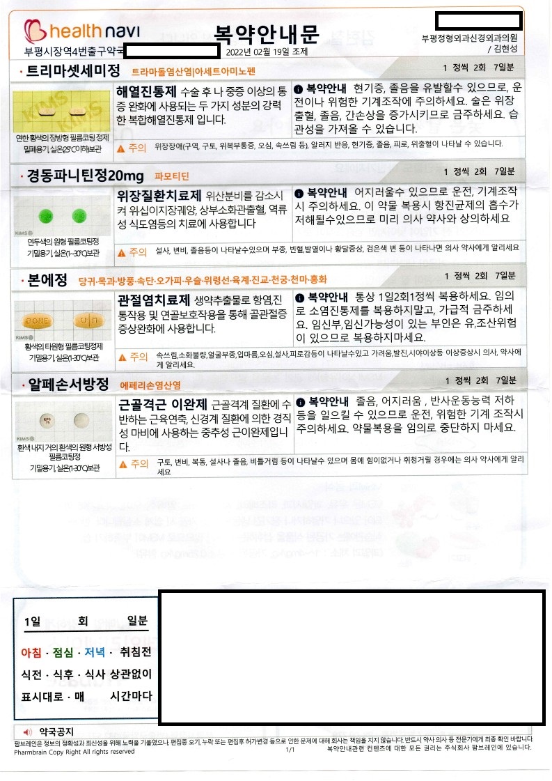 해열진통제와 관절염치료제, 근골격근 이완제를 먹고 있는데요. 밥 먹고 꼭 먹고 있으며 하루에 2회 챙겨 먹으면서 계속해서 치료를 하고 있는 중입니다. 현재 정형외과에서 약을 먹은 것은 2주 정도가 되어가고 있습니다.
