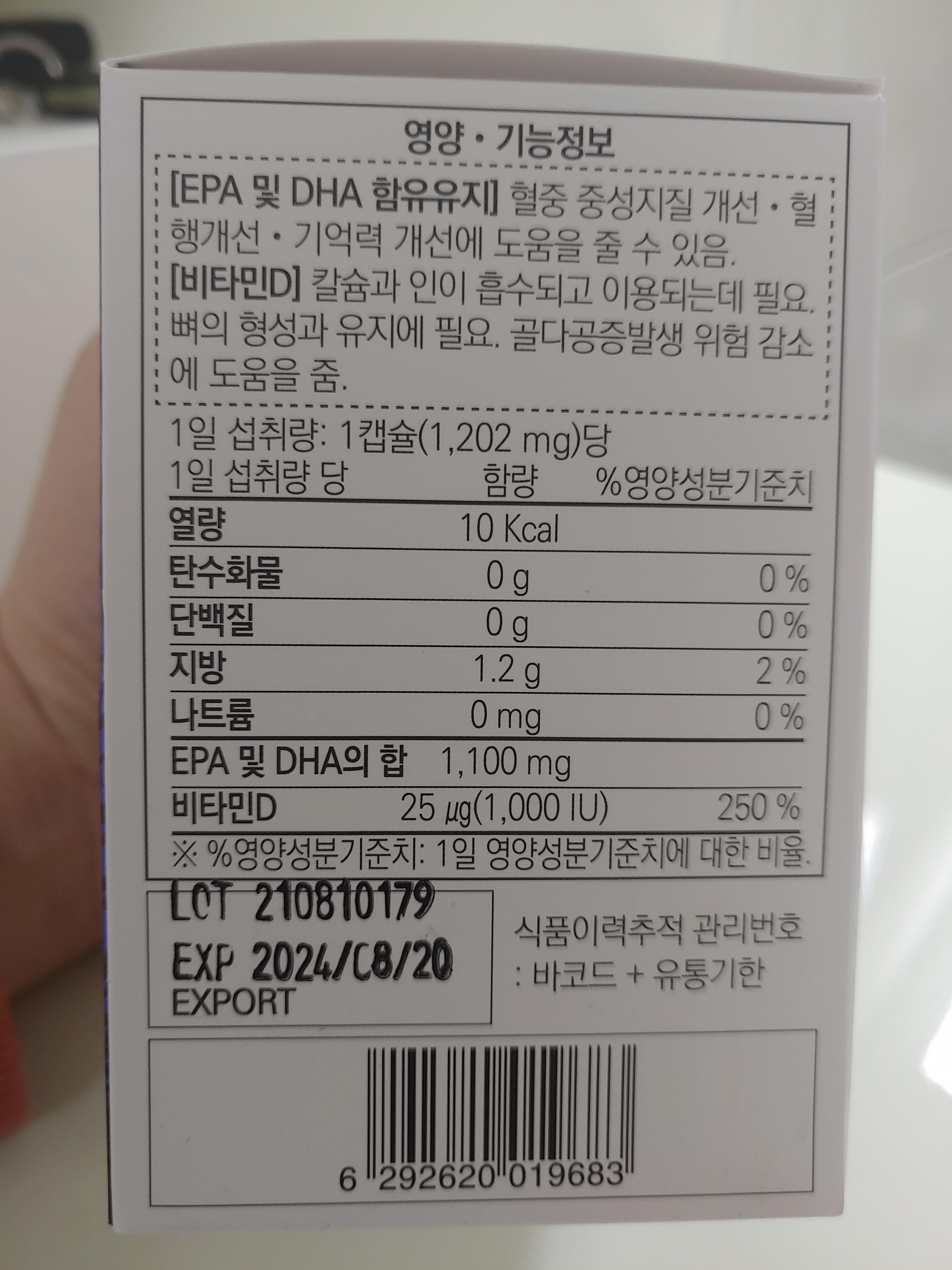 오메가-3의 효능에는 EPA와 DHA 함유유지로 혈중 중성지질 개선-혈행개선-기억력개선에 도움을 줄 수 있다고 하구요. 비타민D의 경우에는 칼슘과 인이 흡수되고 이용되는데 필요하고 뼈의 형성과 유지에 필요하고, 골다공증발생위험 감소등에 효능이 있다고 합니다.