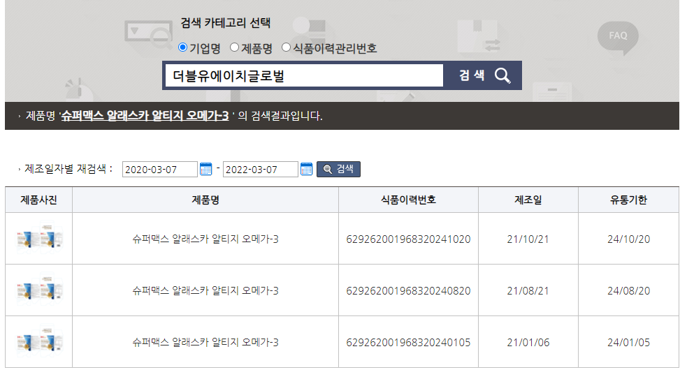 식품이력관리시스템에 기업명이나 제품명 또는 식품이력번호를 치시면 저렇게 제조일과 유통기한들이 나오는데요. 제조일자와 유통기한에 대한 내용들도 있으니까 한번 다른 건강기능식품들 드시게 되면 한번 찾아보셔도 좋을 것 같습니다.