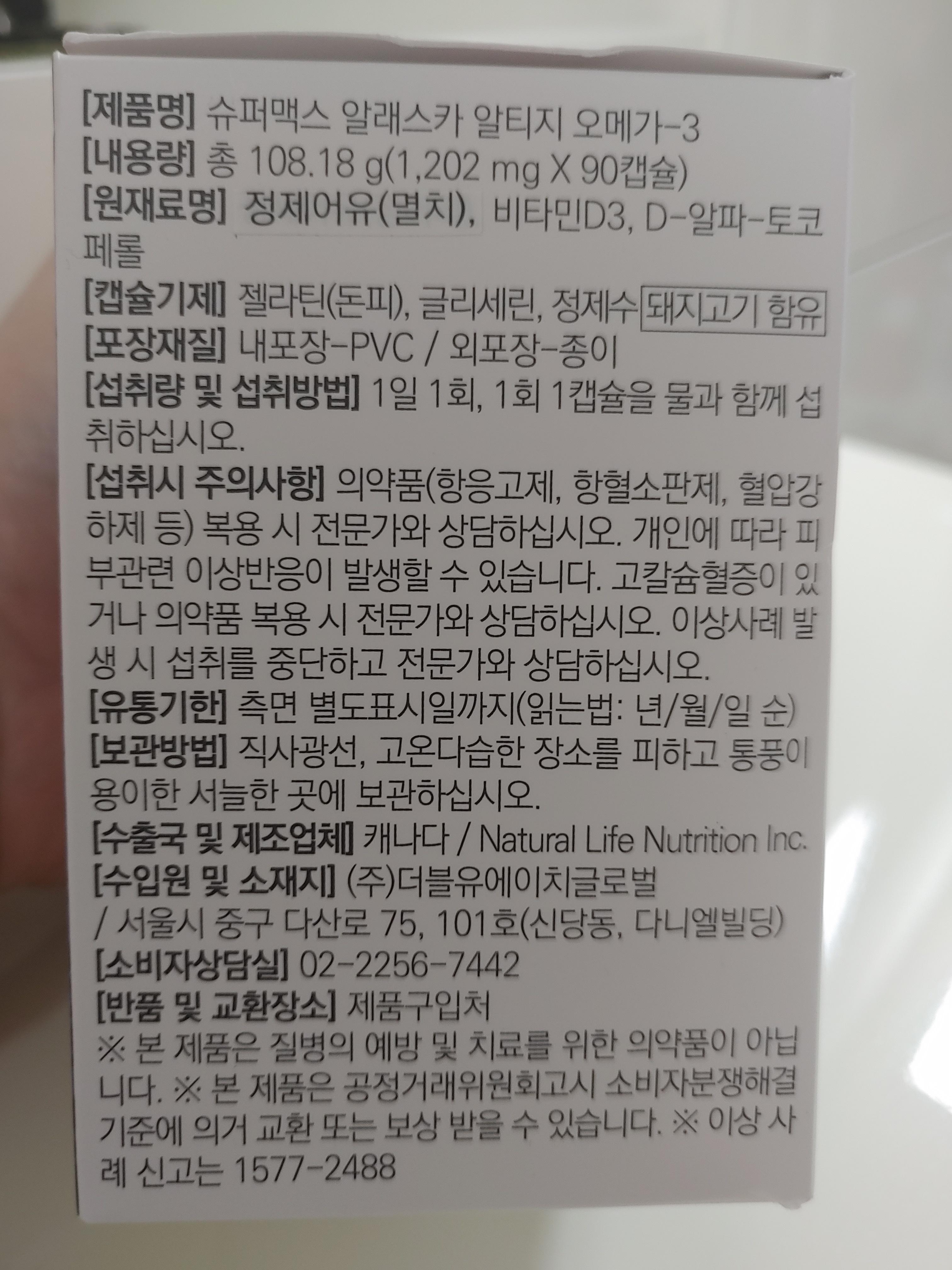 슈퍼맥스 알래스카 알티지 오메가-3 1202mg이 90캡슐이 들어가 있구요. 정제어유(멸치)와 비타민D3, D-알파-토코페롤이 원재료로 나와있더라구요. 그리고 캡슐기제에는 젤라틴과 글리세린, 정제수로 이루어져있습니다. 오메가3 뿐만 아니라 비타민 D가 들어가 있는게 특징이더라구요.