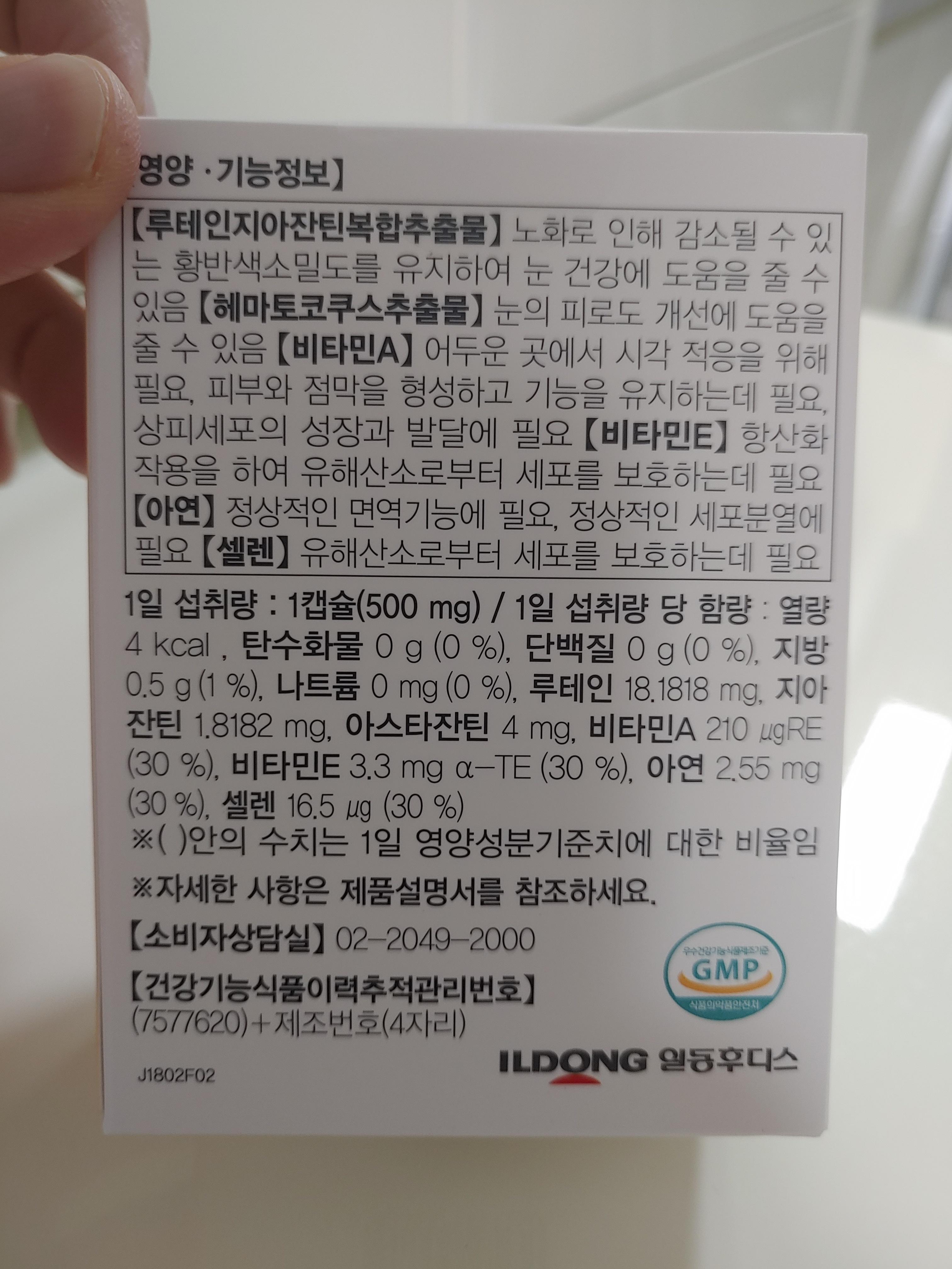 하이뮨 루테인 지아잔틴 아스타잔틴은 눈건강과 눈의 피로에 좋은 건강기능식품으로 루테인지아잔틴복합추출물, 헤마토코쿠스추출물, 비타민A, 비타민E, 아연, 셀렌이 들어있어요. 그리고 500mg 씩 30 캡슐로 구성되어 있어요. 그리고 특이사항이 1캡슐이면 식약처 권장량의 100% 루테인을 섭취할 수 있는 양이라고 해요. 한달정도 먹을 있는 분량이더라구요.