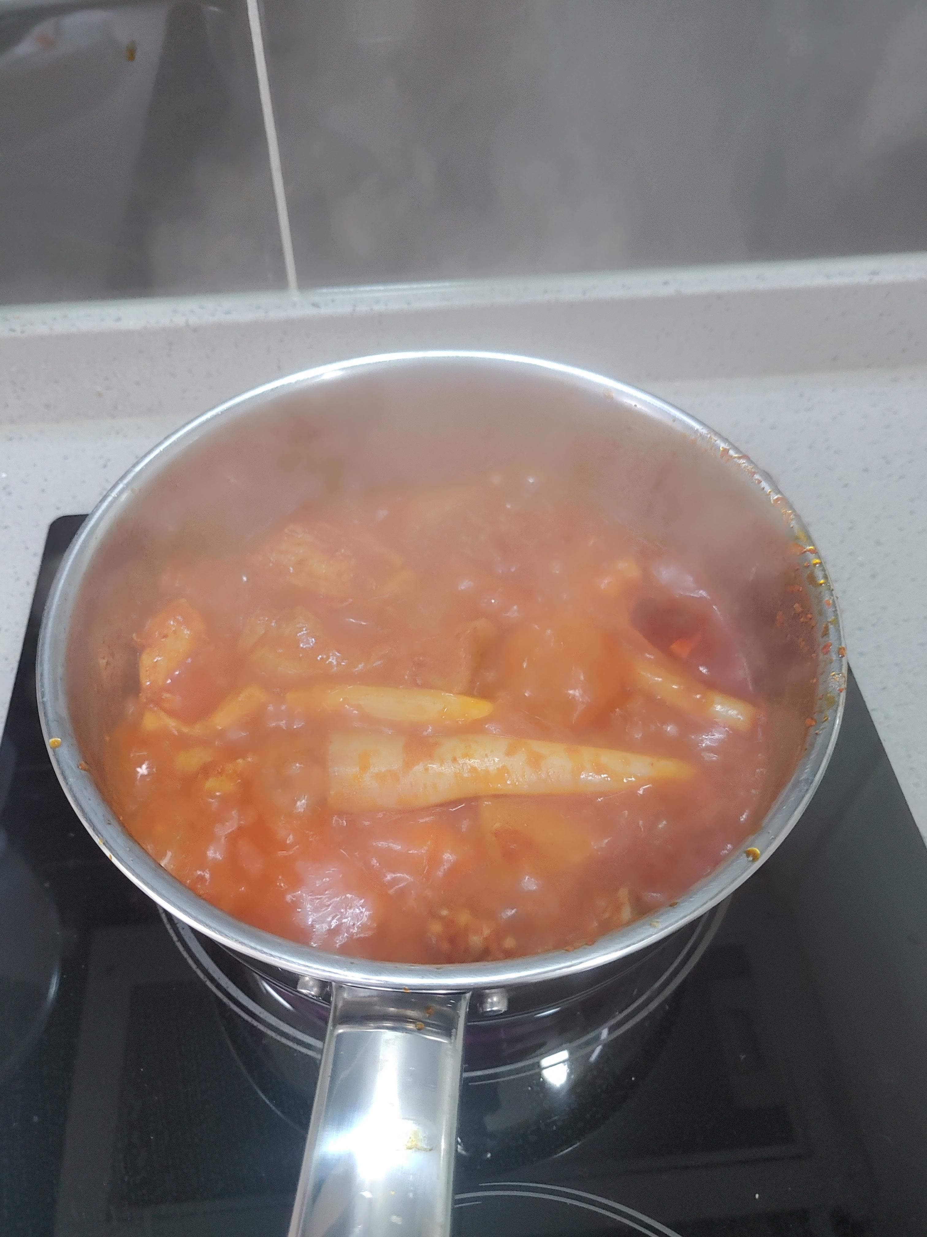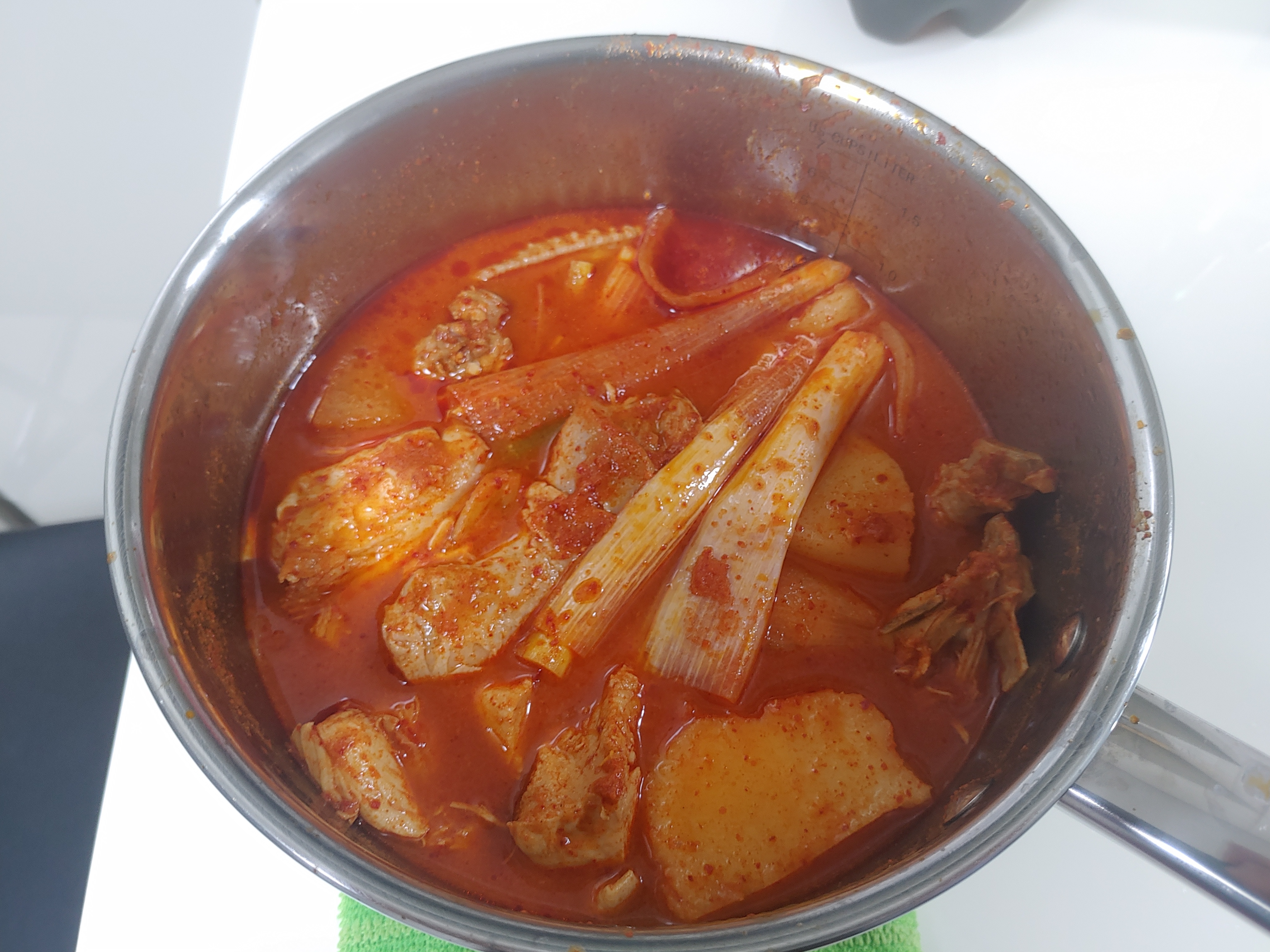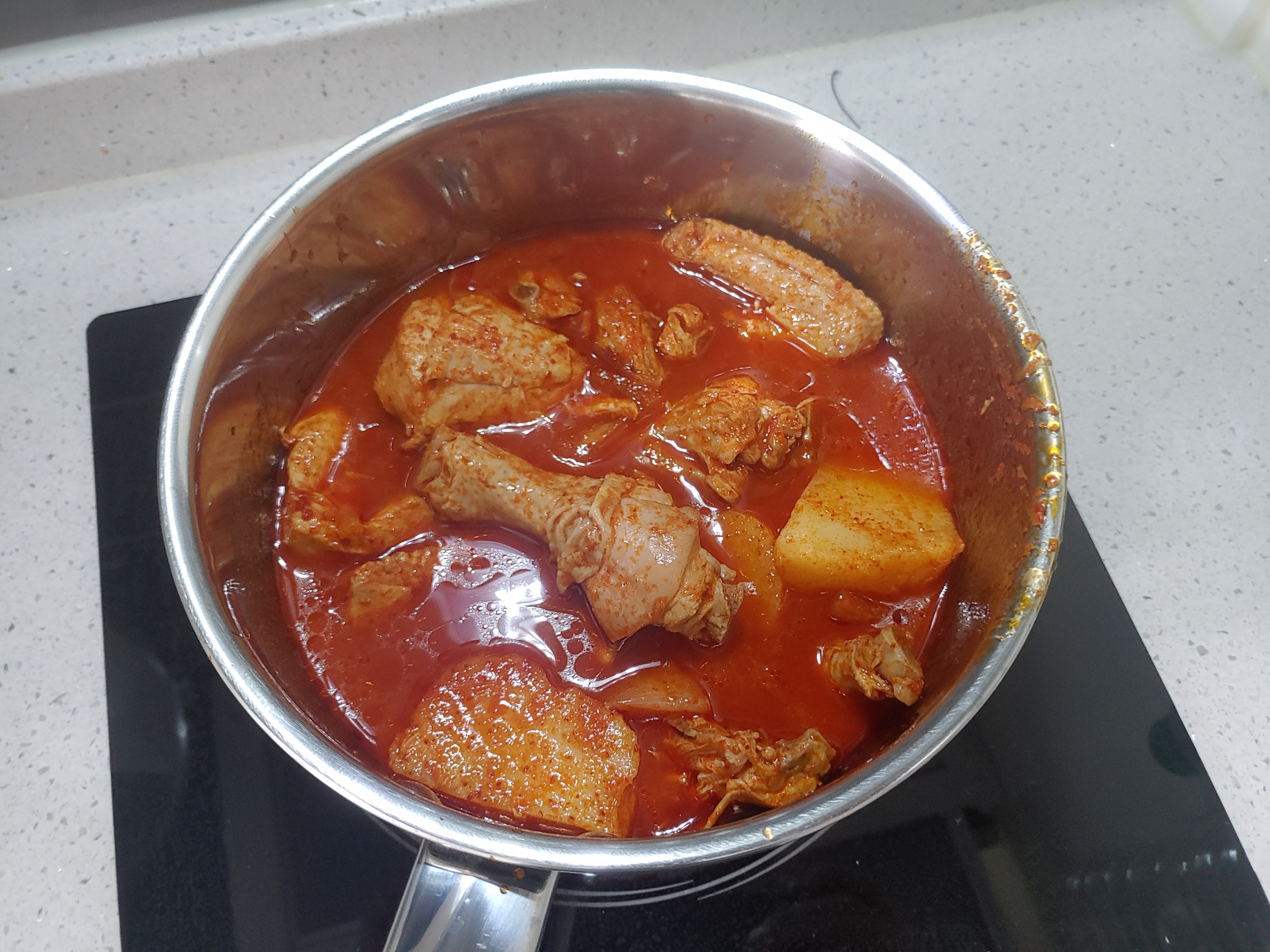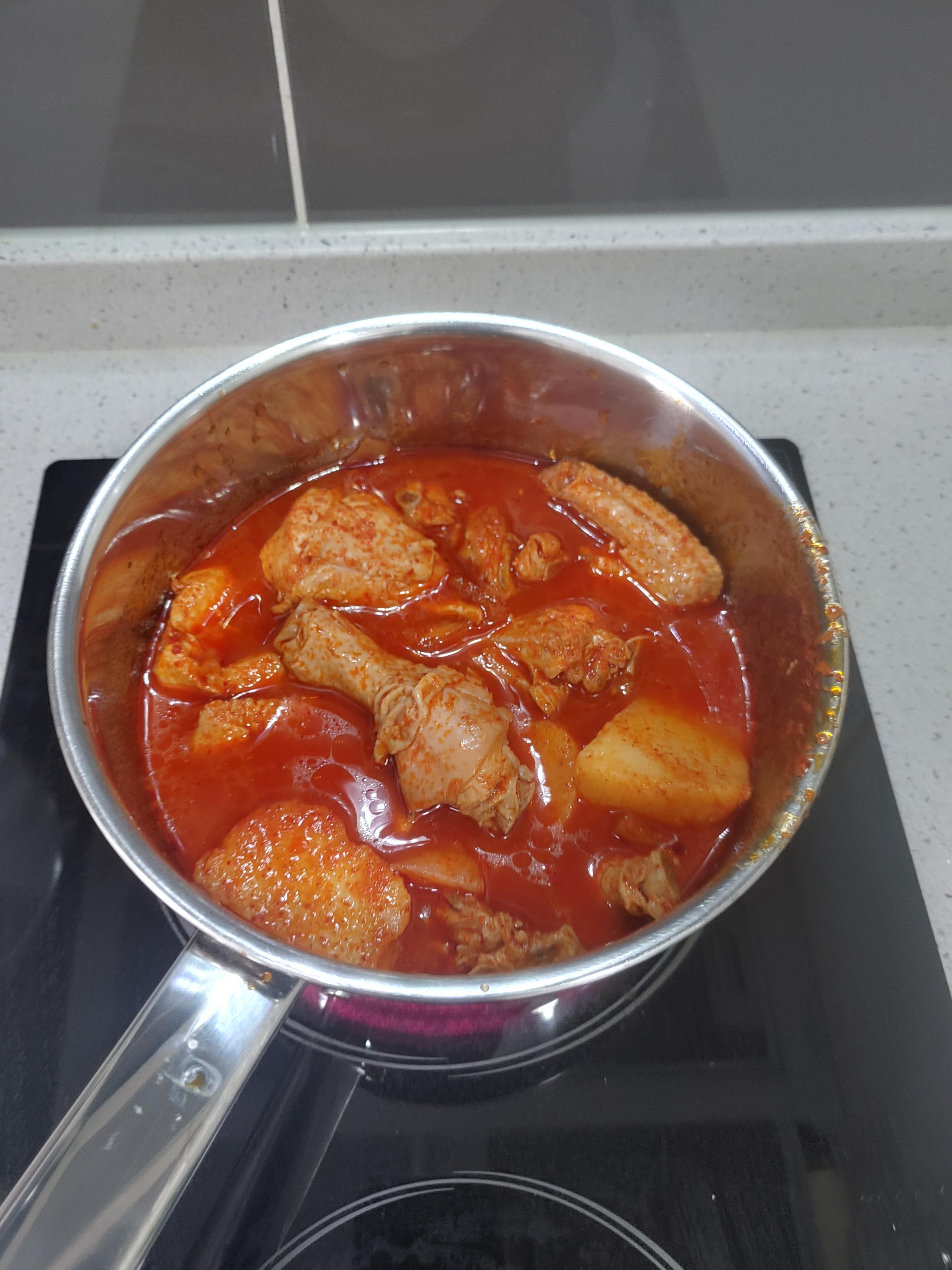 닭볶음탕을 냄비에 이렇게 옮겨담고 끓여주시면 됩니다. 닭볶음탕도 ㅎㅎ 끓이면 끓일수록 아무래도 졸이는 것 만큼이나 맛이 더 있는 것 같은 느낌이라 ㅎㅎㅎ 꽤 많이 끓이기로 했습니다. 사실 식당에서 앉아서 먹는 것이었다고 하면 이 국물에 밥도 볶고 더 그래볼 텐데 이날은 다른 것을 준비를 했습니다. 볶음밥은 이런 작은 냄비로는 조금 힘들더라구요.