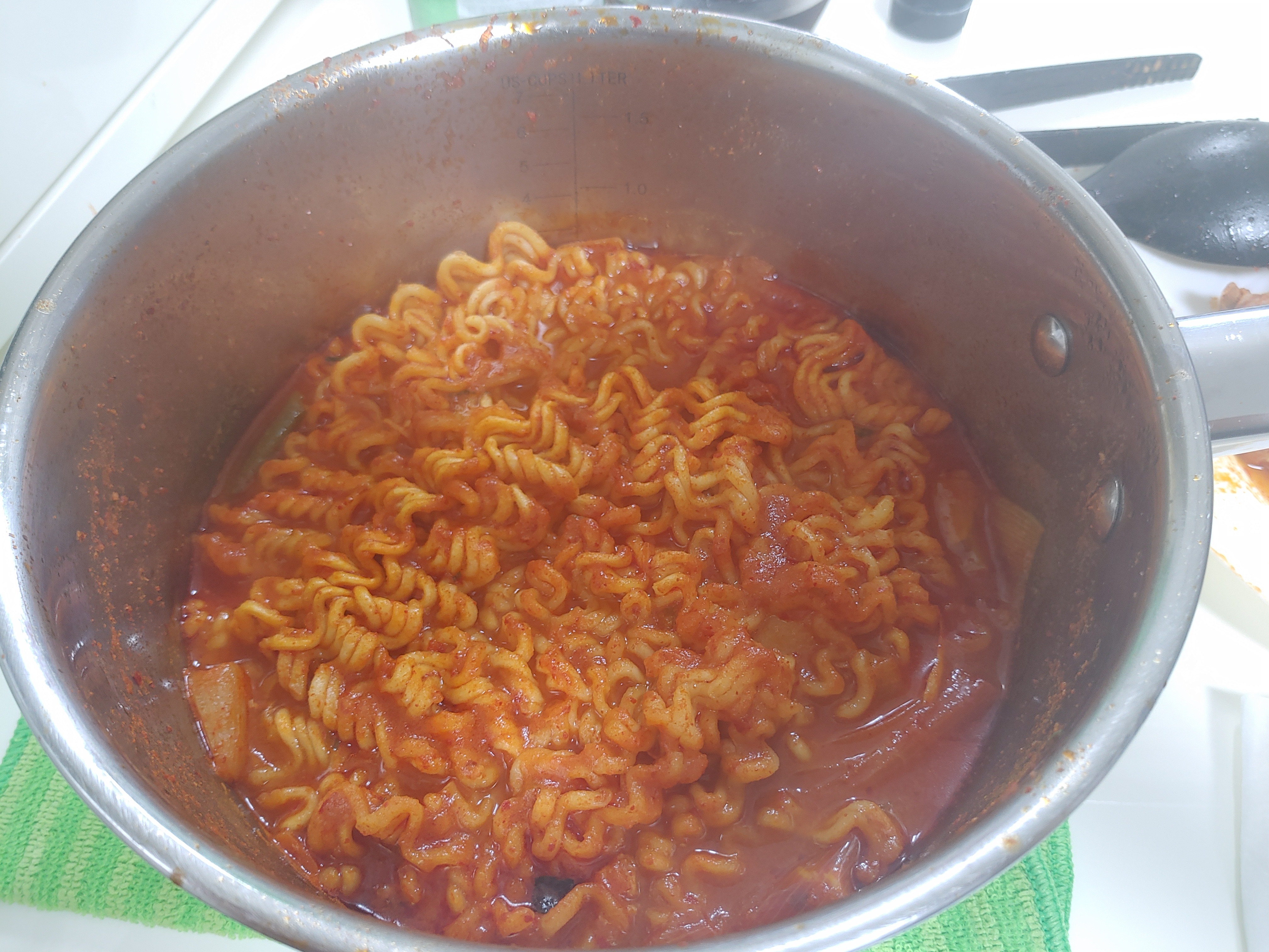 닭을 먹고 마지막 양념에 별미를 하나 준비를 했는데요. 집에 라면사리가 있어서 라면사리와 물을 살짝 넣고 끓여주었습니다!! 냄비가 작아서 볶음밥은 좀 애매할 것 같고, 설겆이도 힘들어서 그냥 라면으로 달려봤습니다!!