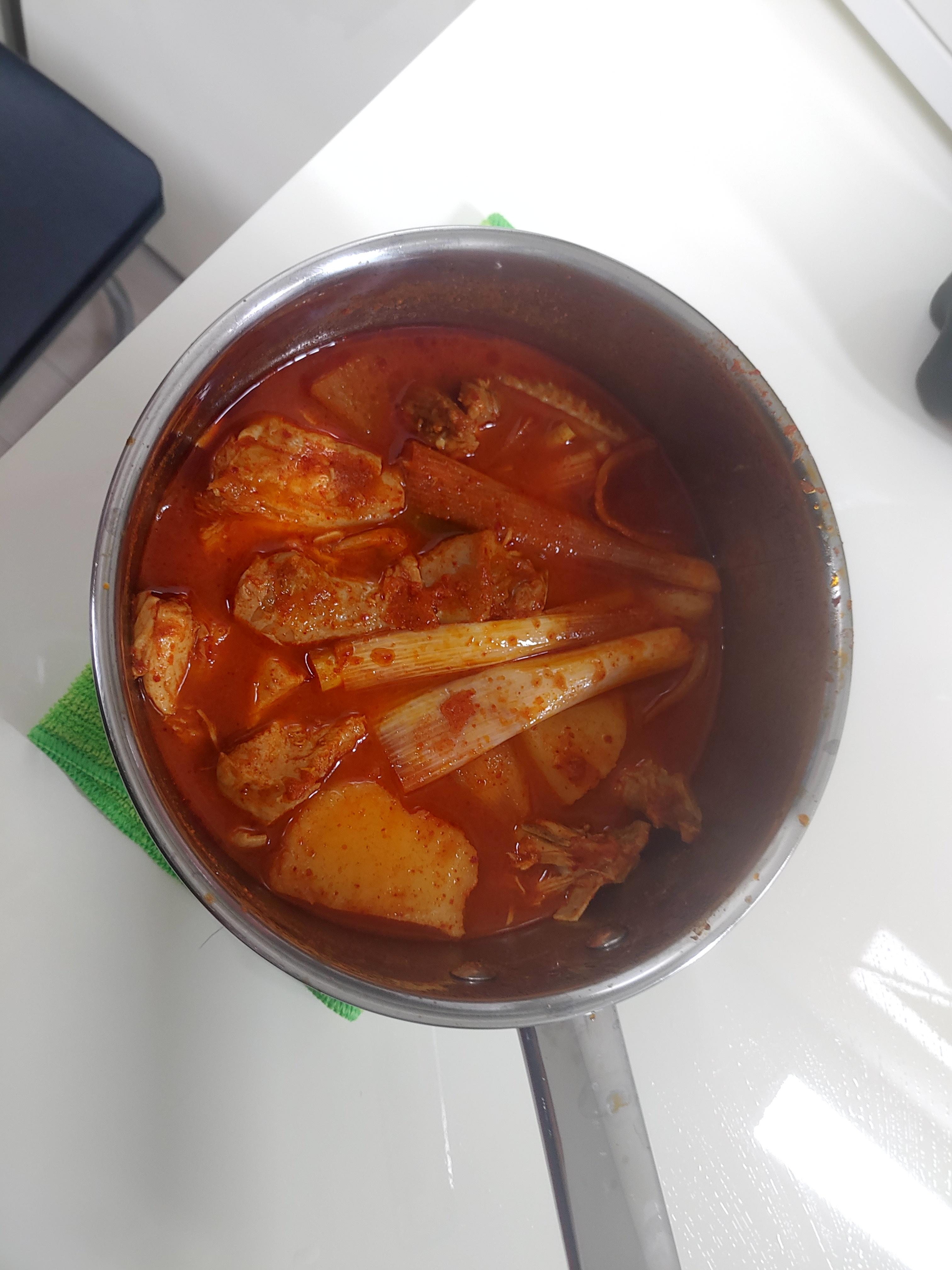 꽤 끓여서 졸여주면 양념이 닭고기에 잘 스며들면서 엄청 맛있어집니다!! 그리고 이렇게 끓이니까 향이 장난이 아니더라구요 ㅎㅎ 이게 냄새를 글로 표현하기가 참 어려운데요. 그 매콤하고 담백한 느낌의 그 특유의 향이 정말 인상적이었어요. 펄펄 끓여주고, 감자와 대파가 어느정도 익었다고 하면 끝입니다!!