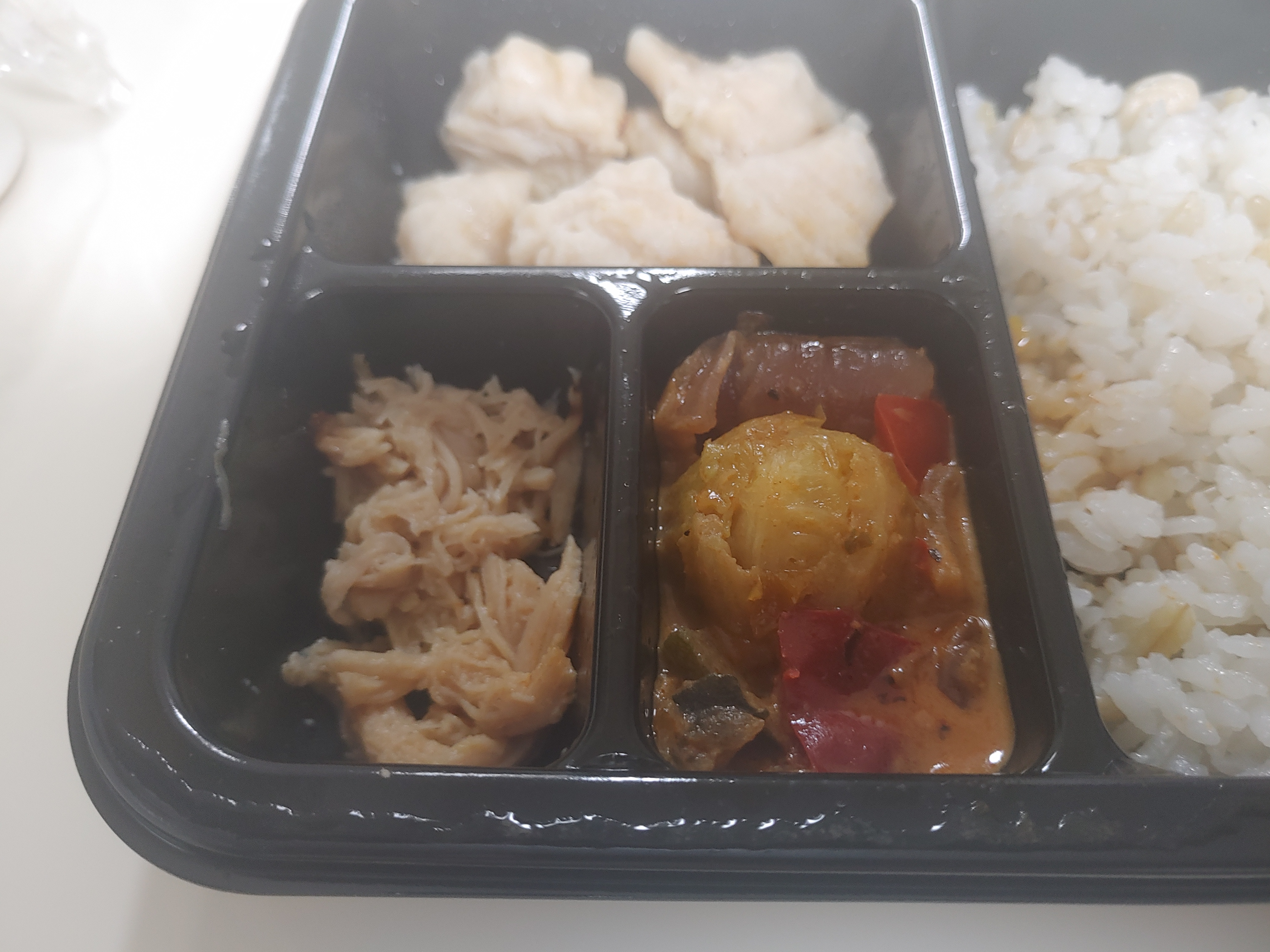 밥과 닭가슴살 그리고 약간의 장조림 같은 것과 양념된 야채들이 들어 있는 것 같았는데요. 카무트밥과 다이어트칠리소스와 애호박, 방울양배추잎이 들어간 그릴믹스라고 하는 것 같더라구요. 정말 이것만 먹으면 다이어트가 되겠구나 하는 구성이라고 보시면 될 것 같습니다!!