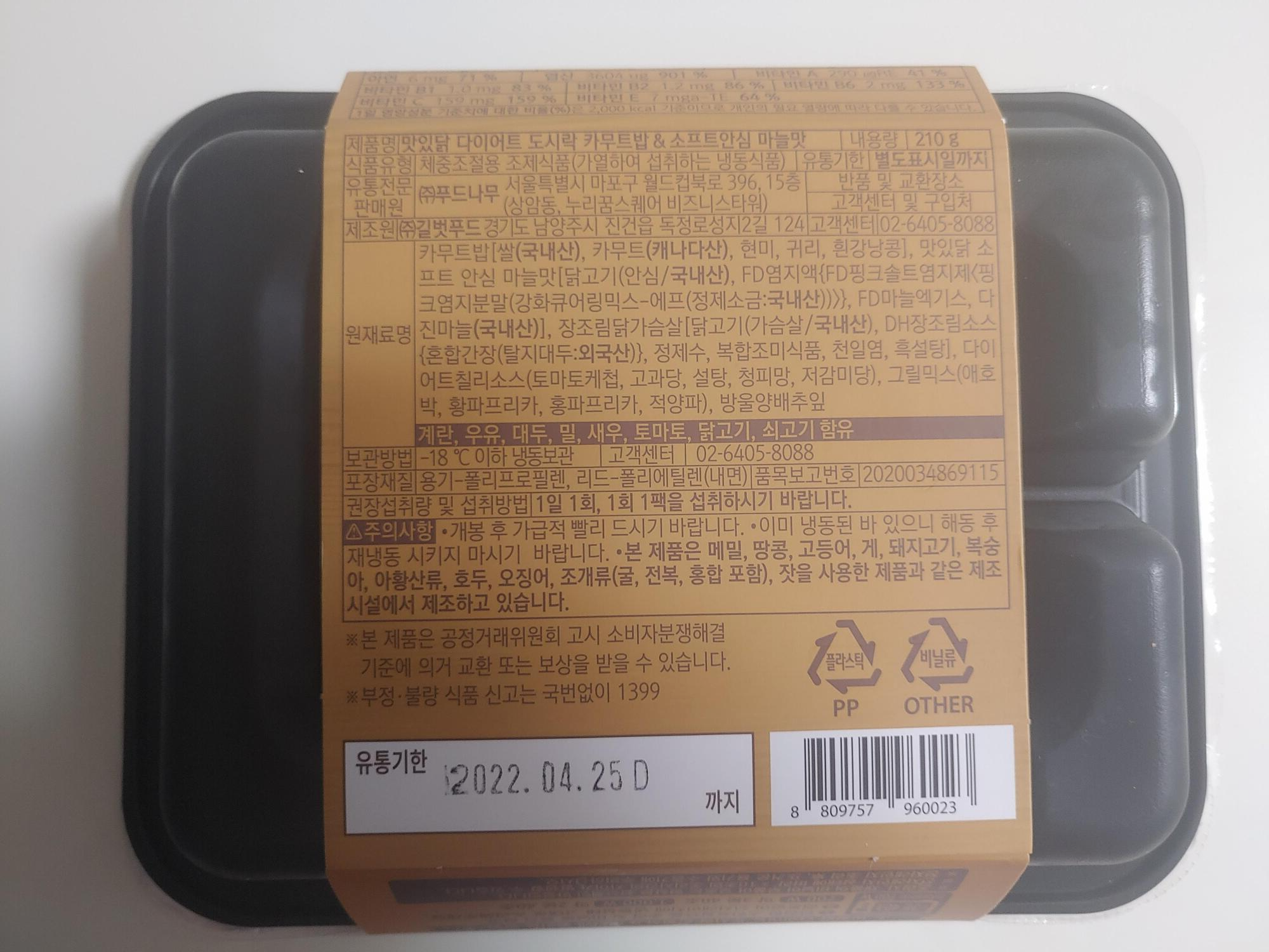 체중조절용 조제식품으로 식품 유형이 되어 있는것이 조금 특이한 부분이었구요. 냉동식품이고, 냉동으로 주셔서 집에서가서 냉동에 넣언놓고 얼른 먹으라고 하시더라구요. 그리고 원재료들이 이것저것 많이 들어가는데요. 닭가슴살에 밥으로 간단하게 구성한 도시락이라고 보시면 될 것 같습니다. 양도 적고, 딱 필요한 것만 담아서 다이어트용이구요 ㅎㅎ