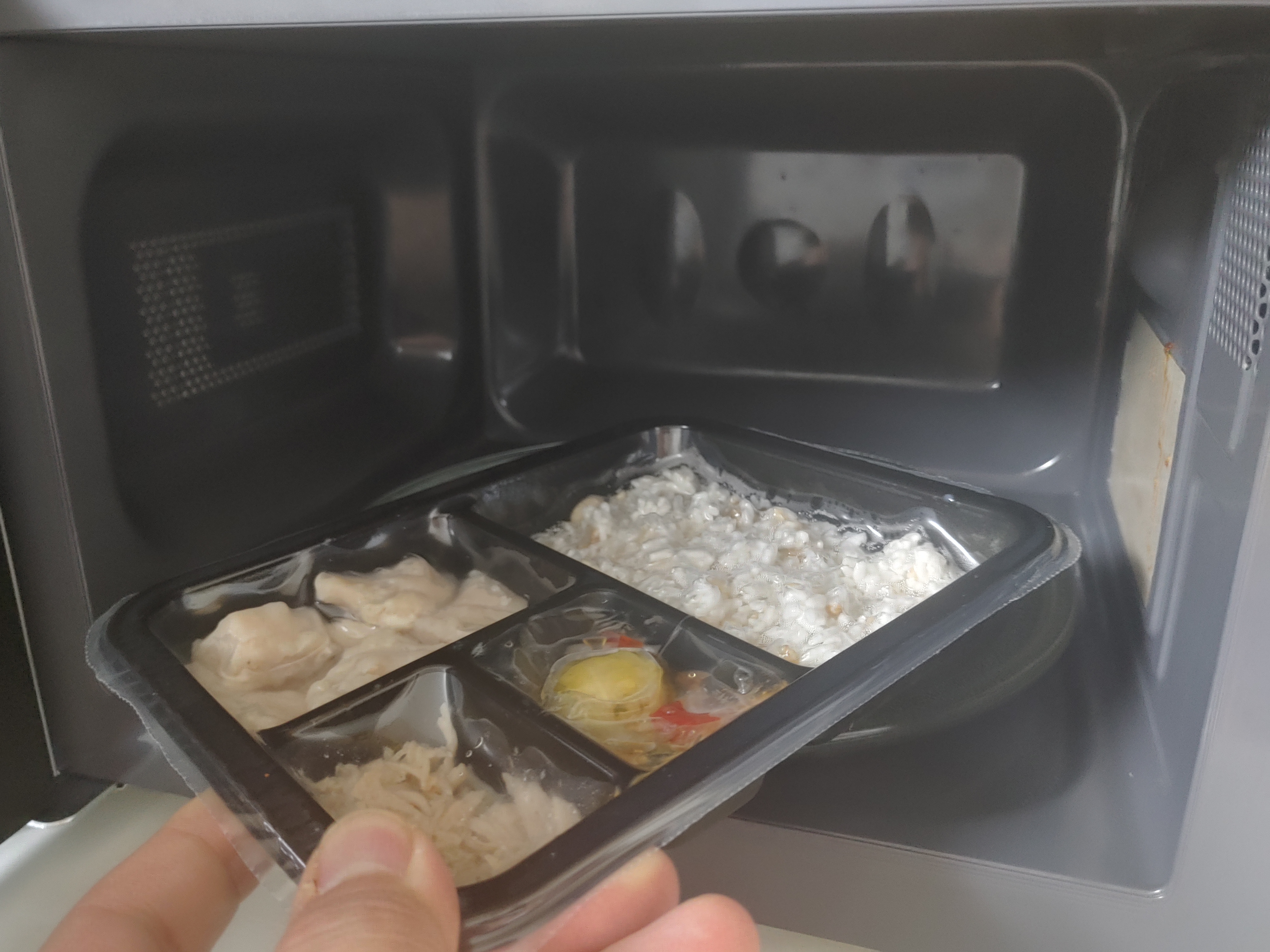 전자렌지에 3분 40초 그냥 돌려주기만 하면됩니다. 아주 간단하기는 하더라구요. 전자렌지에 돌릴때도 그냥 랩핑 되어 있는 상태로 그냥 바로 넣으면 됩니다. 터지거나 하지도 않고 위생적으로 깔끔하게 그냥 돌리기만 하면 되는 방식이라 편하기는 편하더라구요.