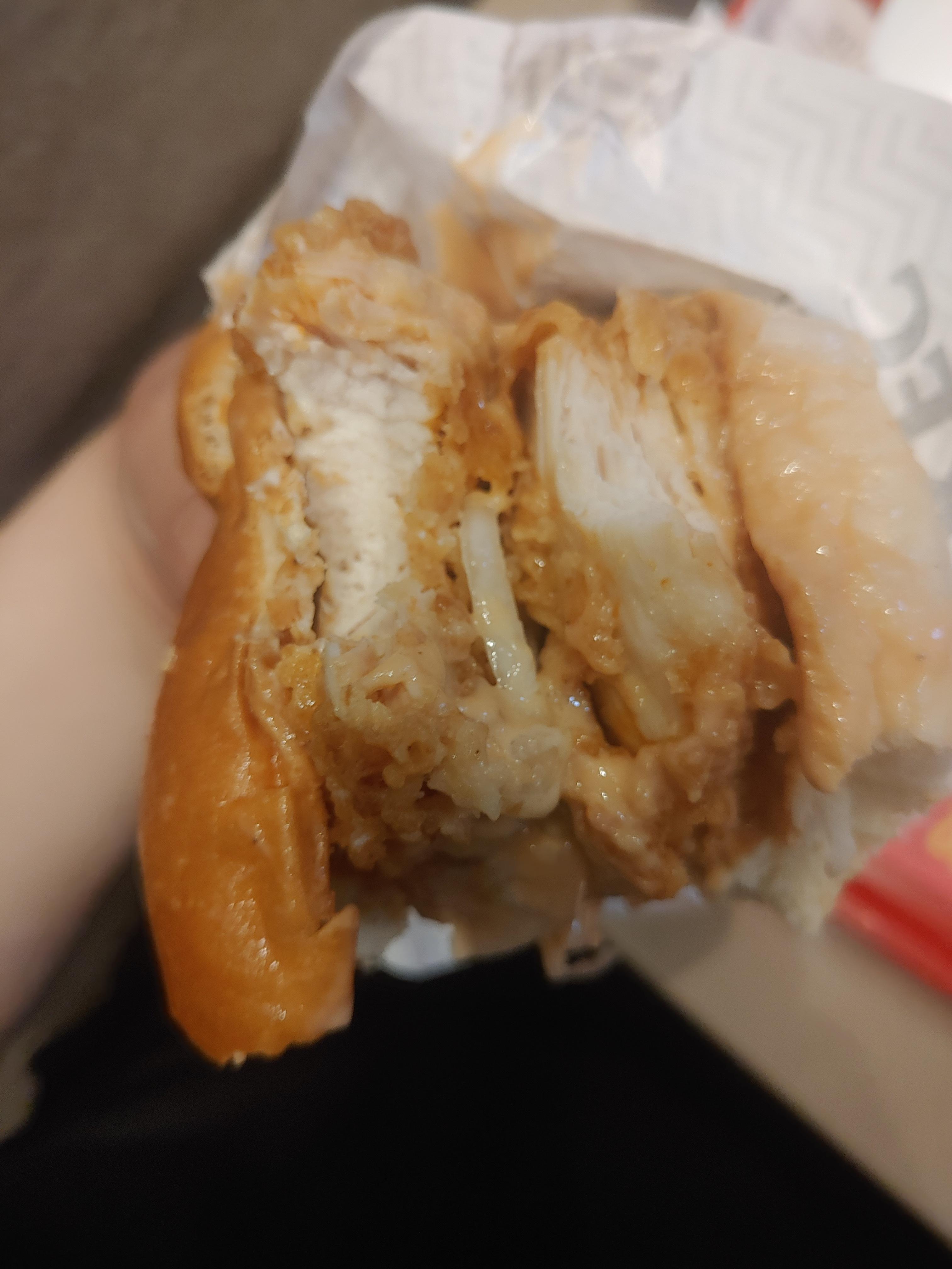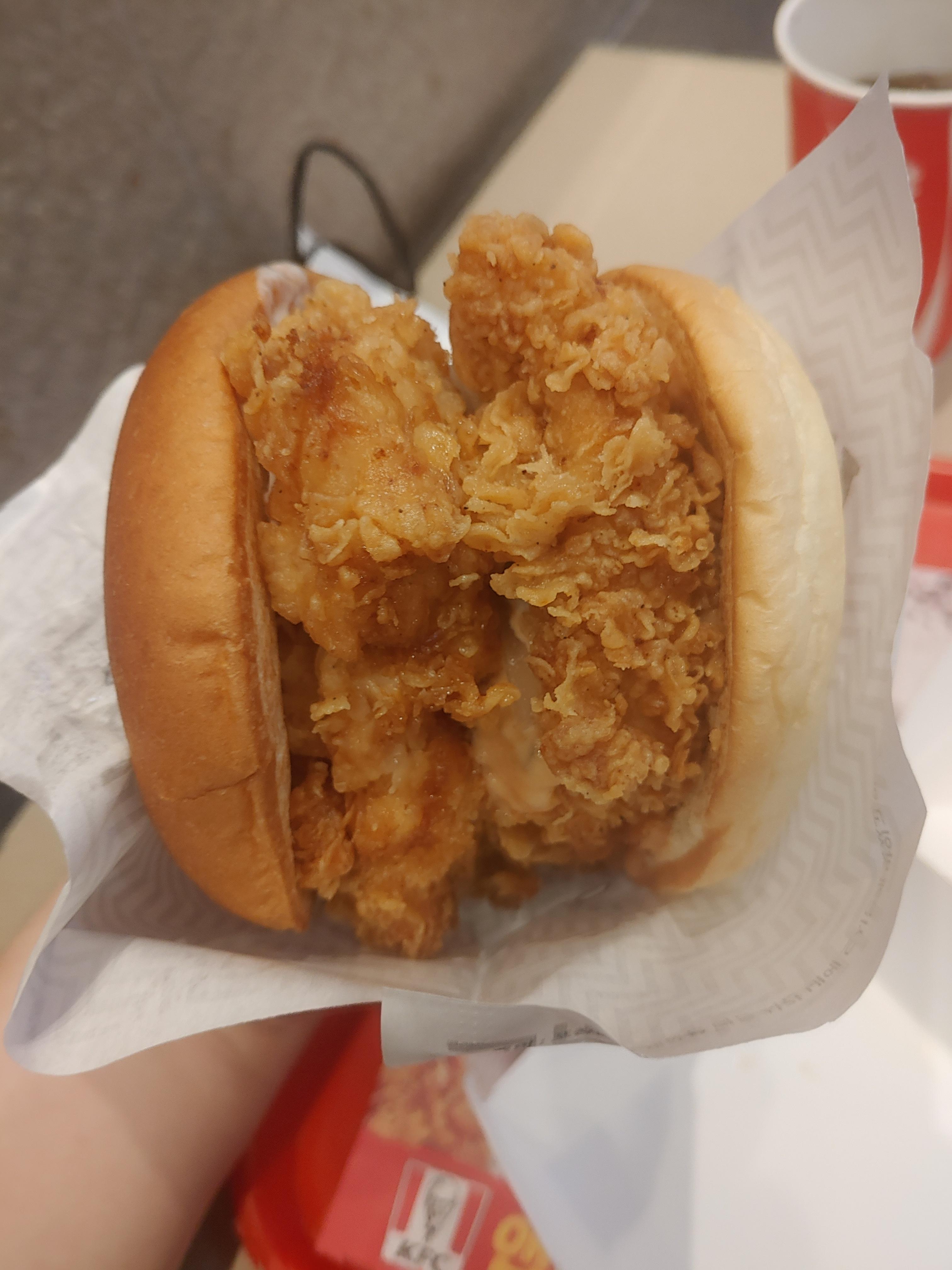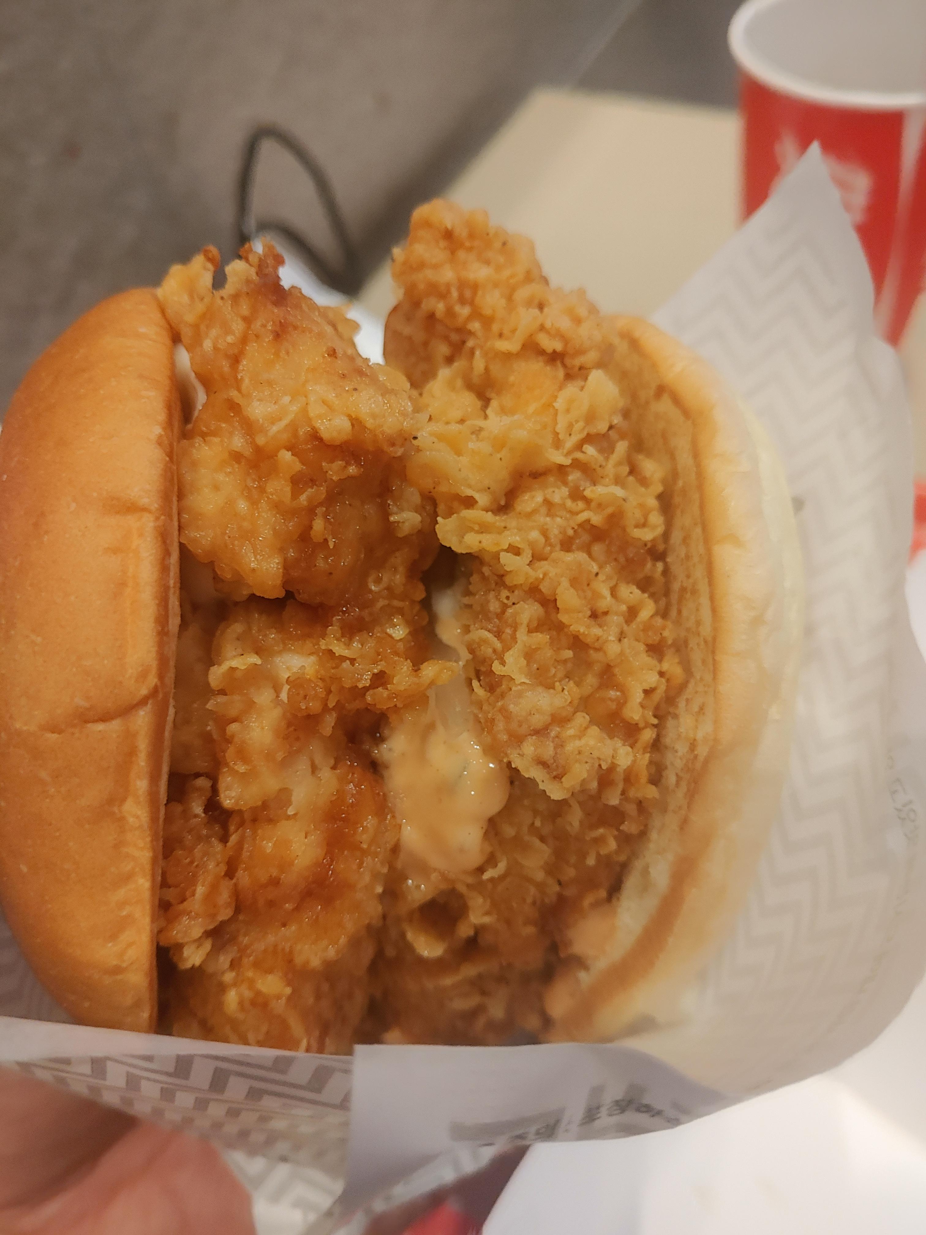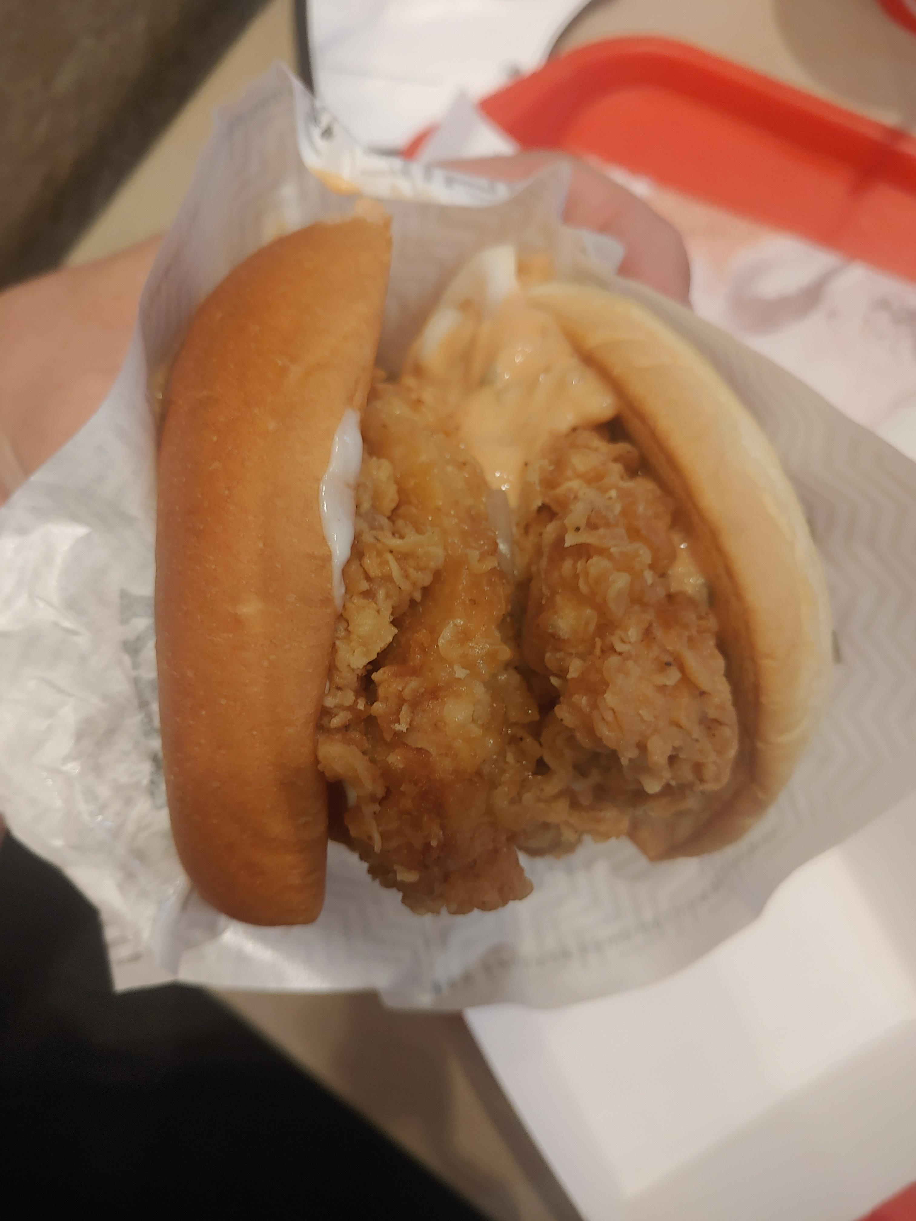 몰론 개인적으로 더블다운맥스와 같은 정도의 고기와 고기가 고기를 둘러싼 그런 느낌까지는 아니었지만 그만큼 엄청난 버거가 나왔구나 싶었는데요. 더블치킨패티라서 그런지 확실히 사이즈가 엄청 커서 한입에 먹기 좀 힘들기도 했습니다.