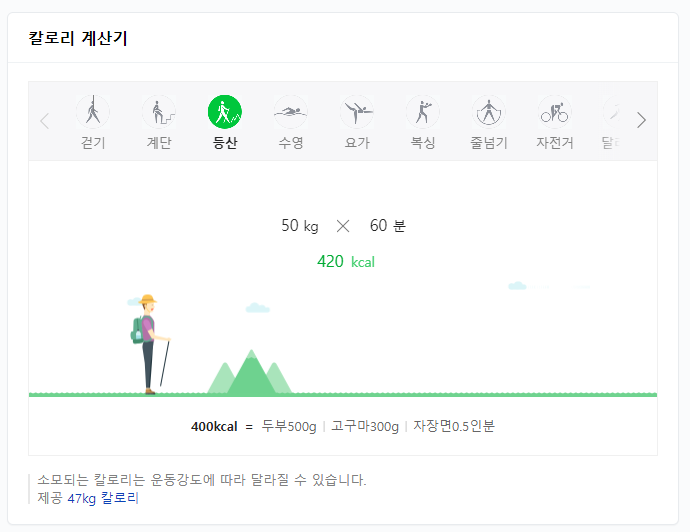 대략적으로 알려진 대로는 성인남성을 기준으로 등산 1시간에 630kcal 정도가 소모된다고 하는데요. 네이버 칼로리 계산기를 활용했을 경우 50kg의 여성분이라면 60분 등산에 420kcal 정도 소모가 된다고 합니다. 소모되는 칼로리의 경우에는 등산을 지속하는 시간과 운동강도에 따라서 달라질 수 있습니다.