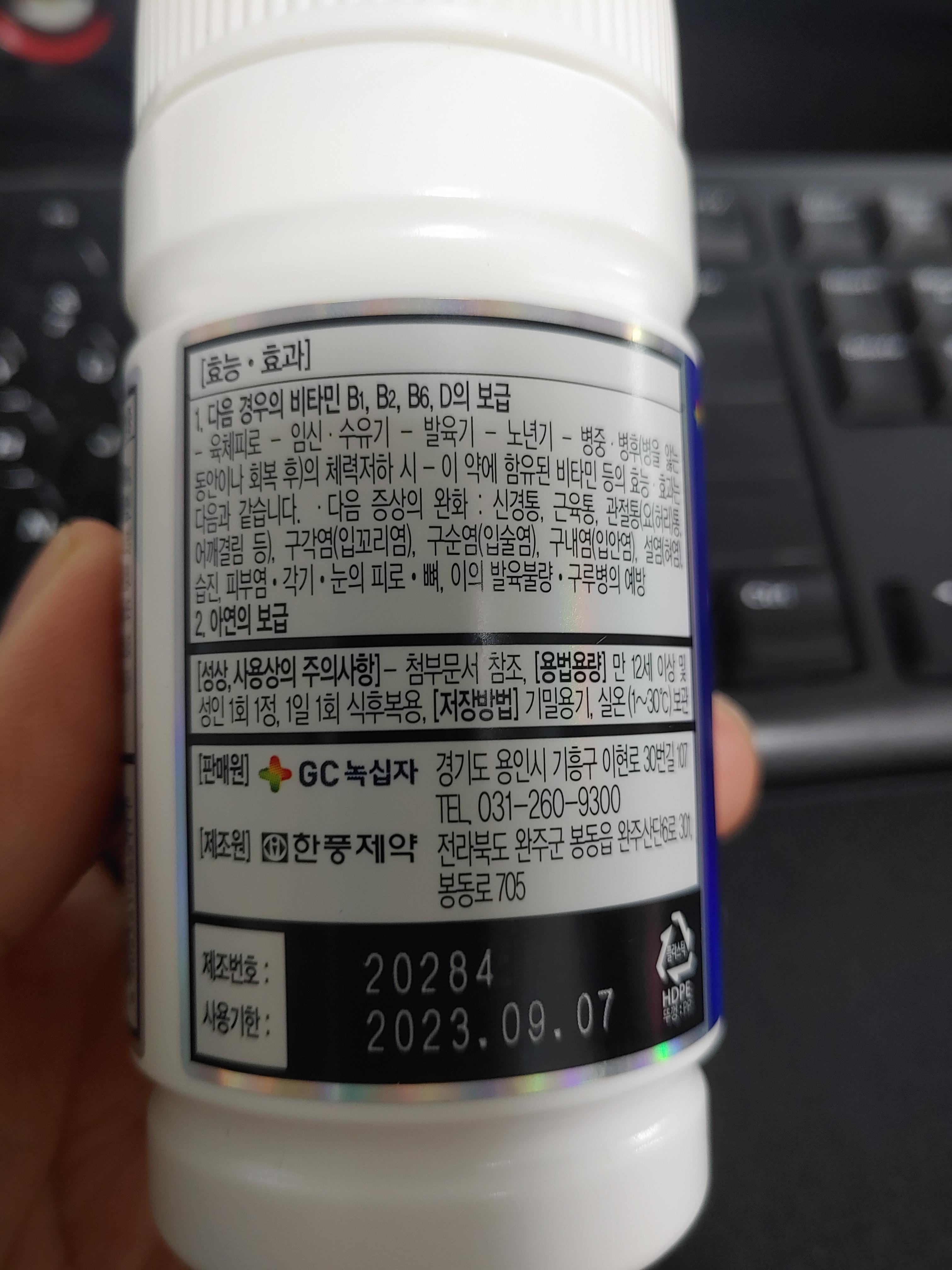 주요 성분들은 사진에 나와있는 내용대로 나와있는데요. 비타민 D, 벤포티아민 (B1), 비스벤티아민 (B1), 시아노코발라민(B12)가 주요 성분으로 피로회복, 신경통-근육통-관절통 완화, 체력 저하, 눈의 피로, 아연의 보급, 구내염, 설염, 피부염 등에 효과가 있다고 합니다.