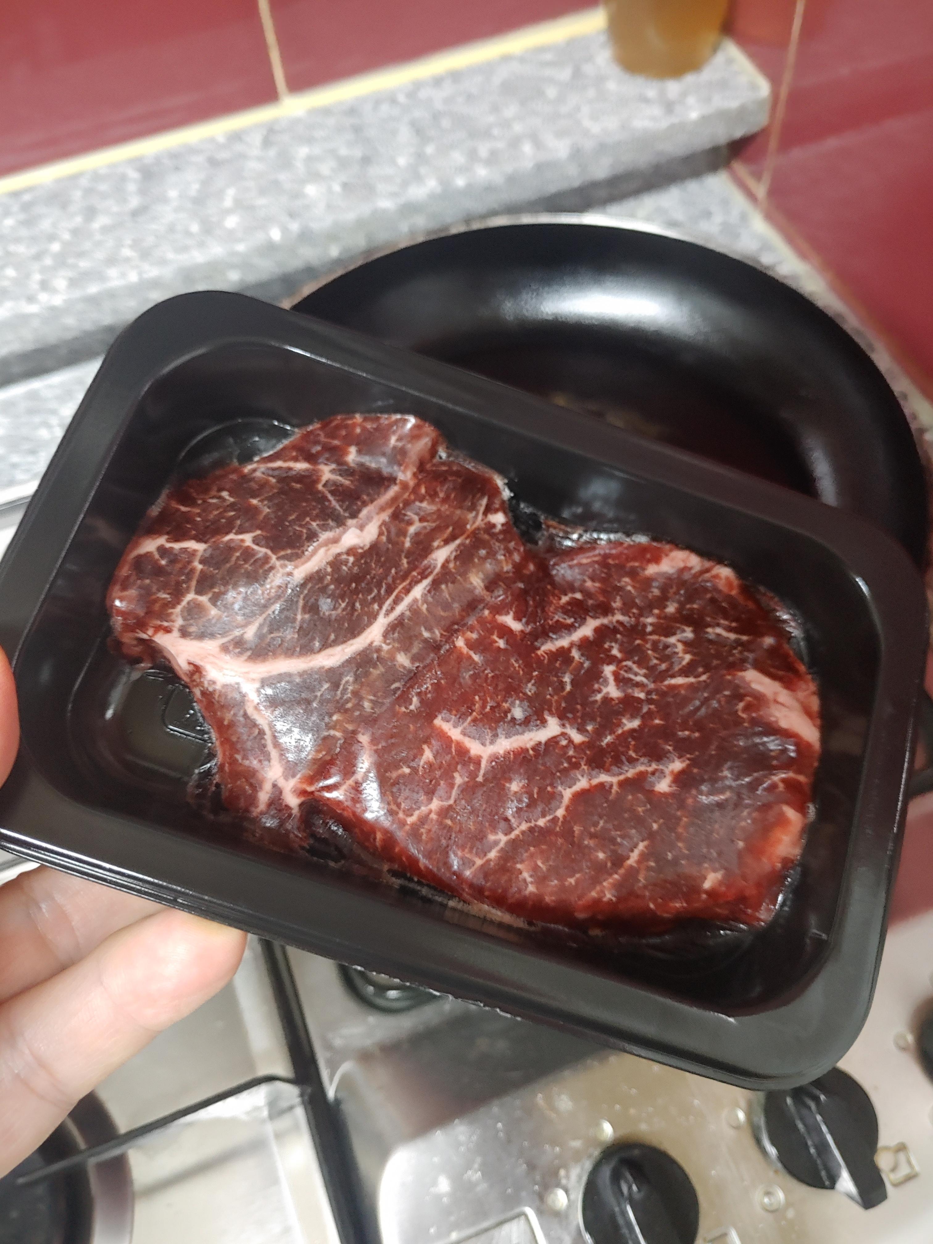 개인적으로 소고기는 미디엄 웰던 정도로 먹는것을 좋아하는 편이라서 그냥 적당하게 구워주었어요. 생각보다 스테이크형으로 나와서 그런지 두께감이 있어서 육즙이 상당하더라구요. 구웠는데 웰던하게 구워도 약간 미디엄 느낌으로 구워지는 것 같은 부분들도 있었어요.