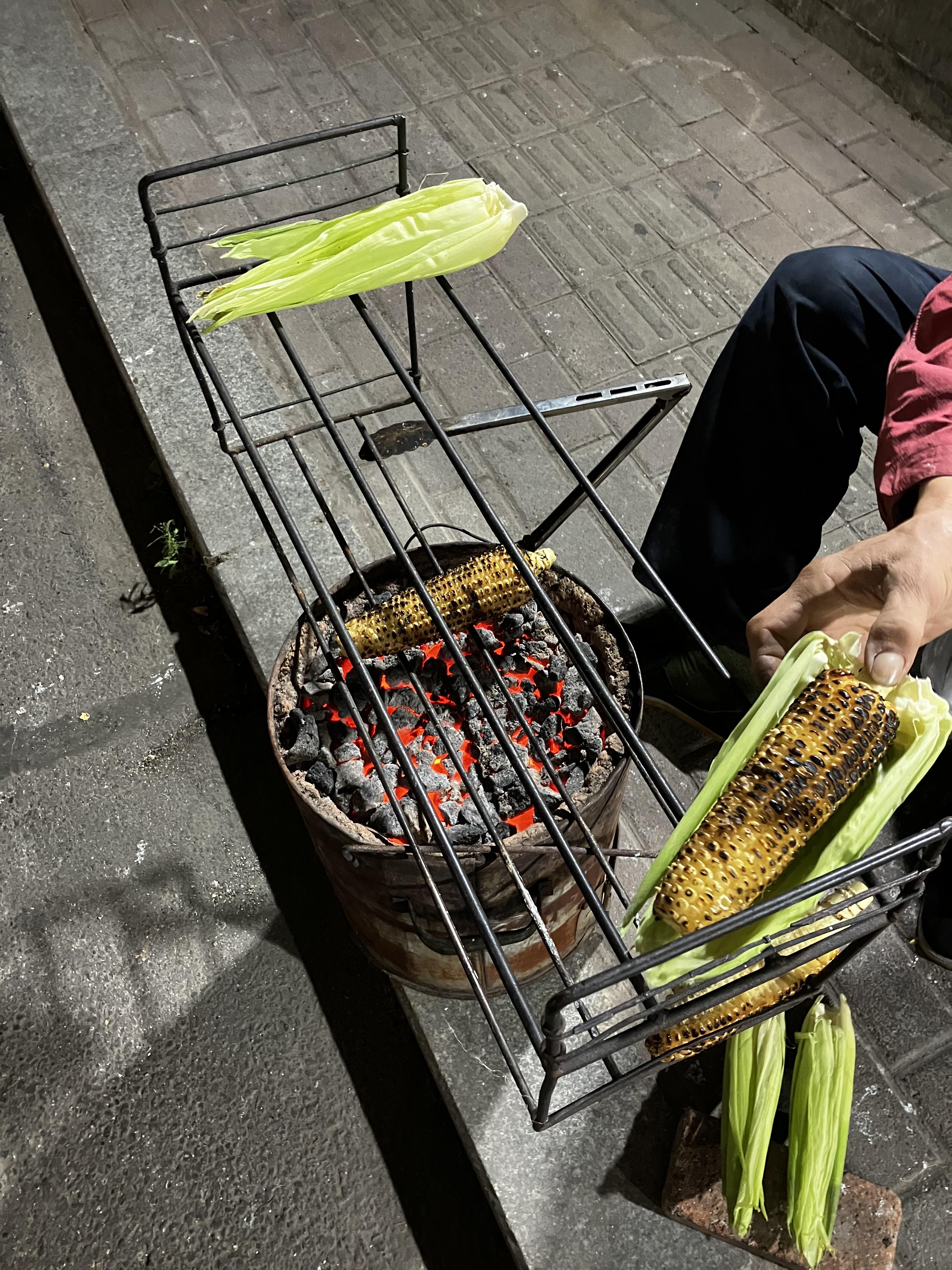 사진을 보면 아시겠지만 숯불에 그냥 다른 것 없이 좋은 옥수수를 굽기만 하는데.... !! 냄새가 엄청 나더라구요. 이곳은 서탑거리 근처에 다리 아래로 길이 있는 곳 근처에 위치한 곳이에요. 해당 골목으로 쭉 가면 서탑거리가 나오는데 이쪽으로 지나가는 사람들, 자전거, 오토바이가 모두 잠깐 멈출 수 있는 엄청난 냄새를 맡을 수 있는 ㅋㅋ 곳이기도 했습니다.
