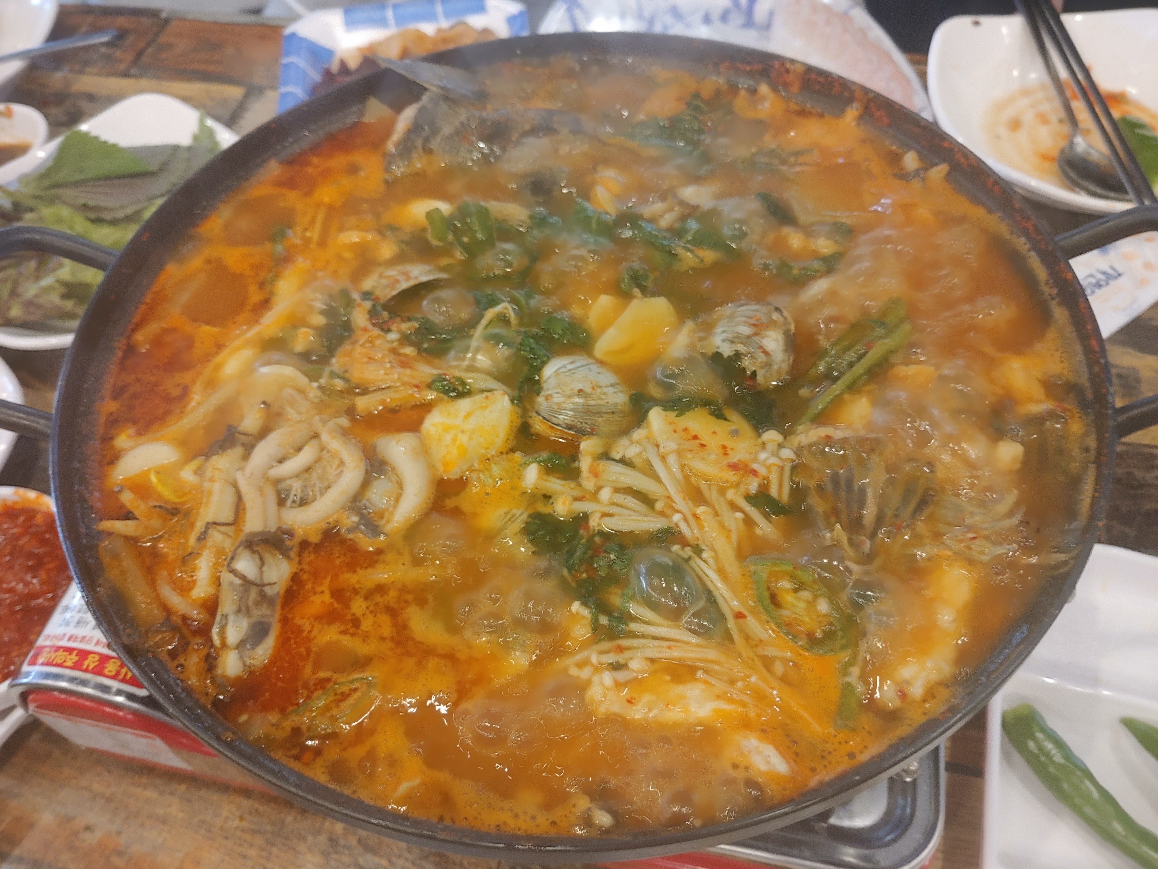 기본 상차림 비용만 내면 기본찬들을 직접 가져다 먹을 수 있어요. 그외에 다른 세팅도 가능하구요. 해물탕은 아마 횟감쪽에서 해물탕거리해서 따로 하면 추가비용내고 해먹을 수 있어요.