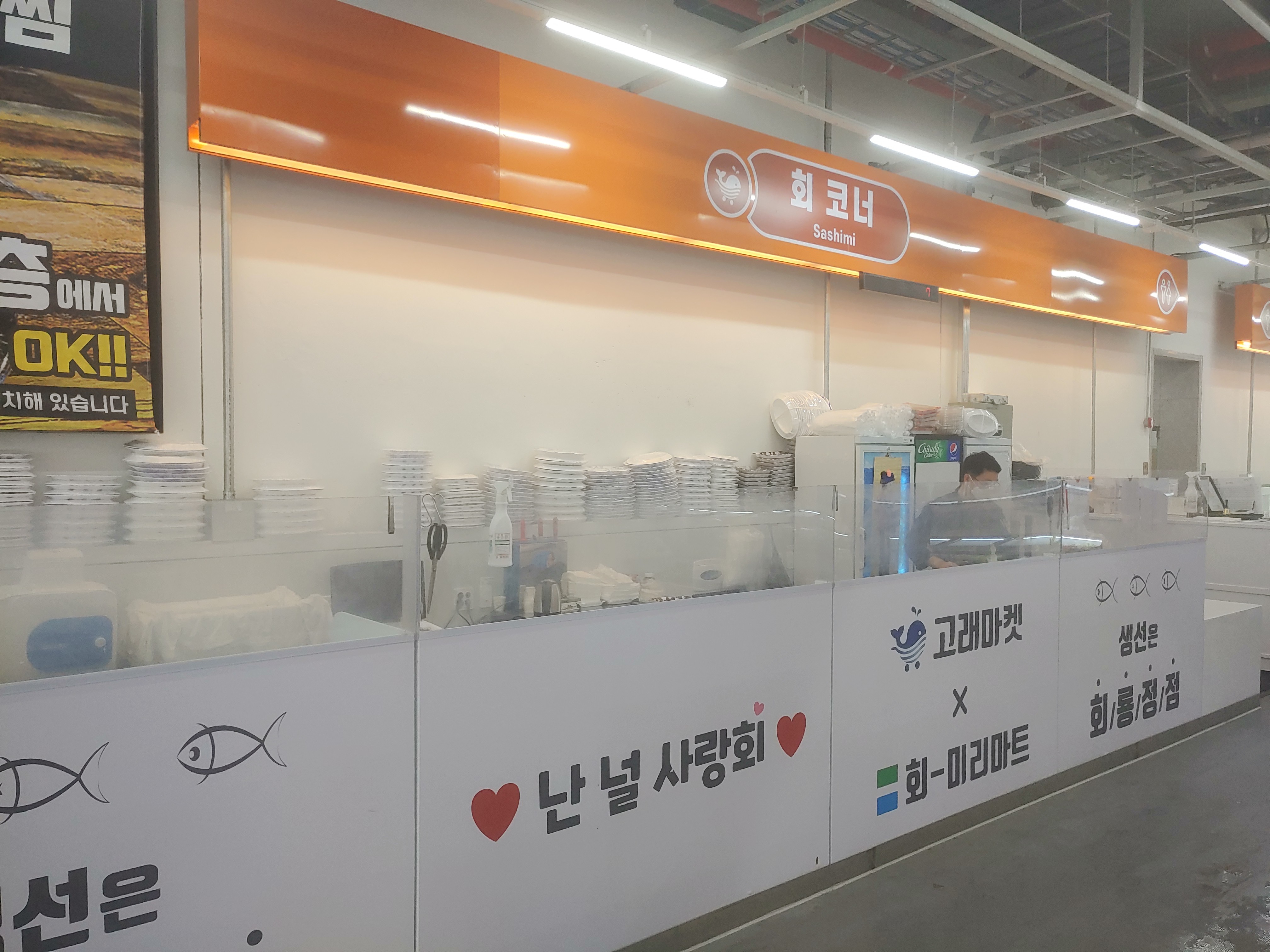 이렇게 회코너에서 준비해서 포장해갈수도 있고, 바로 옆 동에서 상차림 비용도 내고 먹을수도 있더라구요. 확실히 이런 부분은 깔끔하게 정비가 잘 되어 있는 고래마켓의 장점인것 같습니다