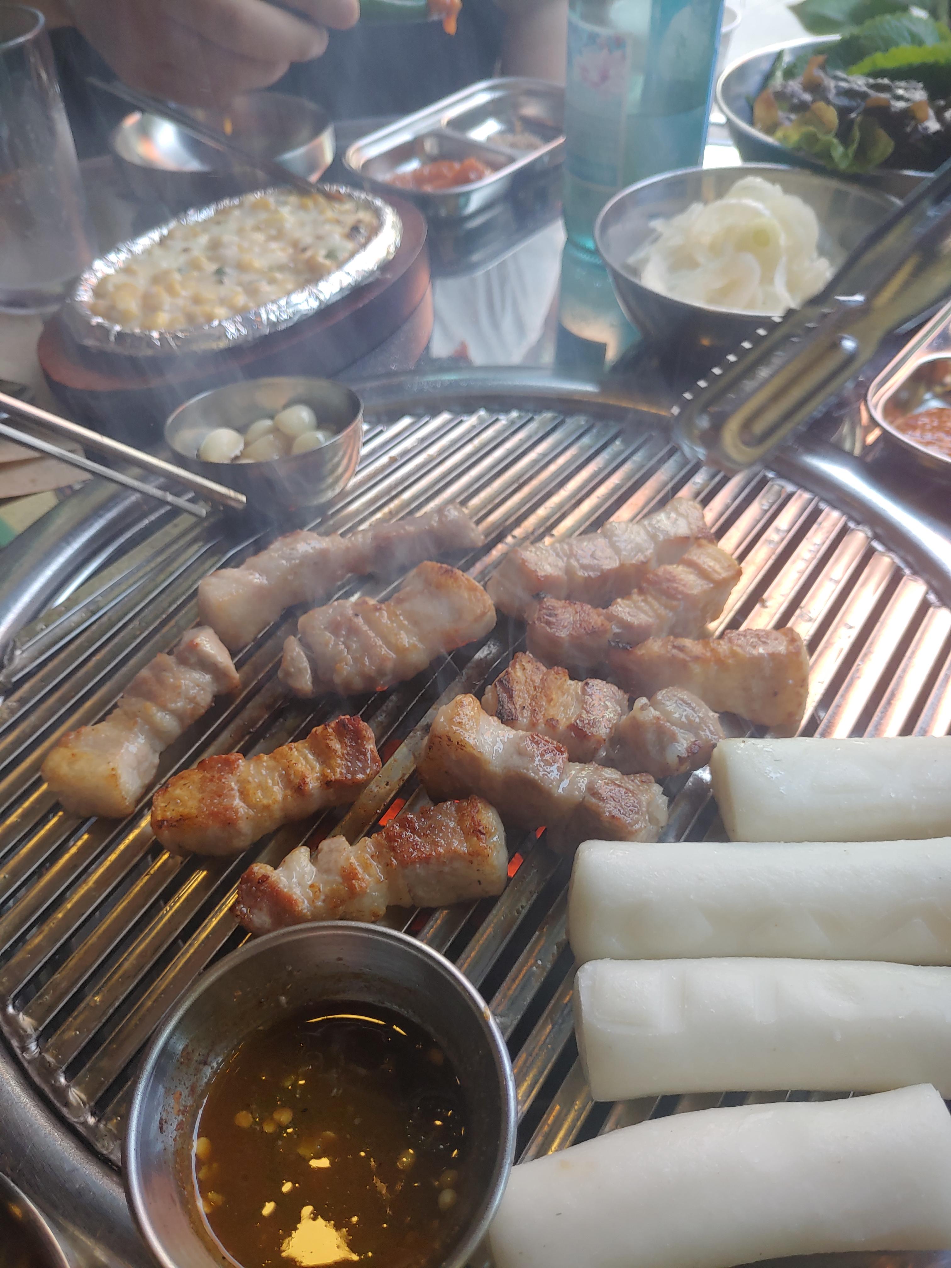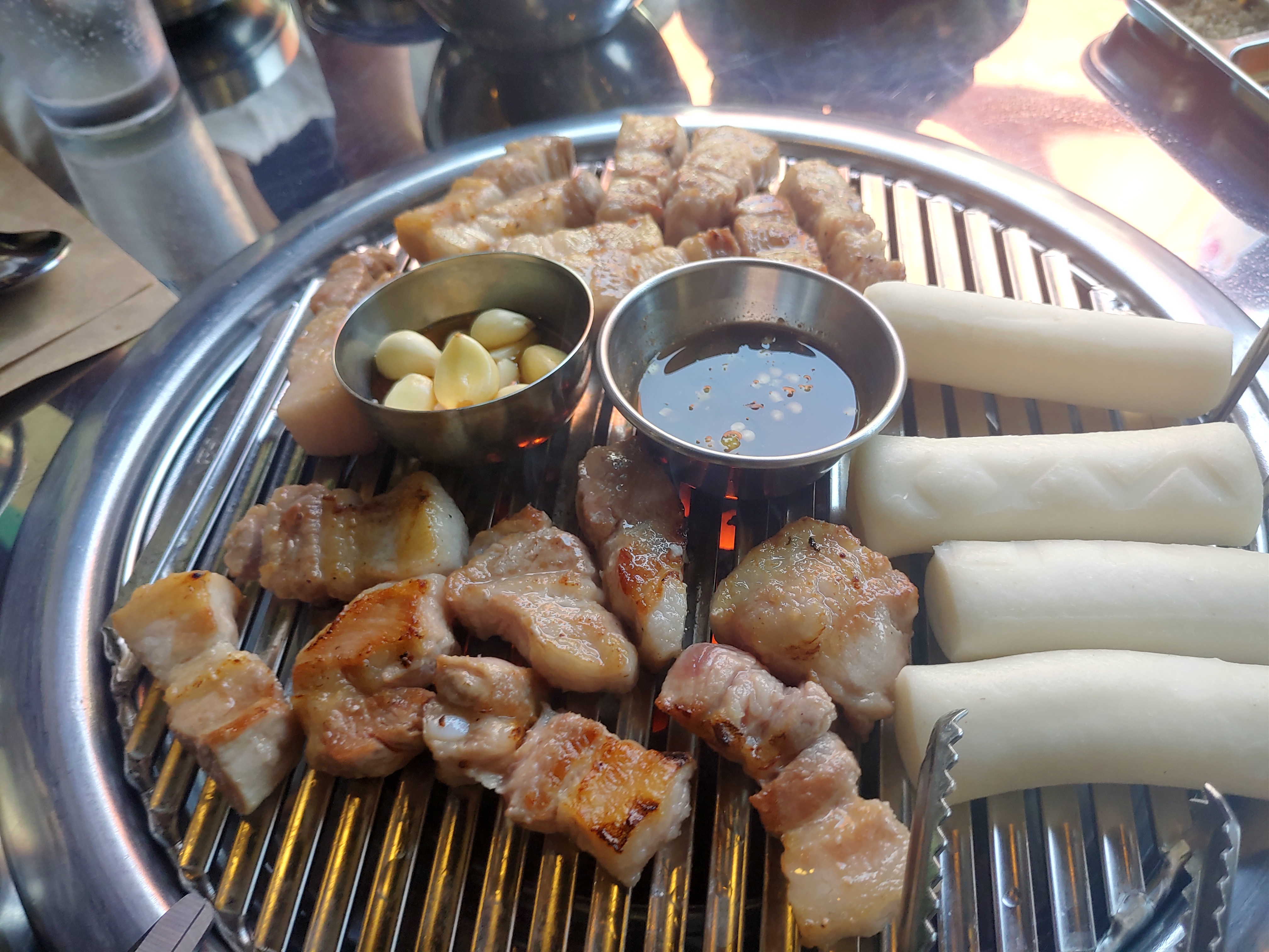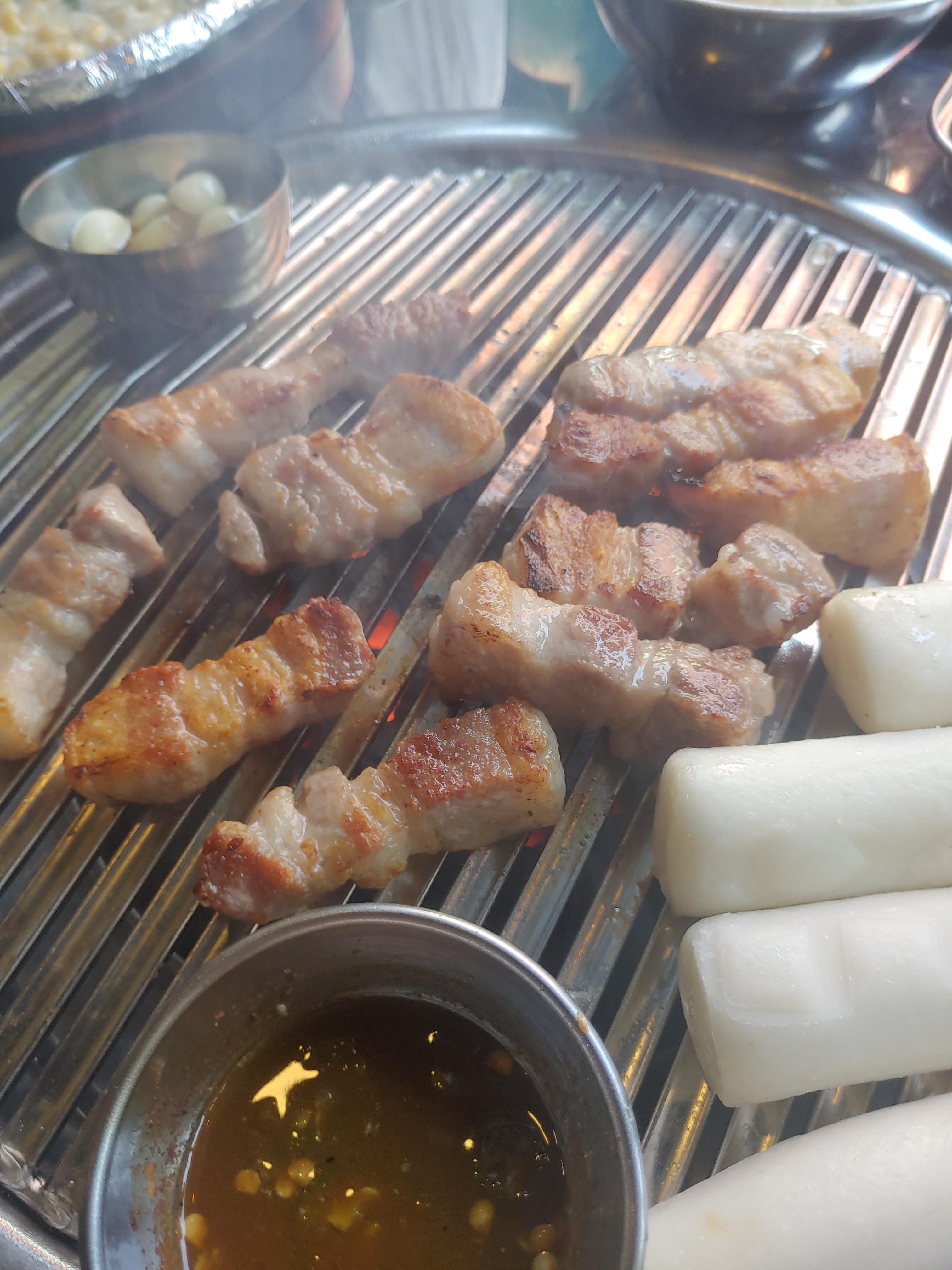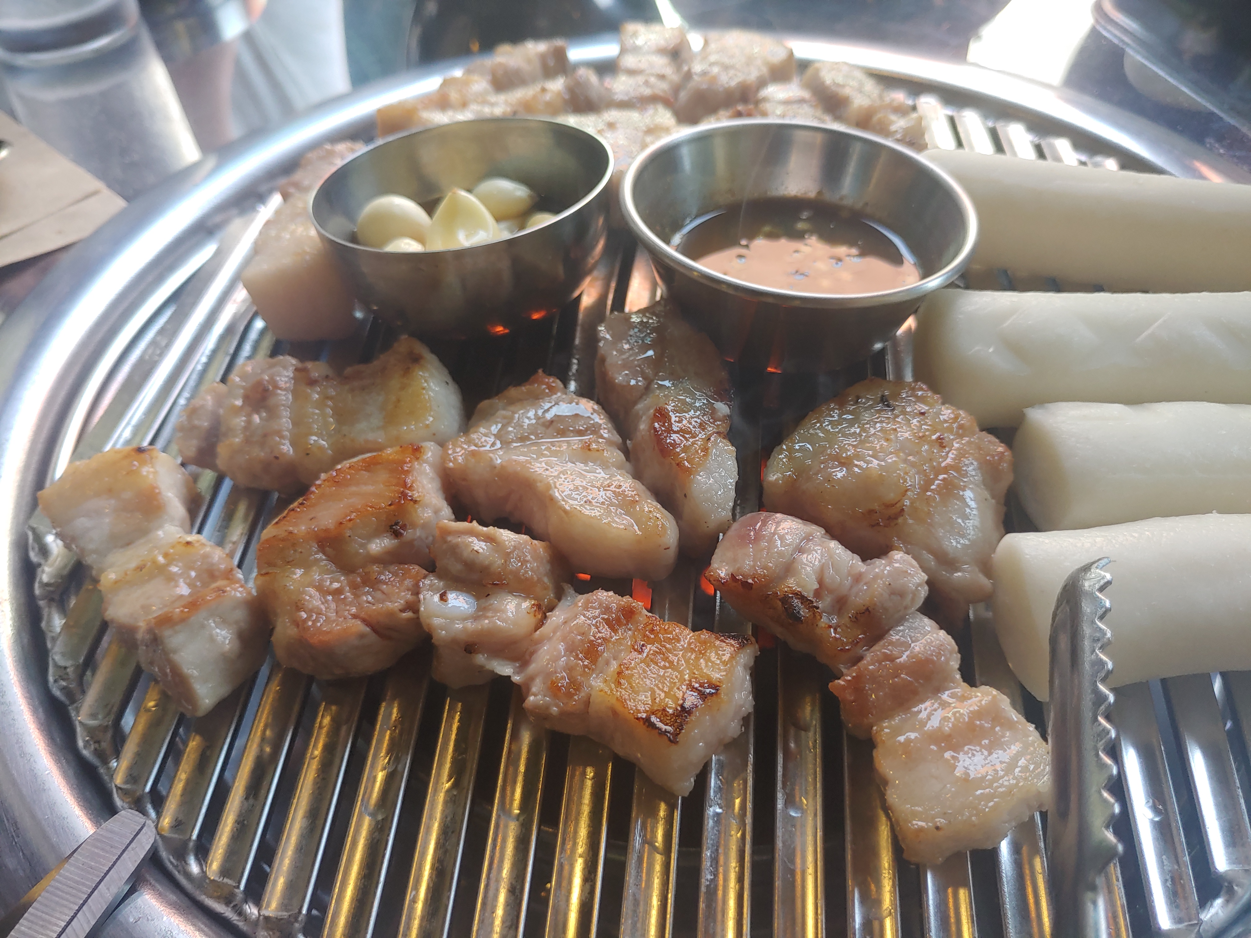삼겹살에 멜젓, 그리고 마늘구이에 떡까지. 이런저런 세팅이 완료되고 고기가 올라가고, 초벌된 고기를 마무리 구이만 해서 드시면 됩니다 ㅋ 고기가 엄청 두툼한데요. 두툼한 삼겹살은 육즙이 잘 살아있고 해서 좋죠 ^^