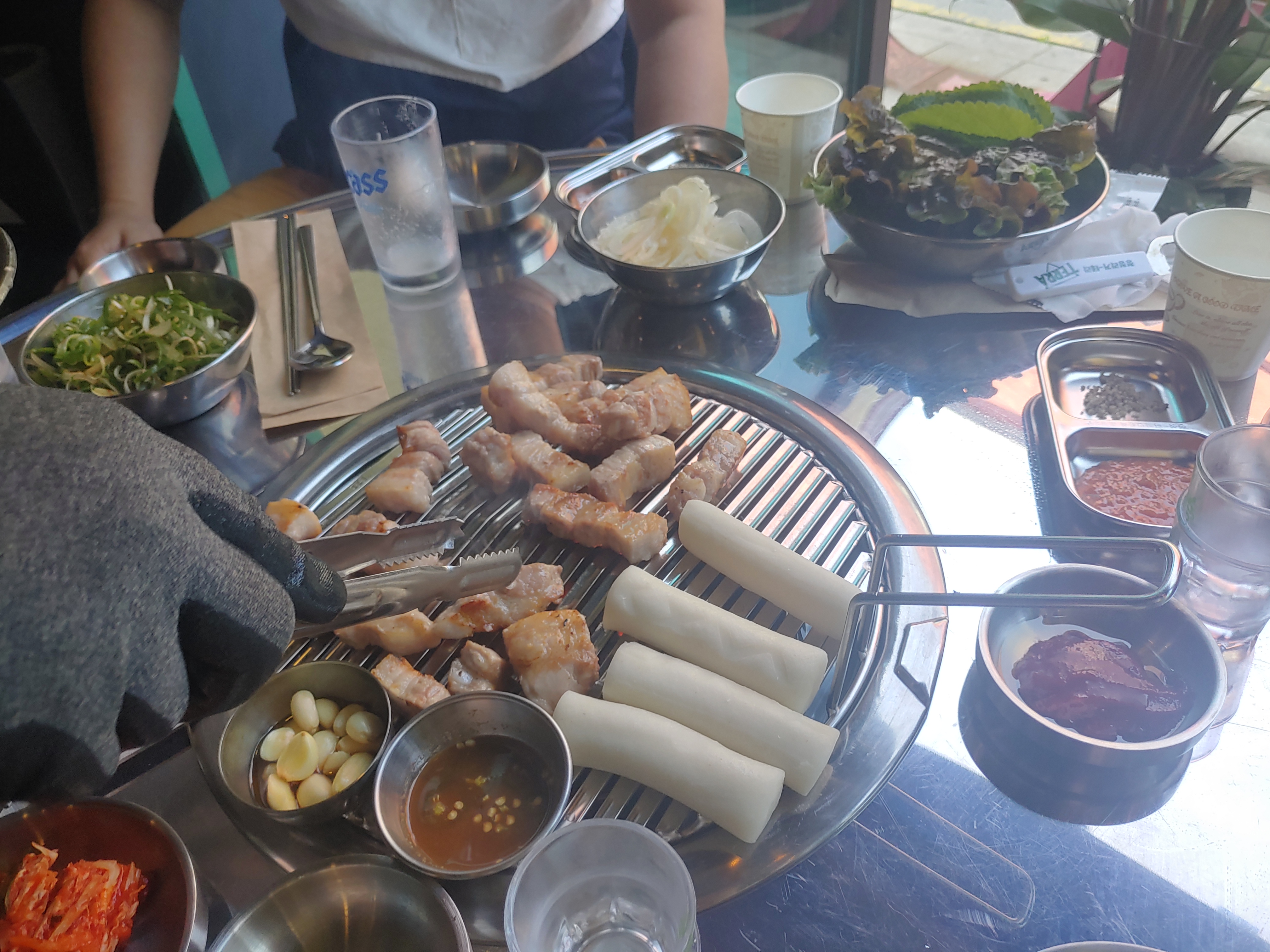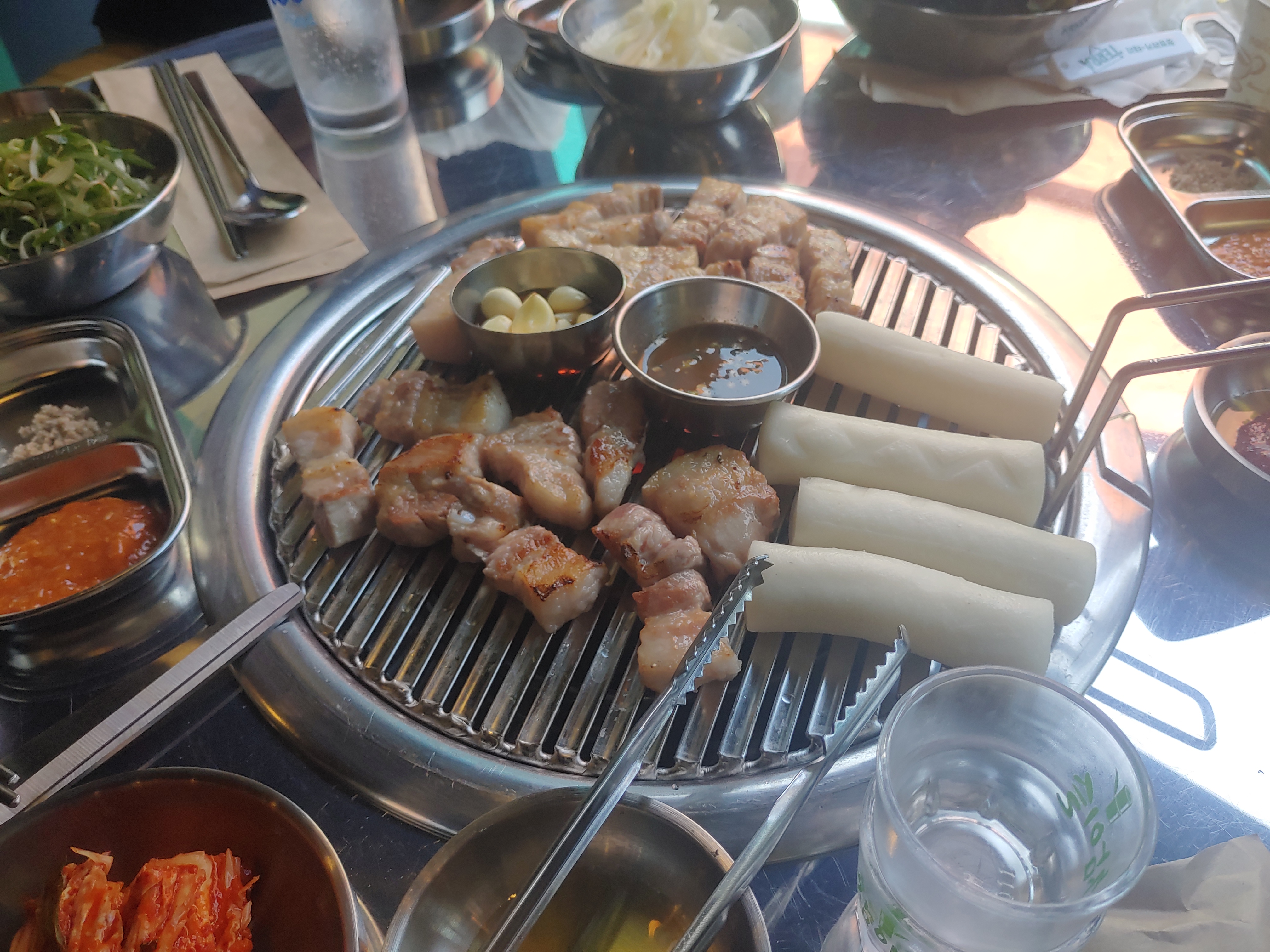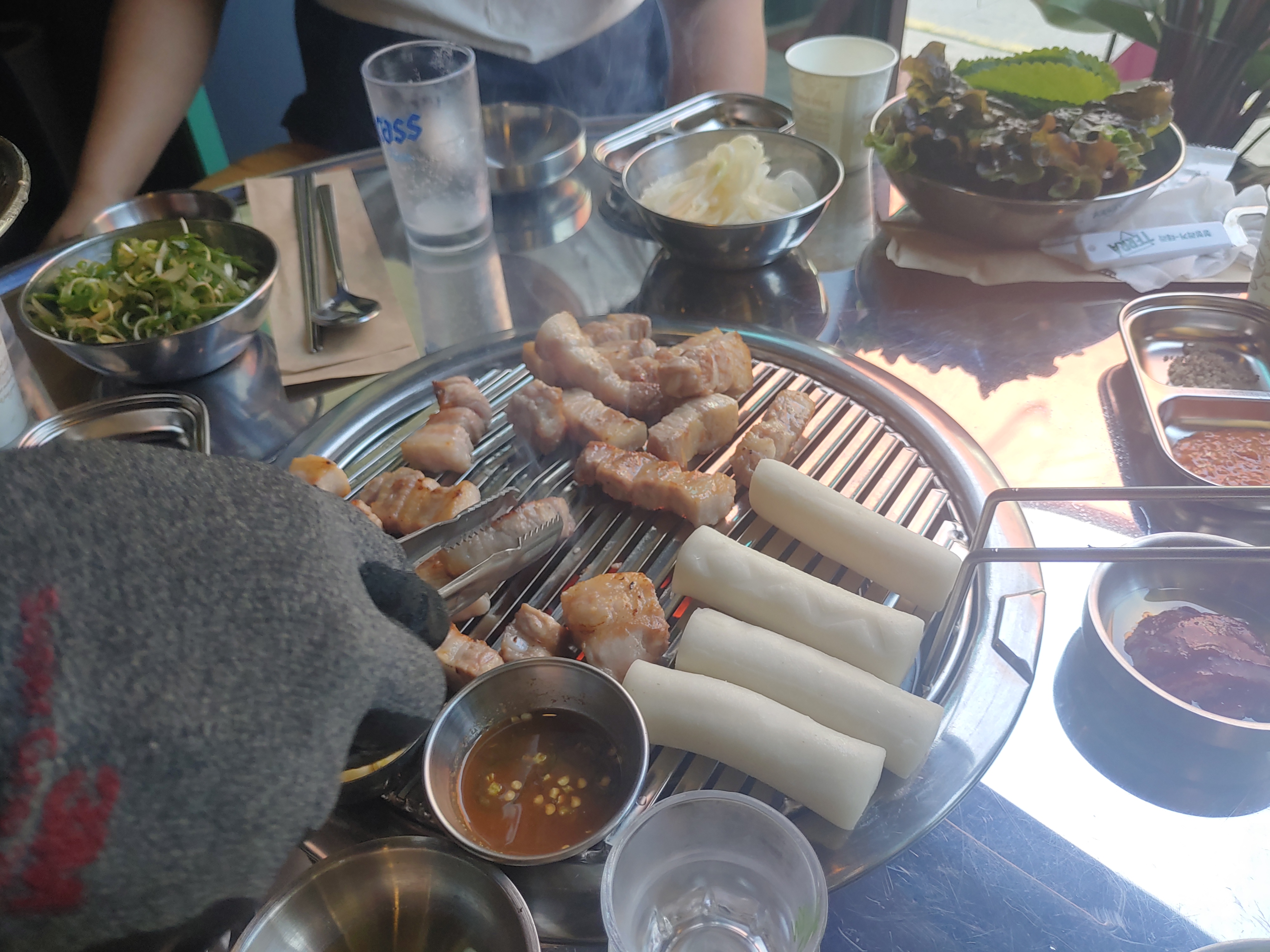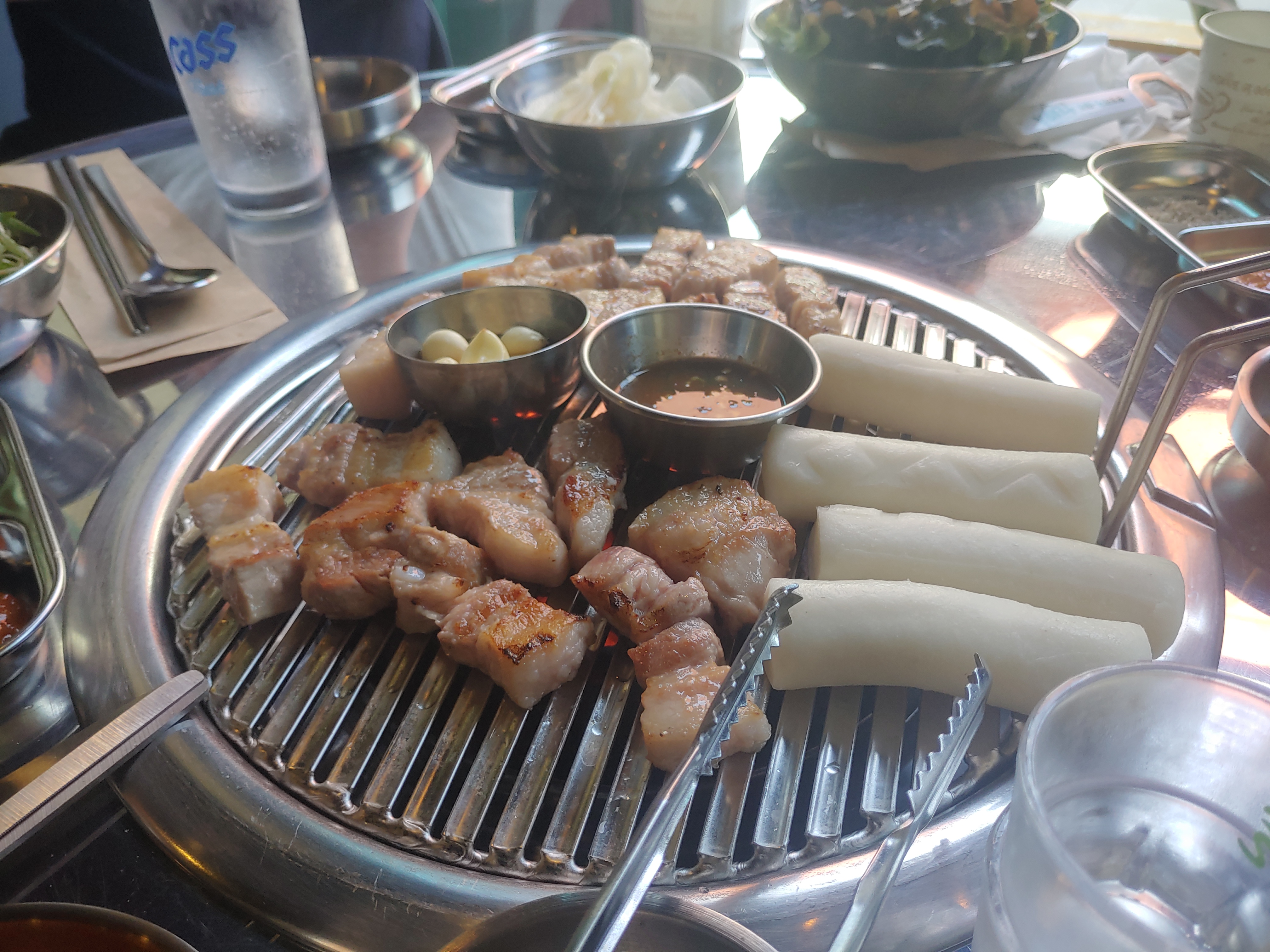 삼겹살에 멜젓, 그리고 마늘구이에 떡까지. 이런저런 세팅이 완료되고 고기가 올라가고, 초벌된 고기를 마무리 구이만 해서 드시면 됩니다 ㅋ 고기가 엄청 두툼한데요. 두툼한 삼겹살은 육즙이 잘 살아있고 해서 좋죠 ^^