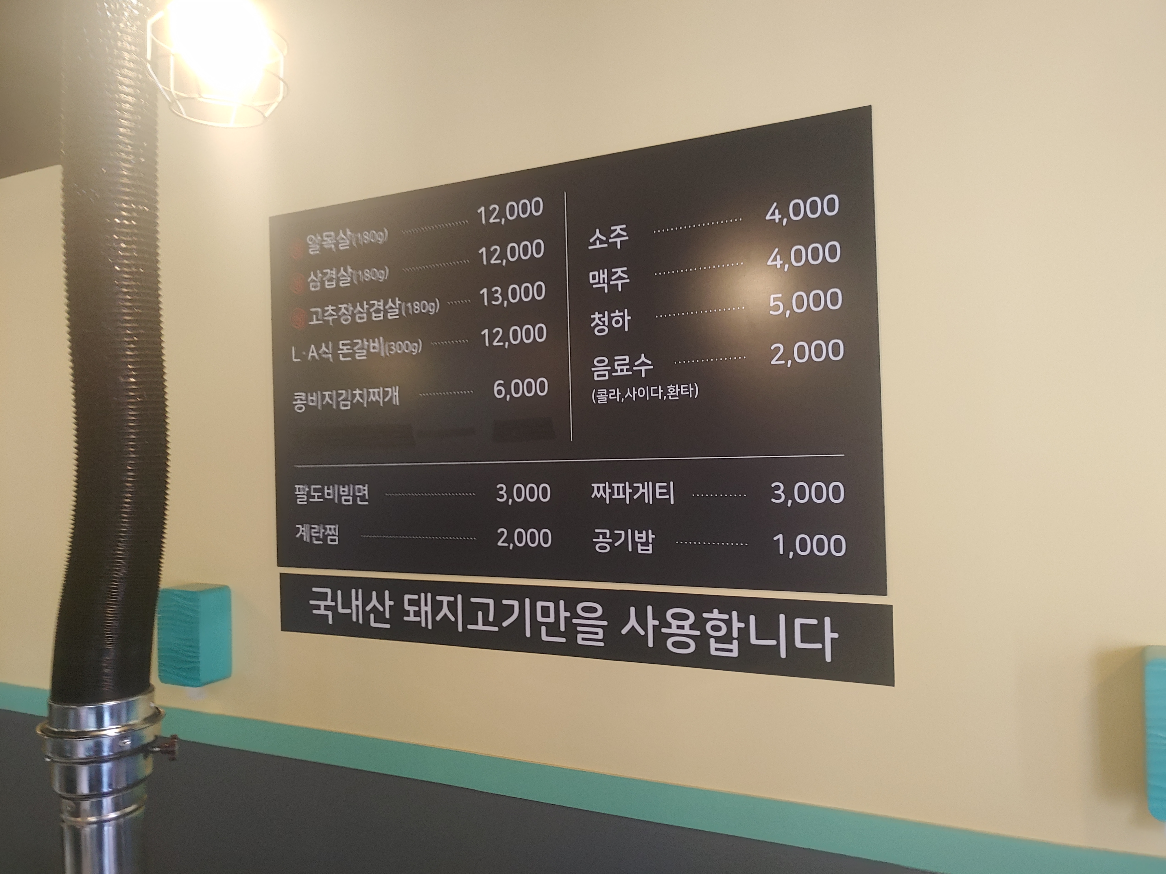 다른 반찬들이 굉장히 신기해요 ㅋ 일반적으로 고깃집은 원래 된장찌개나 김치찌개밖에 없는데 여기는 콩비지 김치찌개 그리고 팔도비빔면과 짜파게티까지 좀 신기한 메뉴들이 있었습니다