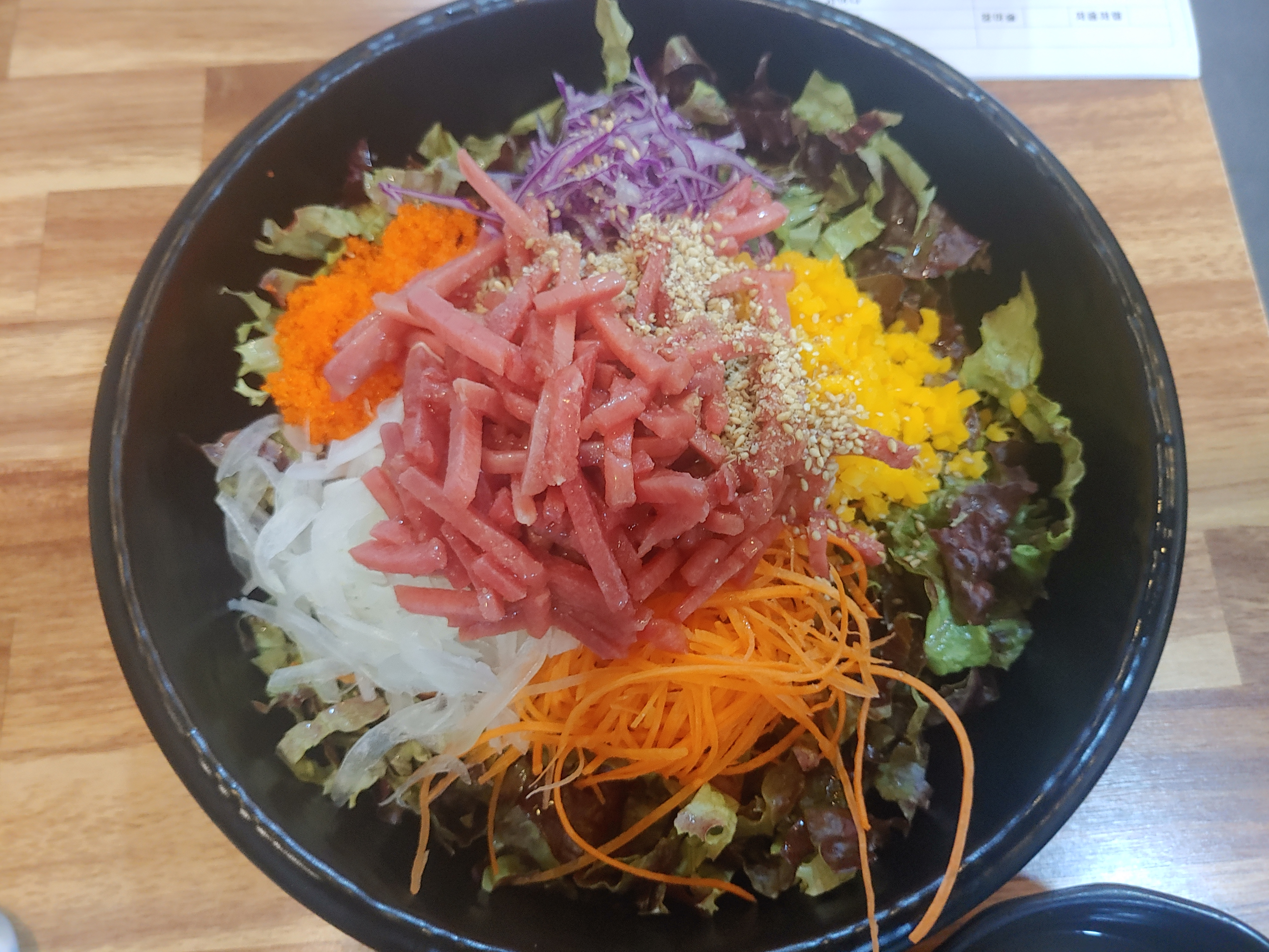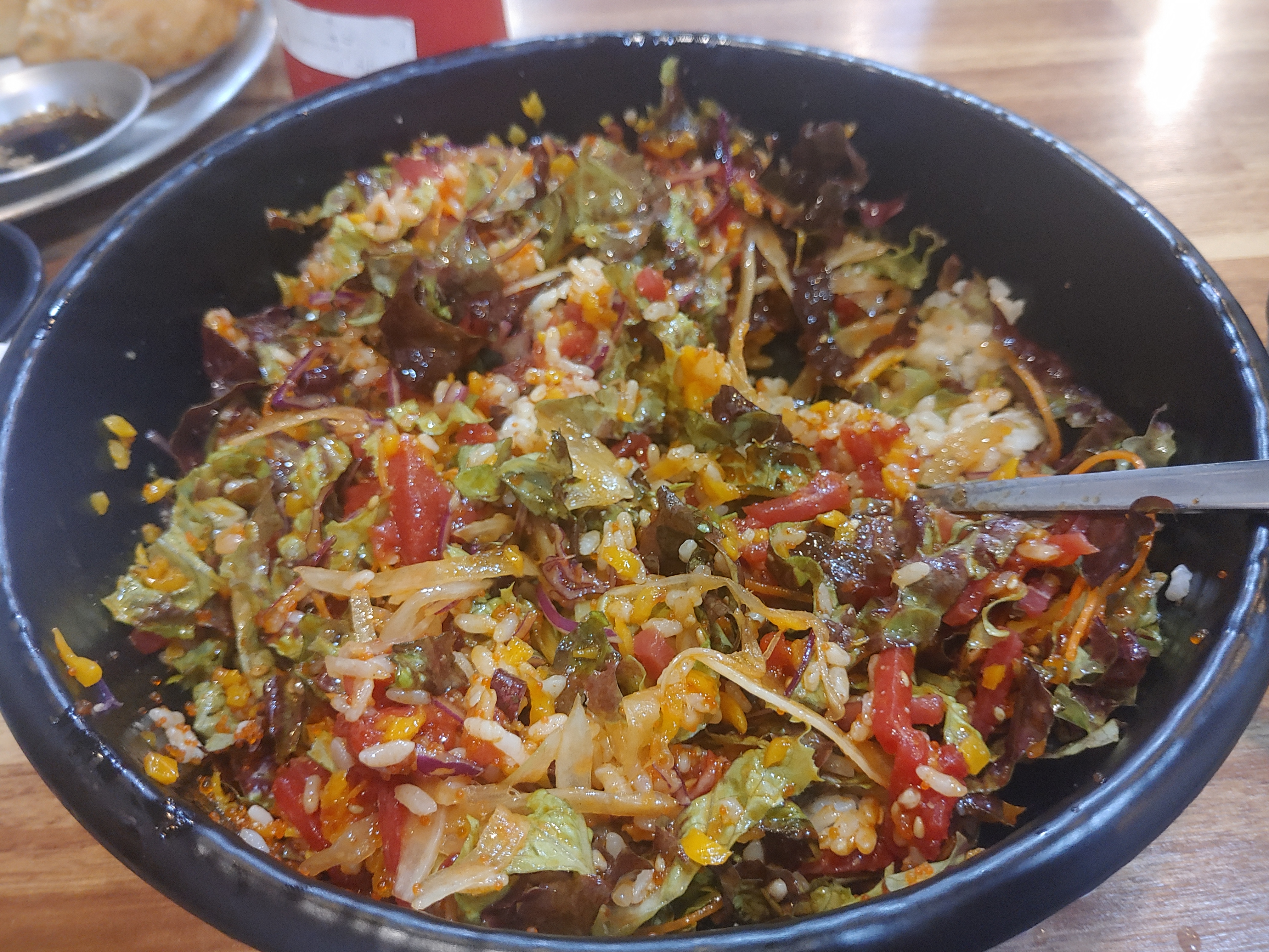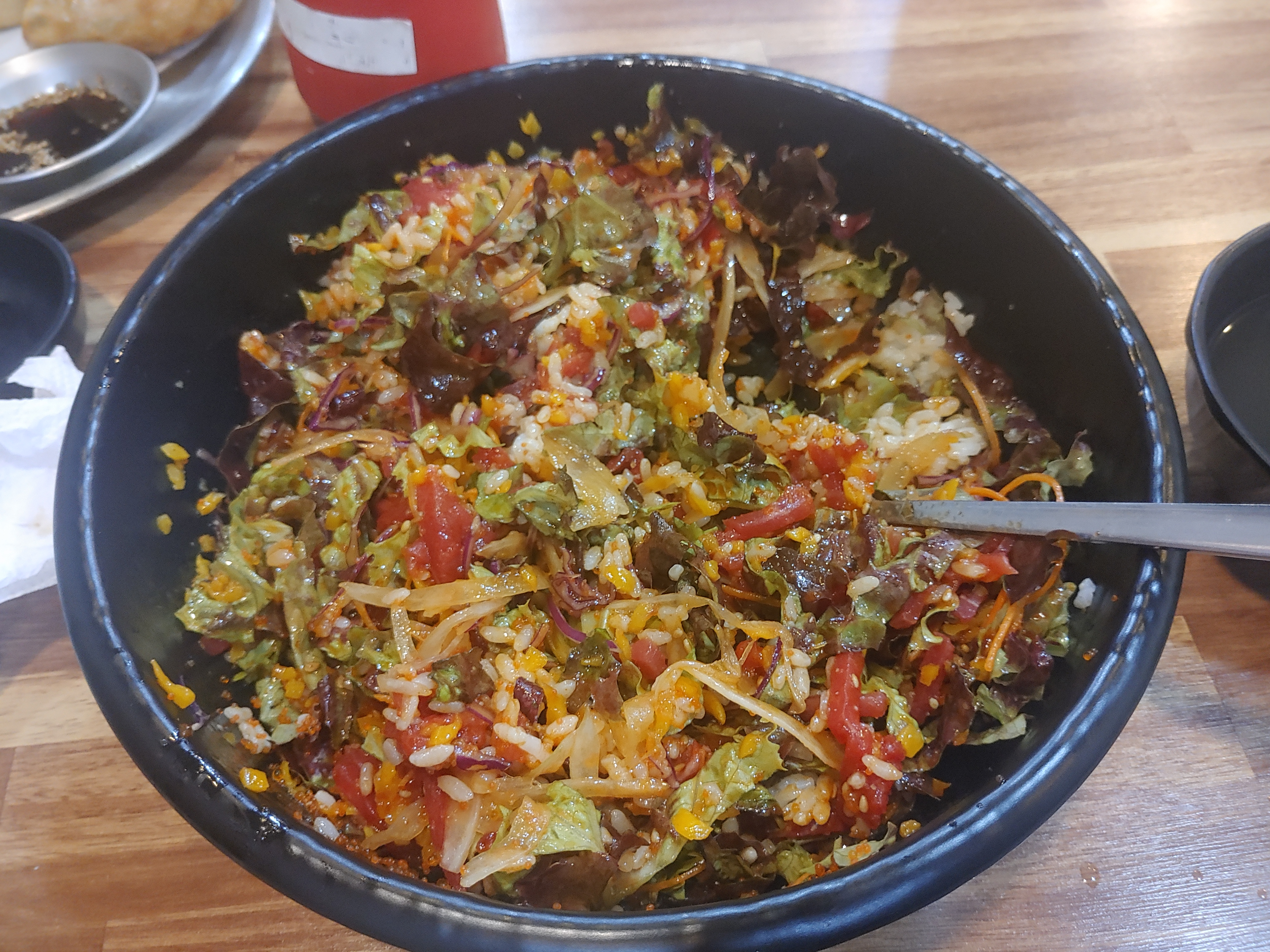 잘 비벼서 먹는 비빔밥, 나물이 아니어도 참 맛있구나 생각이 들었던 비빔밥이에요 ㅎㅎ 비빔밥에 들어가는 장도 그렇고 야채도 그렇고 약간 상큼한 느낌이기도 해요. 육회가 씹히는 것은 플러스 요소구요