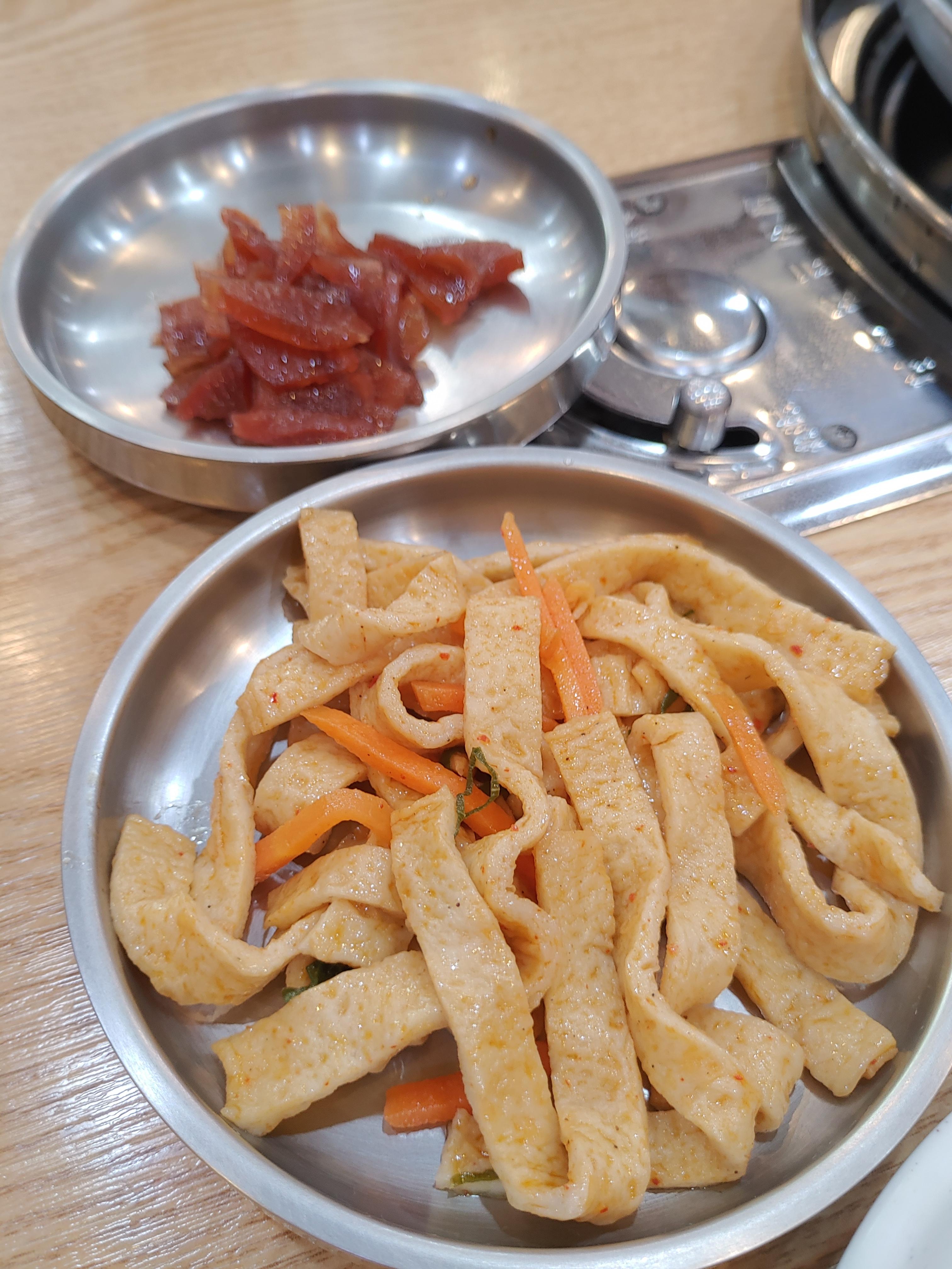 기본찬과 부대찌개가 담겨서 나오는데요 ~ 부대찌개는 나오면 저는 개인적으로 좀 졸여서 먹는 편이에요. 국물이 김치찌개처럼 부대찌개도 많이 끓이다보면 맛이 점점 진해지는데요. 국물이 잘 만들어지면 그때 먹으면 정말 맛있어요.