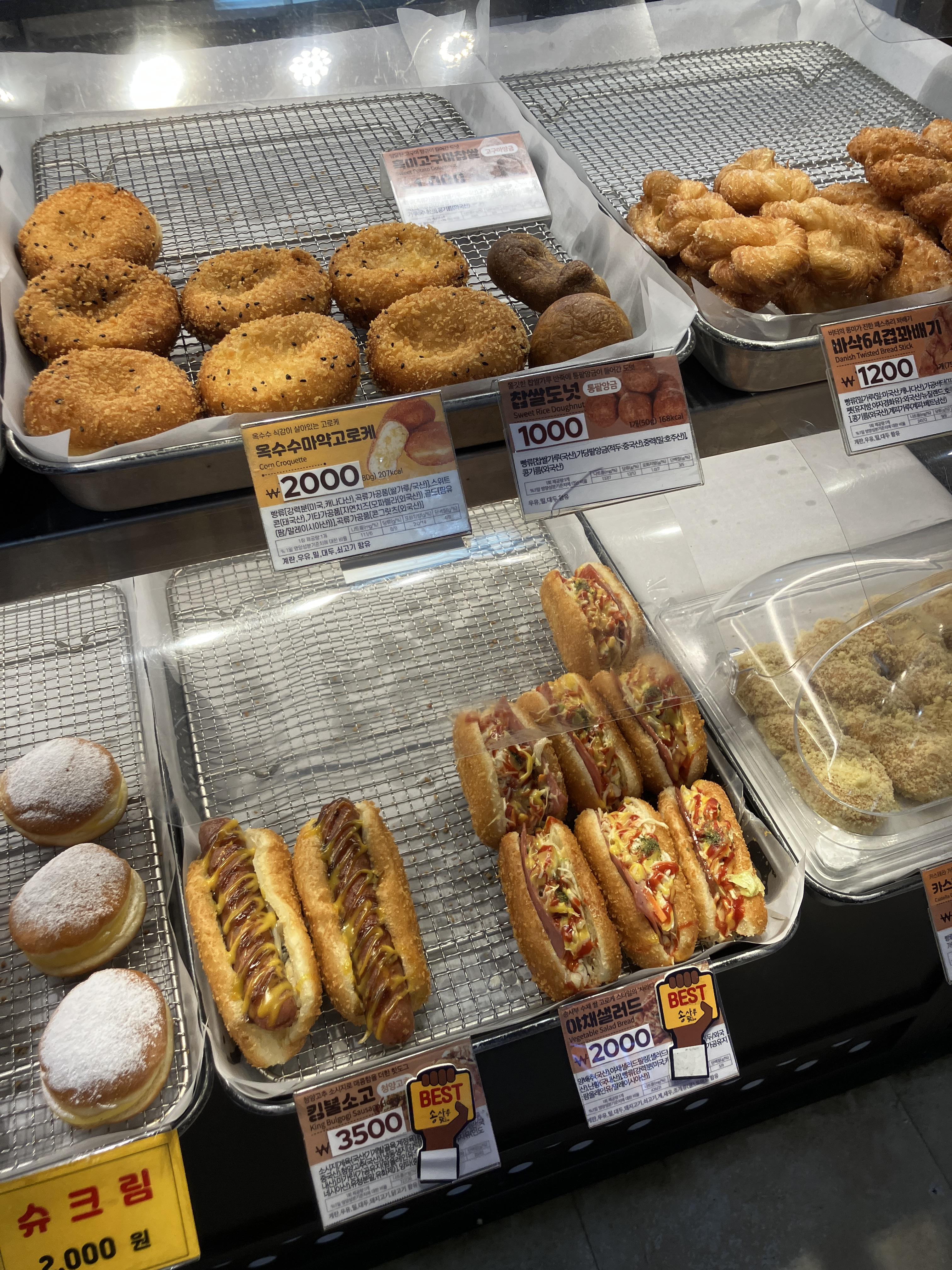 이외에도 요새 유행이라고 하는 우유크림 도넛이나 슈크림들도 생겼더라구요. 그리고 야채샐러드 고로케와 같은 것들 종류별로 다양하게 맛볼 수 있는 것들이 있었습니다. 야채샐러드도 뭔가 추억의 맛이라고 할 수 있는데요. 예전에 시장 같은곳들 가보면 고로케빵에 야채와 케챱이 뿌려진 저런 빵 참 맛있게 먹은 기억들이 있습니다.