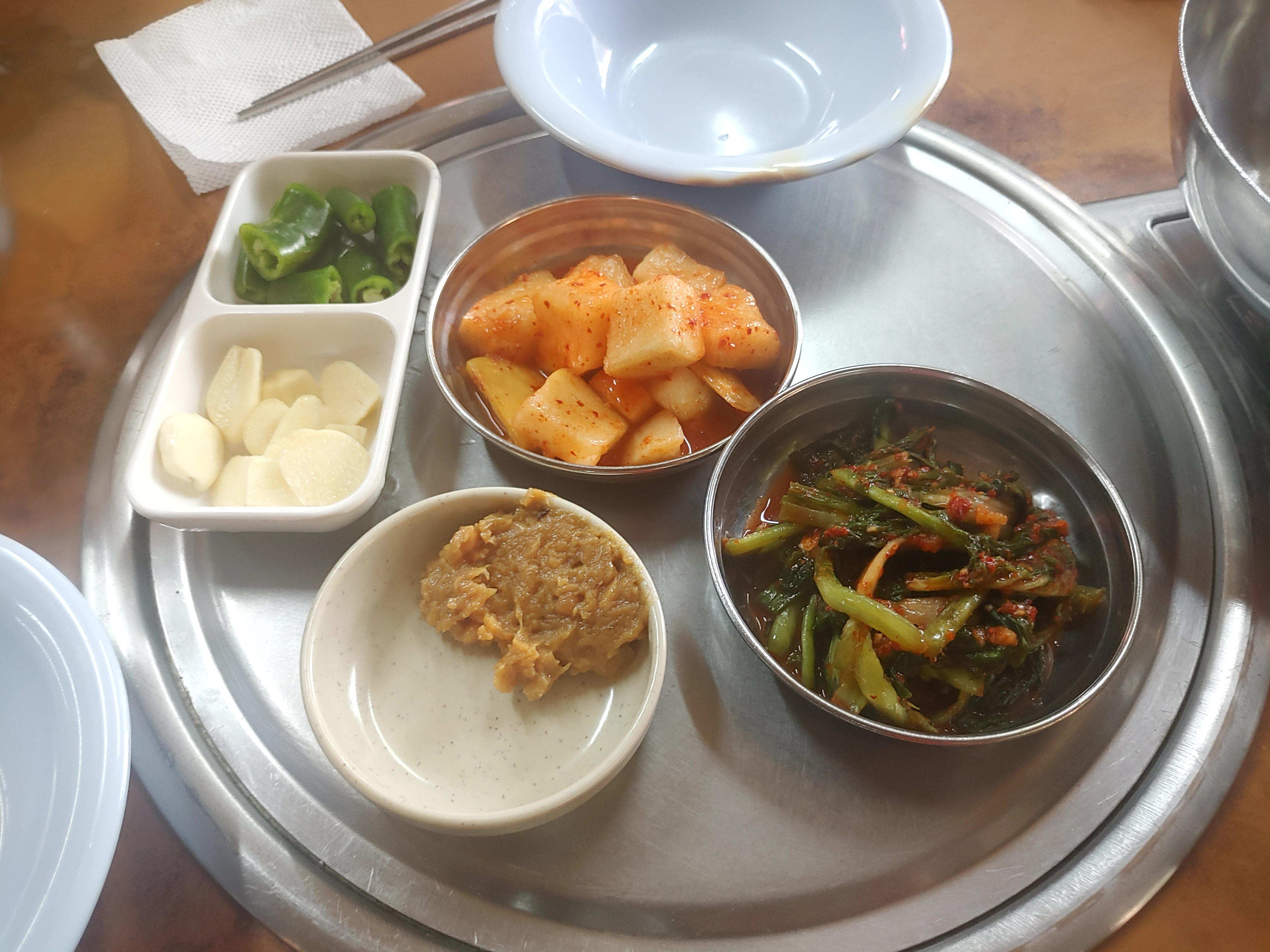 기본찬은 약간 옛날 스타일대로 김치와 깍두기 그리고 된장과 고추, 마늘까지 ㅎㅎ 뼈해장국과 잘 어울리는 기본찬이 나오구요. 된장에 찍어먹는 고추와 마늘도 참 맛있죠 ^^